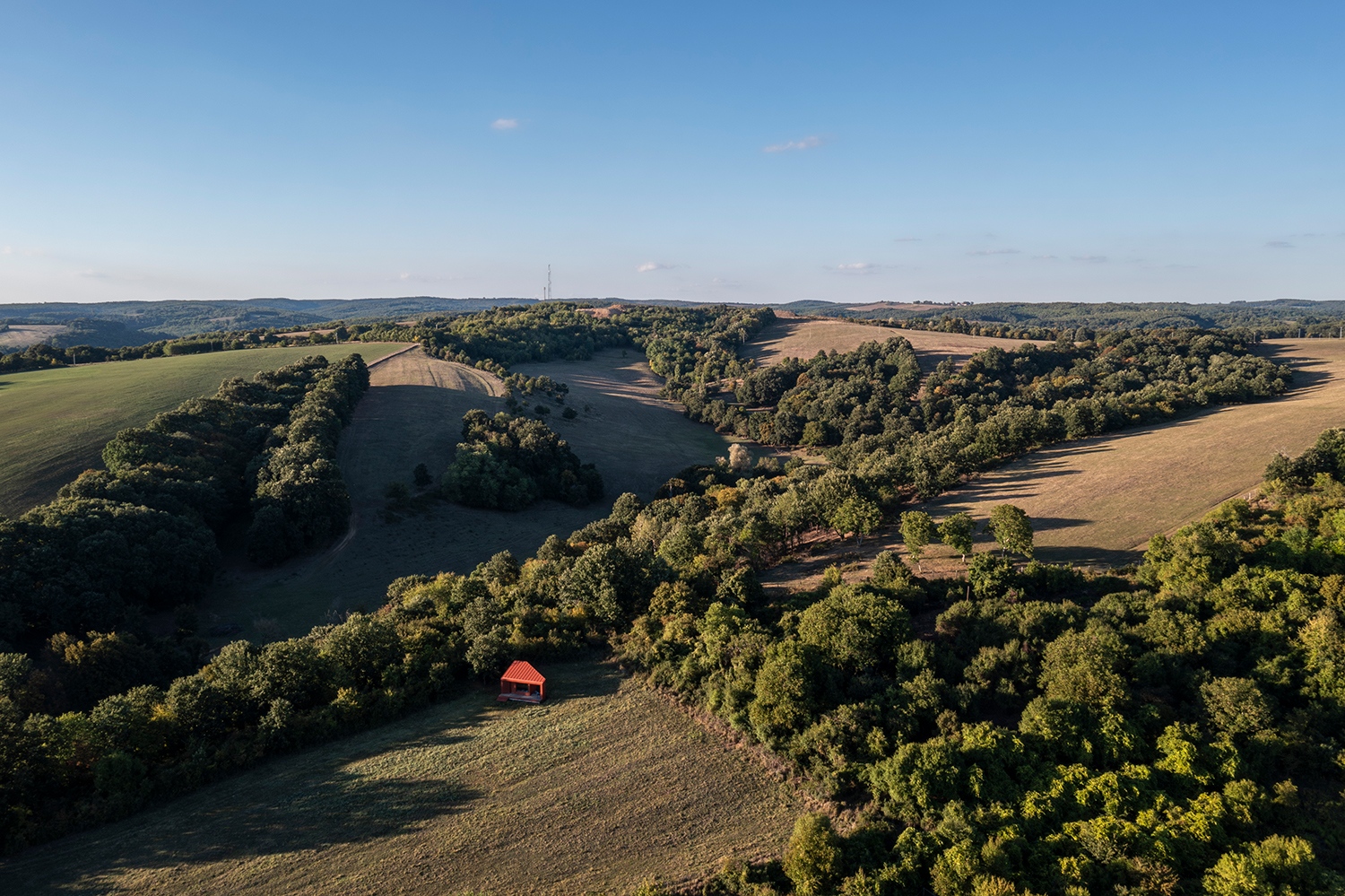 Az építészeti koncepció világosan leolvasható a dombtetőre ültetett építményről. A szoborszerű forma minden irányból más arcot mutat. A festői lankák között, ahol nincs építészeti kontextus, csak a táj szabta meg az építészeti viselkedést, amely eleve erőteret kínált az épületszoborhoz. A telepítést a domborzat egyértelművé tette, a ház felhúzódik az erdő szélére. A tájat beengedik a nagy ablakok, a tornác átvezet a fedett nyitott teraszra, ami két irányból is védett. Az élettér része a ház mögötti tisztás, ahol forró napokon az épület árnyékában lehet létezni. A ház hátrafelé is nyitott, hátulról is látványos és erre a terasz is reagál. A belsőben a funkciók karéj-szerűen szerveződnek a szélke mentén. Négy fő tudja kényelmesen használni a házat, a galérián felül, a lenti térben egy kinyitható kanapén is lehet aludni. A nagy nyílásokat szükség esetén függönyök takarják.