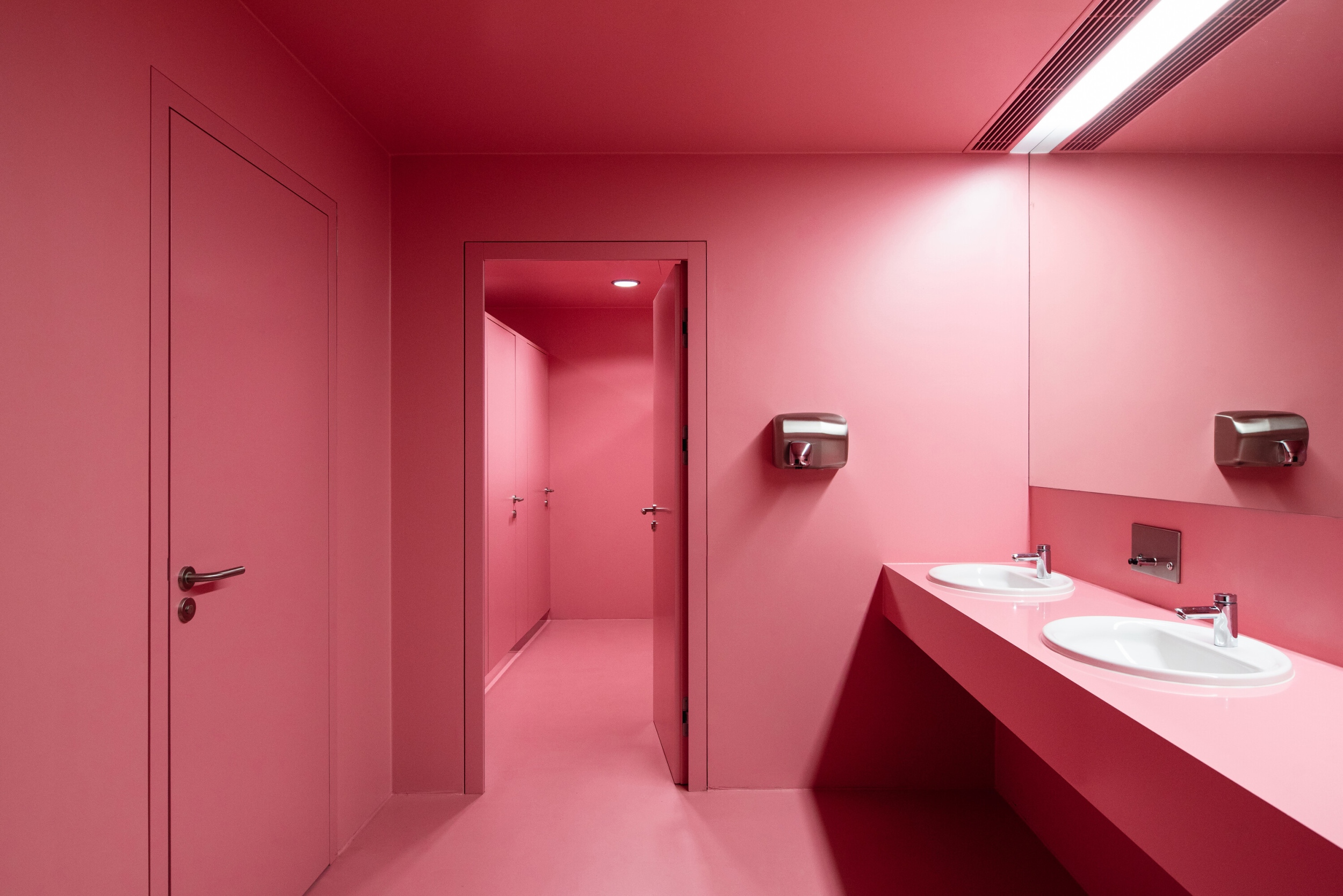 A belsőben használt anyagok futurisztikus jelleget kölcsönöznek a térnek: a látszóbeton, fekete esztrich és a mennyezetet alkotó finom fémrács fehér fa elemekkel és bútorokkal van kombinálva. A tér vizuális fókuszában a variálhatóan elhelyezett, organikus formát mutató narancssárga ülőbútorok uralkodnak.