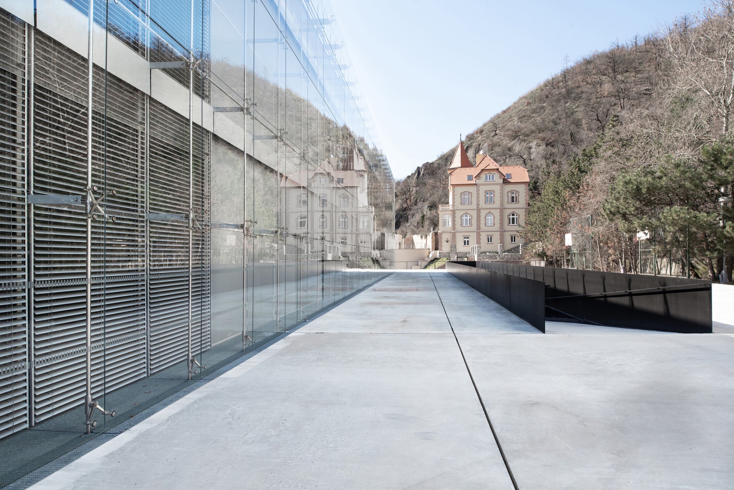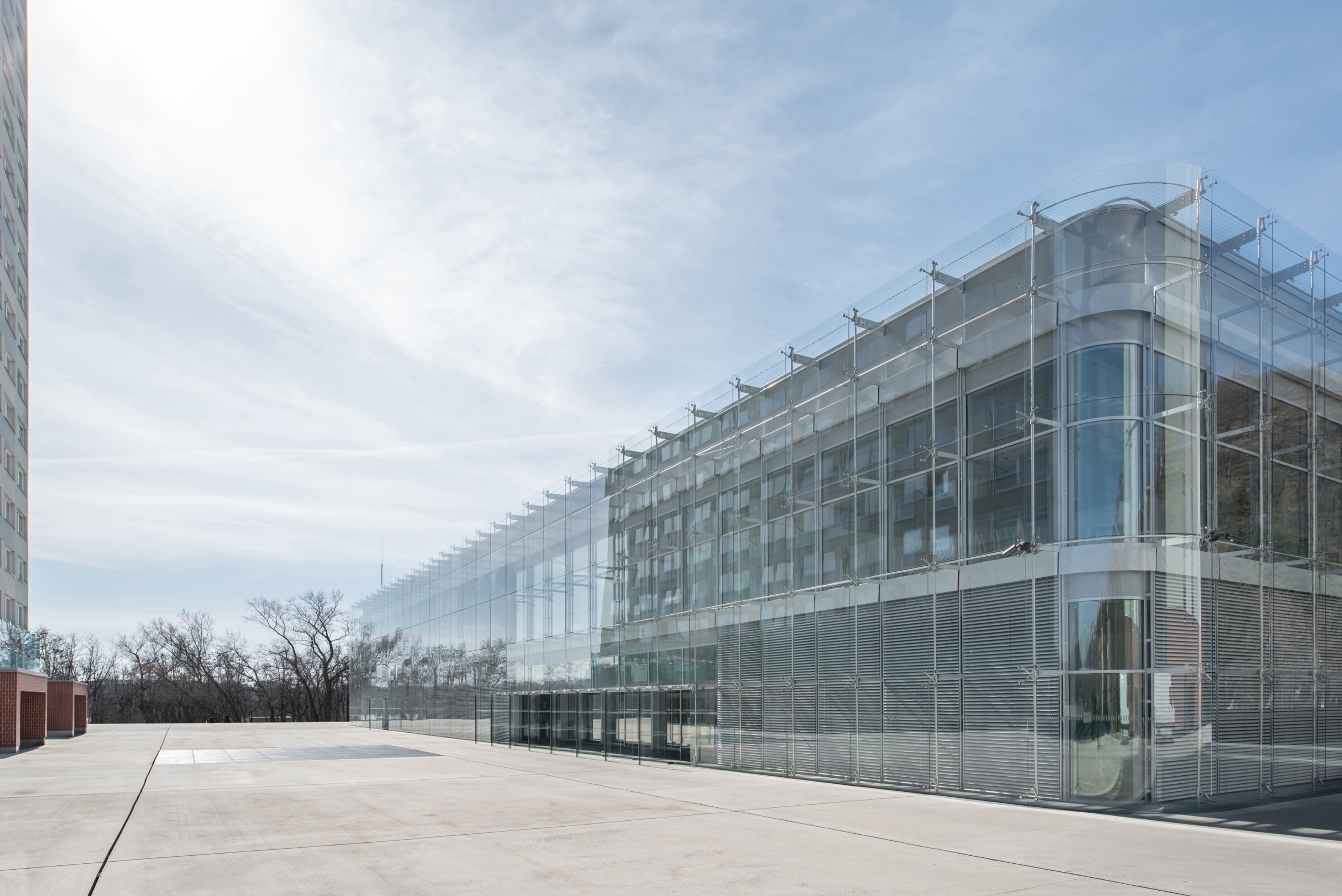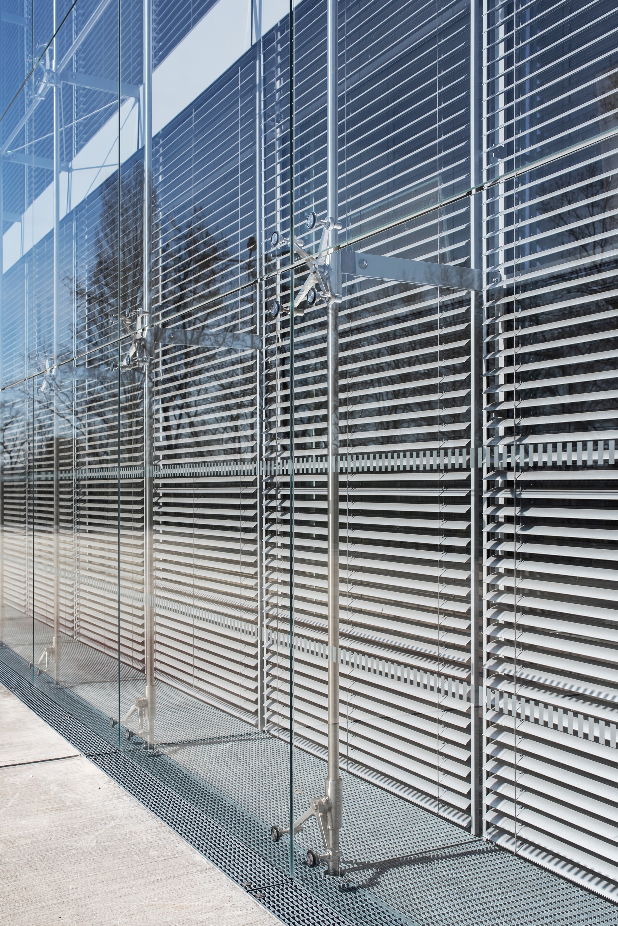 A homlokzat elé épített üvegezett szerkezet elsősorban a közelben futó hatsávos körgyűrű zaja elleni hatékony akusztikai védelmet szolgálja. Ezen felül a kettős héjú homlokzat lehetővé teszi a természetes szellőzést és a belső tér szabályozott árnyékolását. A lekerekített üvegsarkok az eredeti építészeti kialakításra reflektálnak. Az étkezde átalakítása egy nagyobb projekt része, a környezetalakítás a következő építési szakaszban történik.