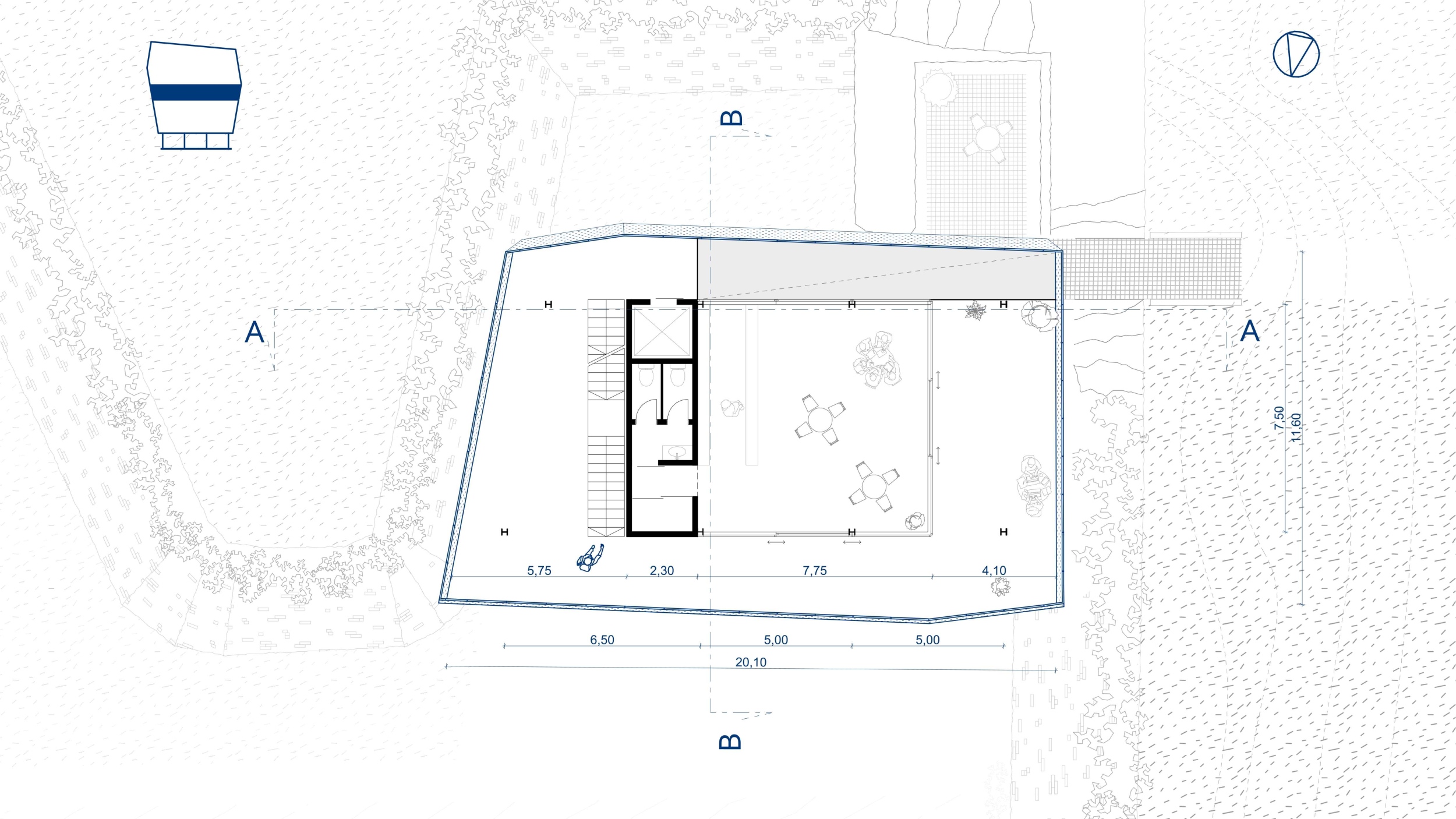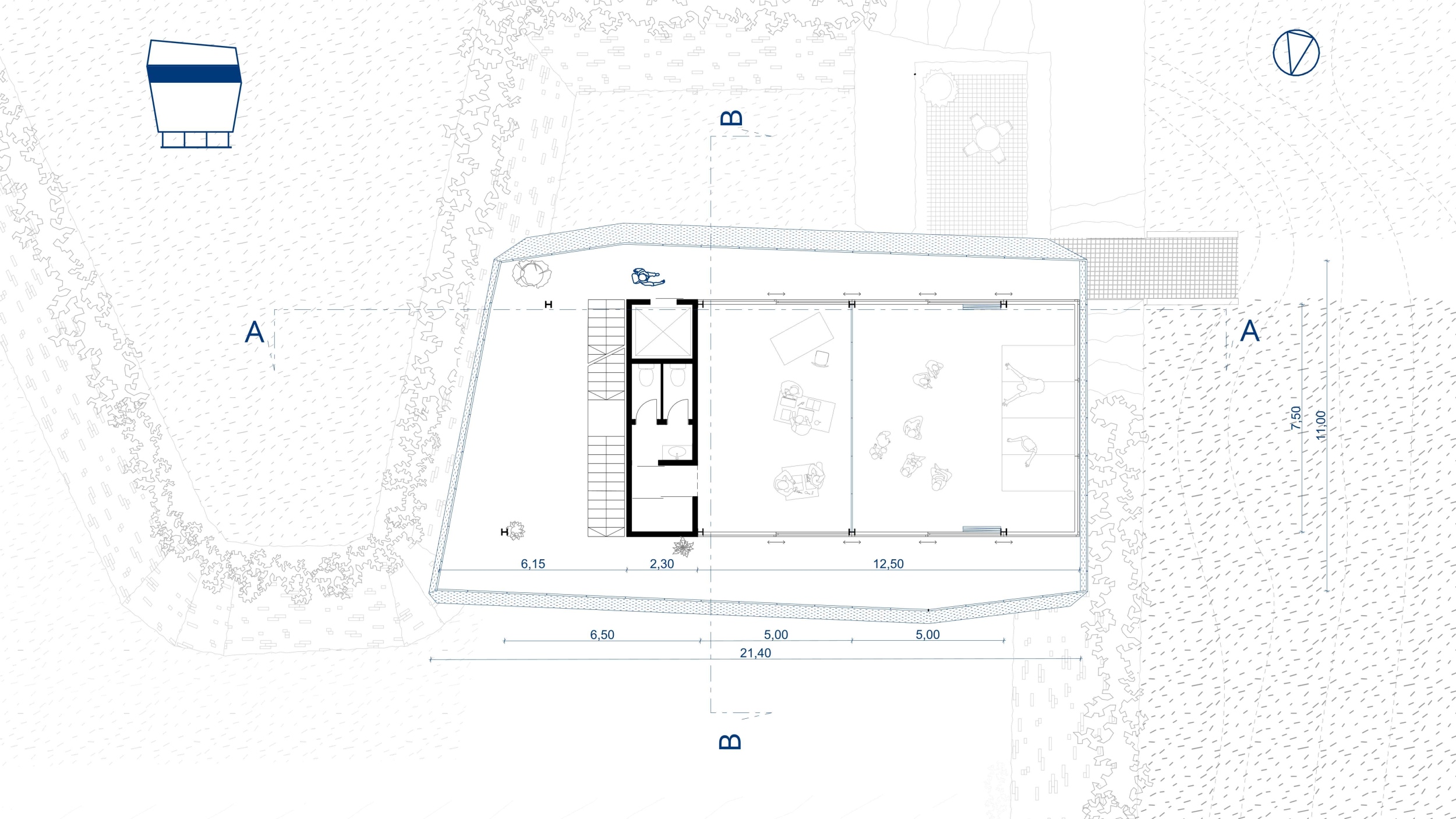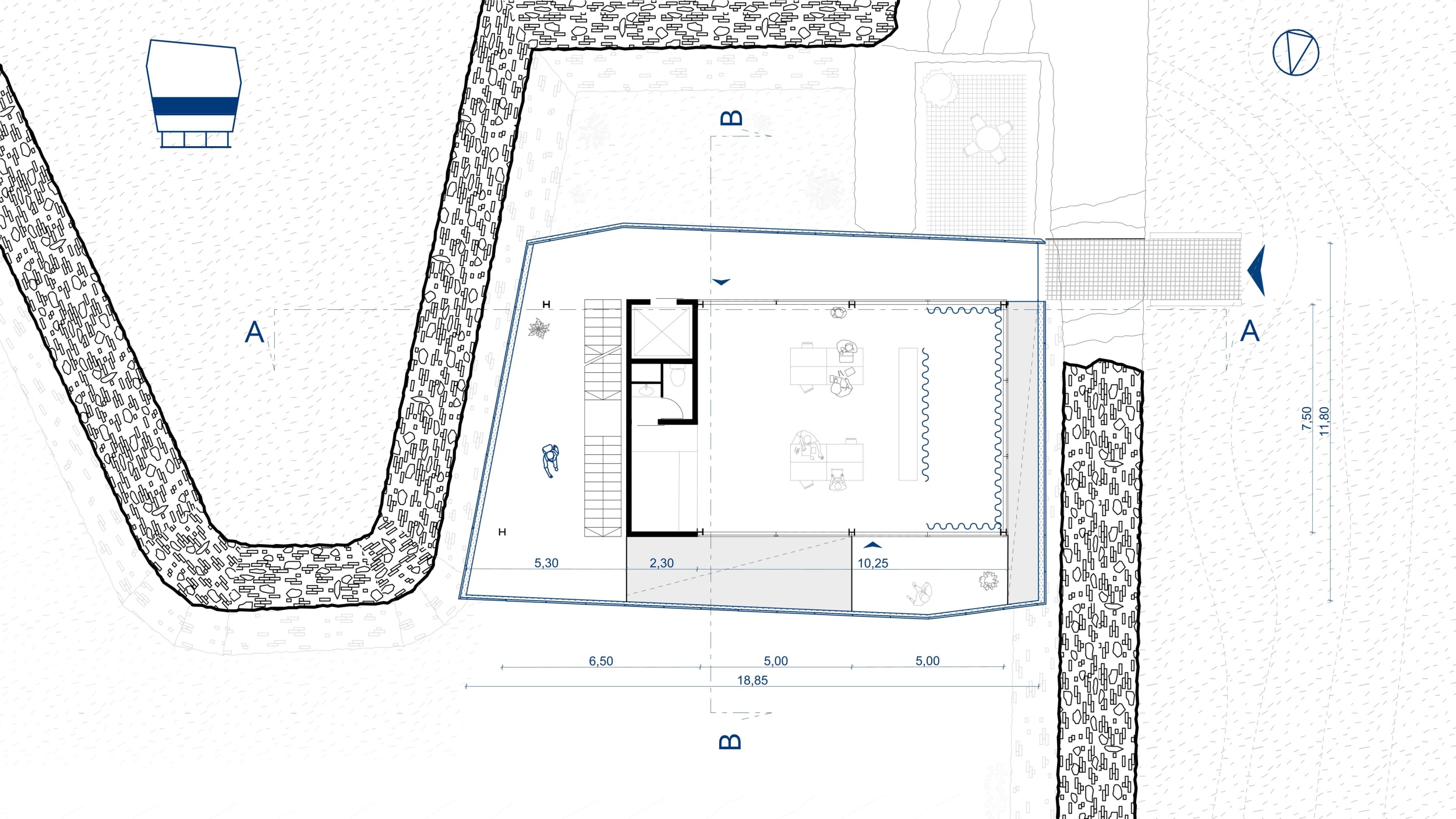 Az öblöt – a tervezett belső kert növényzetének kivételével – meg kell tisztítani, hiszen jelenlegi állapotában a természet uralja. A beépítési hozzáállást követve, minimális mértékű tereprendezést alkalmazok, a vár felől mindössze egyetlen helyen pengefalak szorítják ki az új beérkezéshez szükséges földtömeget.