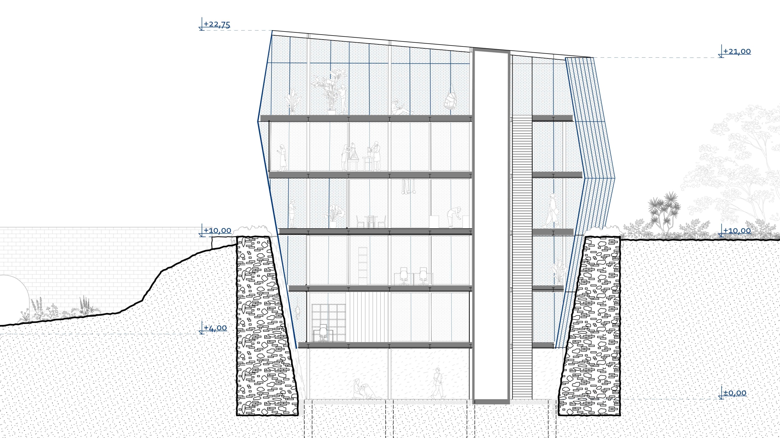 Az eltérő funkciók külön lettek választva, hogy azok ne zavarják egymást. Az épület vertikális térszervezése által egy szinten egy funkció kap helyet. Ezt az elzártságot a nyitott és tágas közlekedő kompenzálja. Néhol egészen megnő a mérete, így másodlagos, fedett-nyitott terek alakulnak ki, amik találkozási pontokként szolgálnak az épületben, ezzel is elősegítve a szociális interakciók létrejöttét. A kávézó is ilyen találkozási pont, hiszen ez szolgálja ki az iroda szinteket is, így itt könnyen tudnak kapcsolódni a létesítményben dolgozók és a vendégek.
