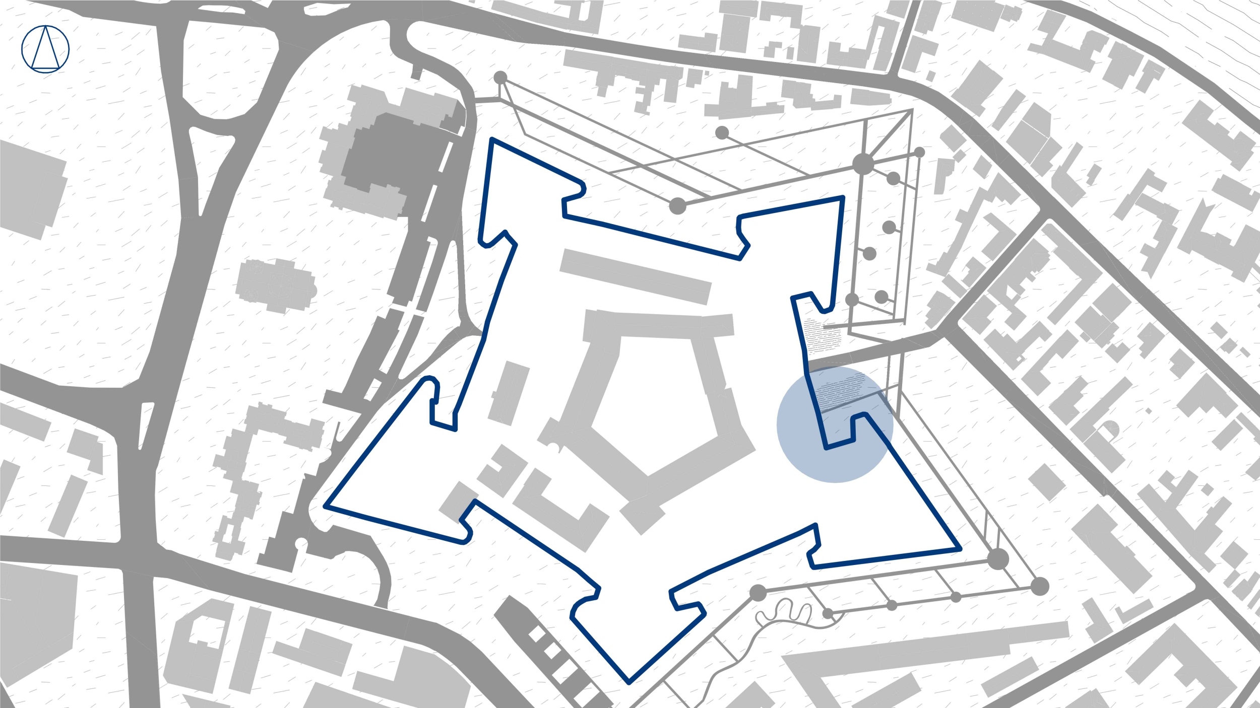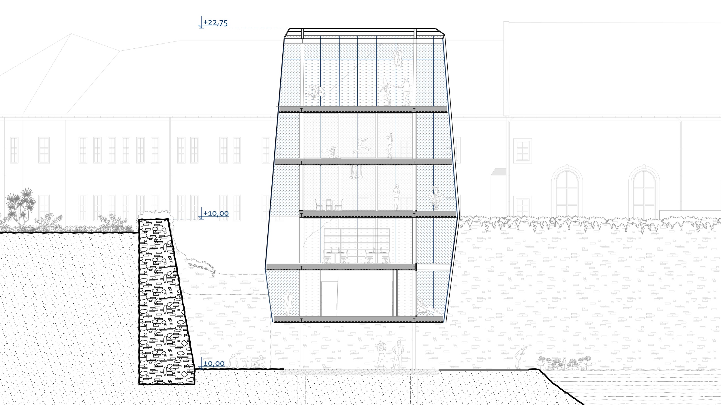 Az épület a várfal által kialakított öblöt lakja be, egy belső udvart hagyva és a földszintet teljesen megnyitva, ezzel megteremtve a várhoz való kapcsolódás lehetőségét. Ugyanezt a várral való kapcsolatot erősíti a vertikális térrendezéssel létrejött közlekedő, ahol a perforált homlokzatburkolat által folyamatos vizuális kapcsolatban vagyunk a várfallal.