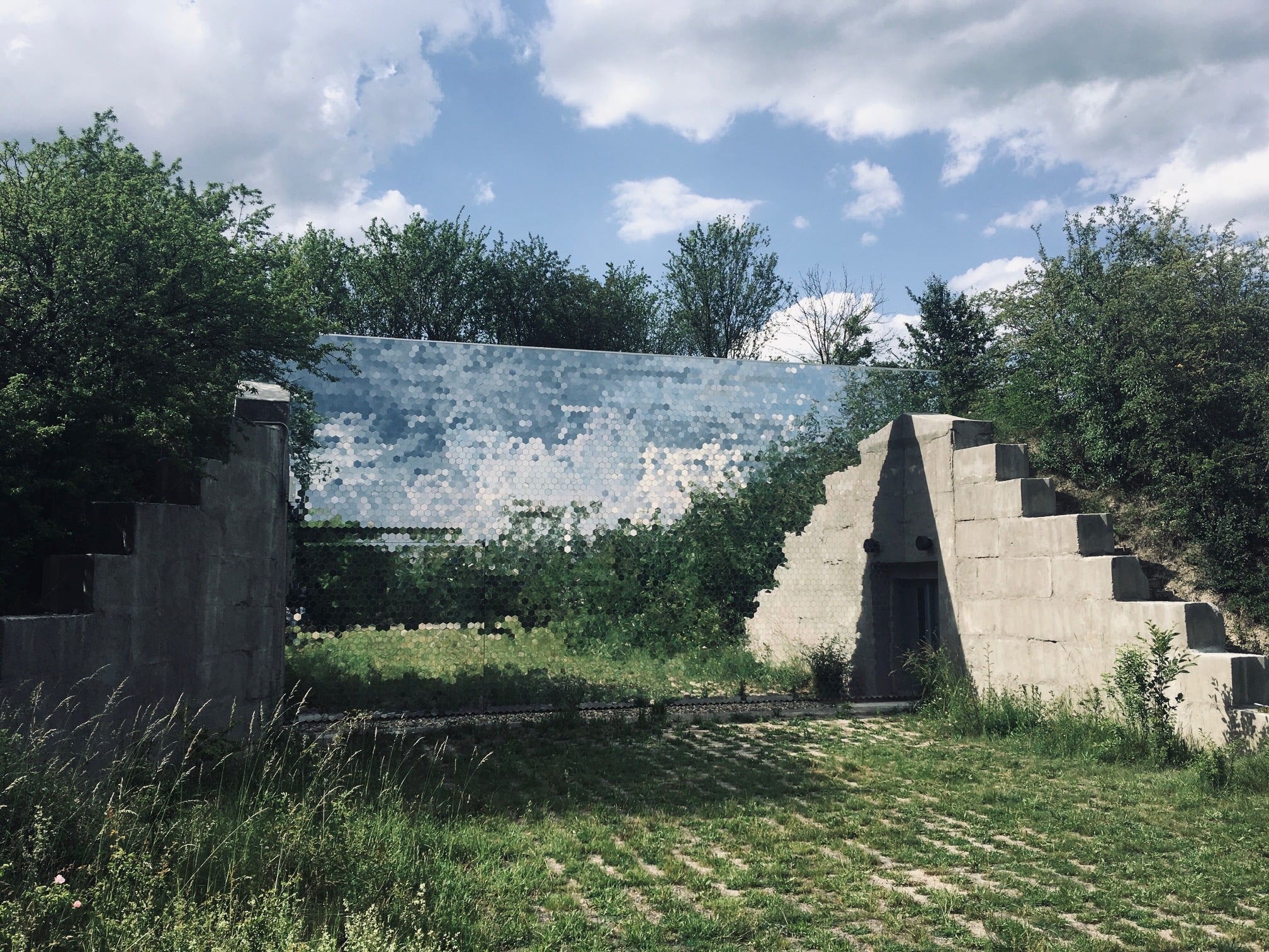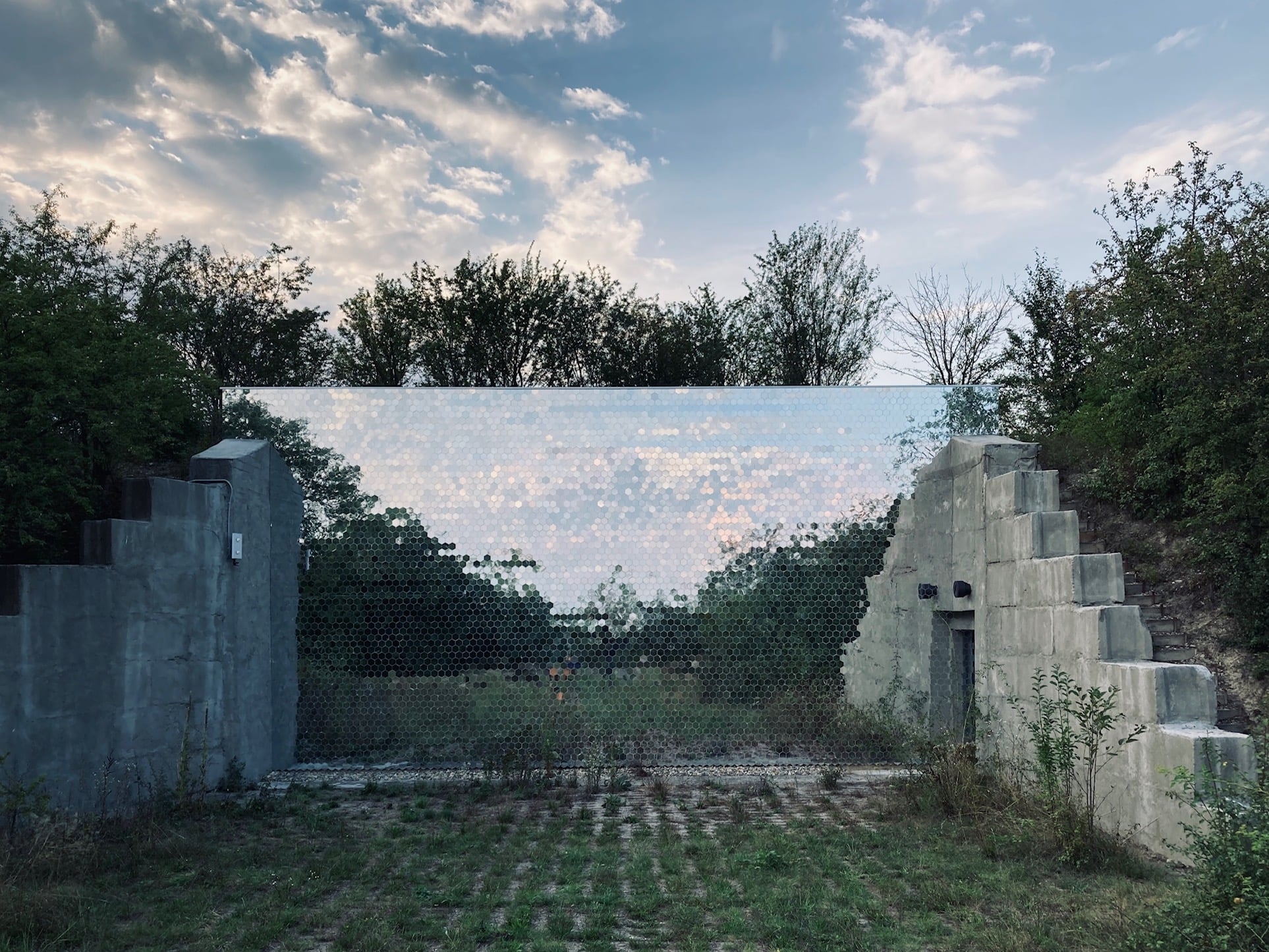 A különleges hatást a tájba épített hatalmas tükörfallal érték el, melynek tükröződései hangsúlyosabbá teszik a természet jelenlétét. A több mint 6 méter magas és 11 méter hosszú tükörfal, mintha egy másik dimenzióba vezető kapu lenne, ami természetesen utal az épület funkciójára. Felülete kis hatszögletű darabokból épül fel, így az előtte állók elmosódott képét tükrözi vissza, ami szintén a múlandóságot juttatja eszünkbe.