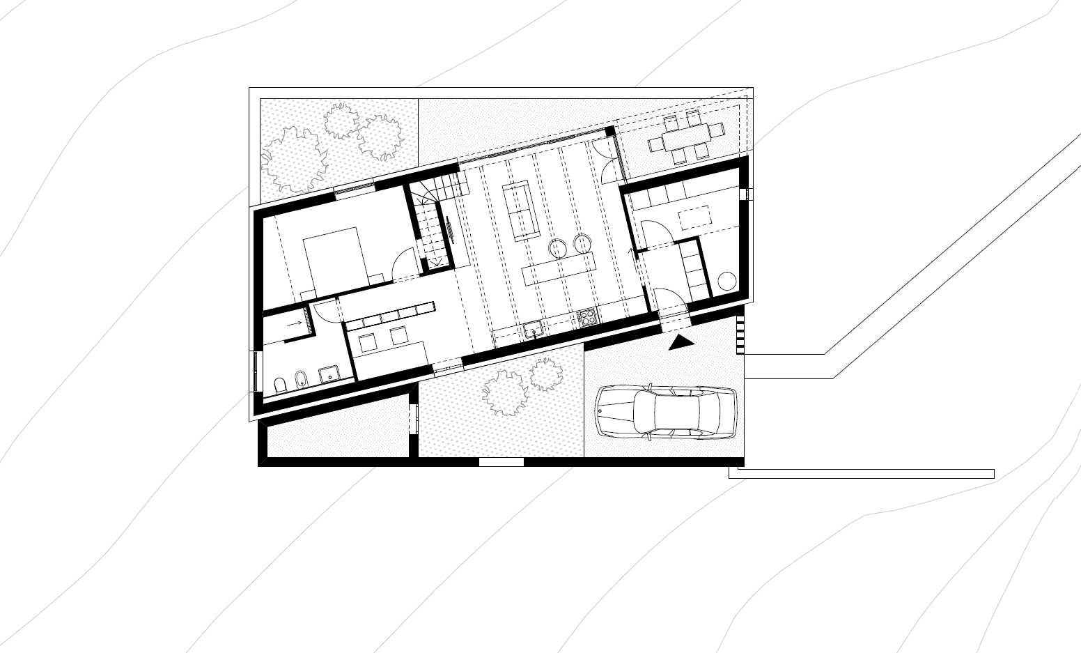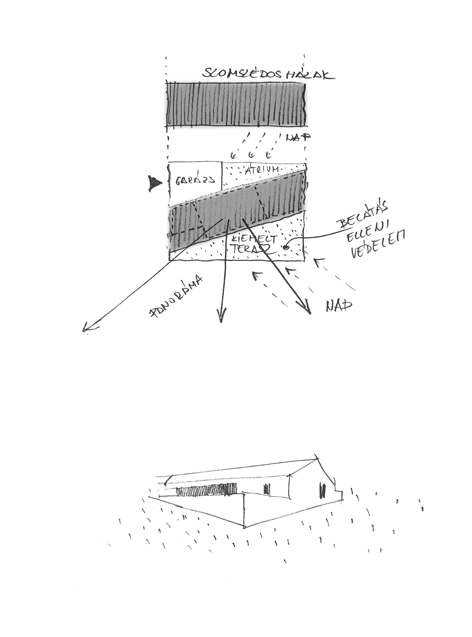 Ez a mozdulat azonban csak úgy érthető meg, ha felfigyelünk az erőteljes terasz(tornác)-épített kerítés és a garázs-külső átrium kontúrvonalának átlójára, egyfajta diagonális helyzetben felszerkeszett főtömegére. A földszinti alaprajz vonalvezetése olyan, mintha egy szinte négyzet alapvetésű házban volna egy másik, keskenyebb „ház”. Mintha egy „lapostetős”, modernista villa és egy hagyományos elrendezésű (hosszú)ház montázsát látnánk. Jeleztem, hogy ez távolról sem öncélú formalista gesztus, hanem az észak-déli irányok és a panoráma felé fordulás gesztusa, miközben a négyzeten belüli derékszögű háromszögek kocsibeállóként és teraszként ízesülhetnek a lakóteret tartalmazó főtömeghez.