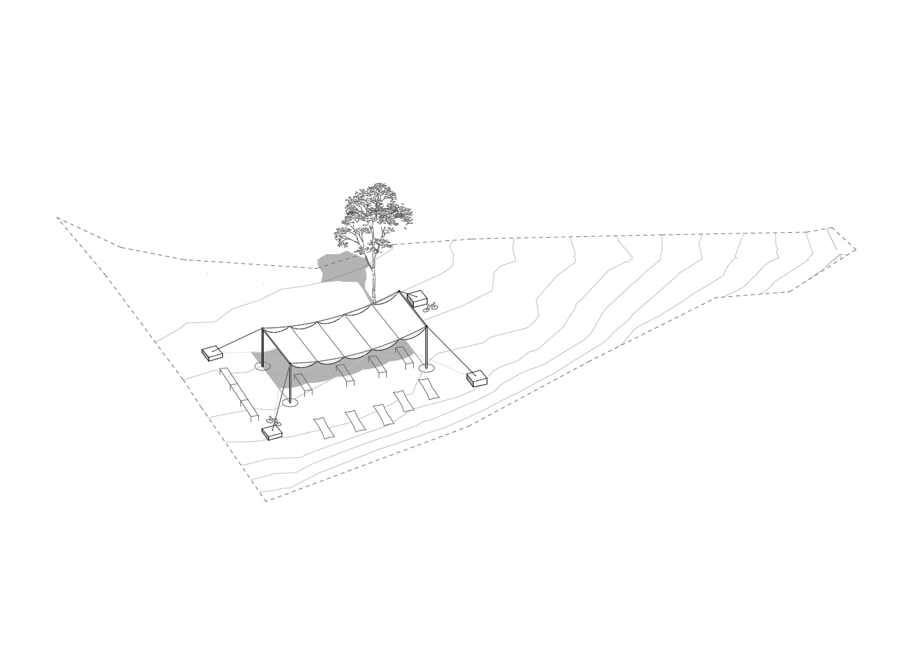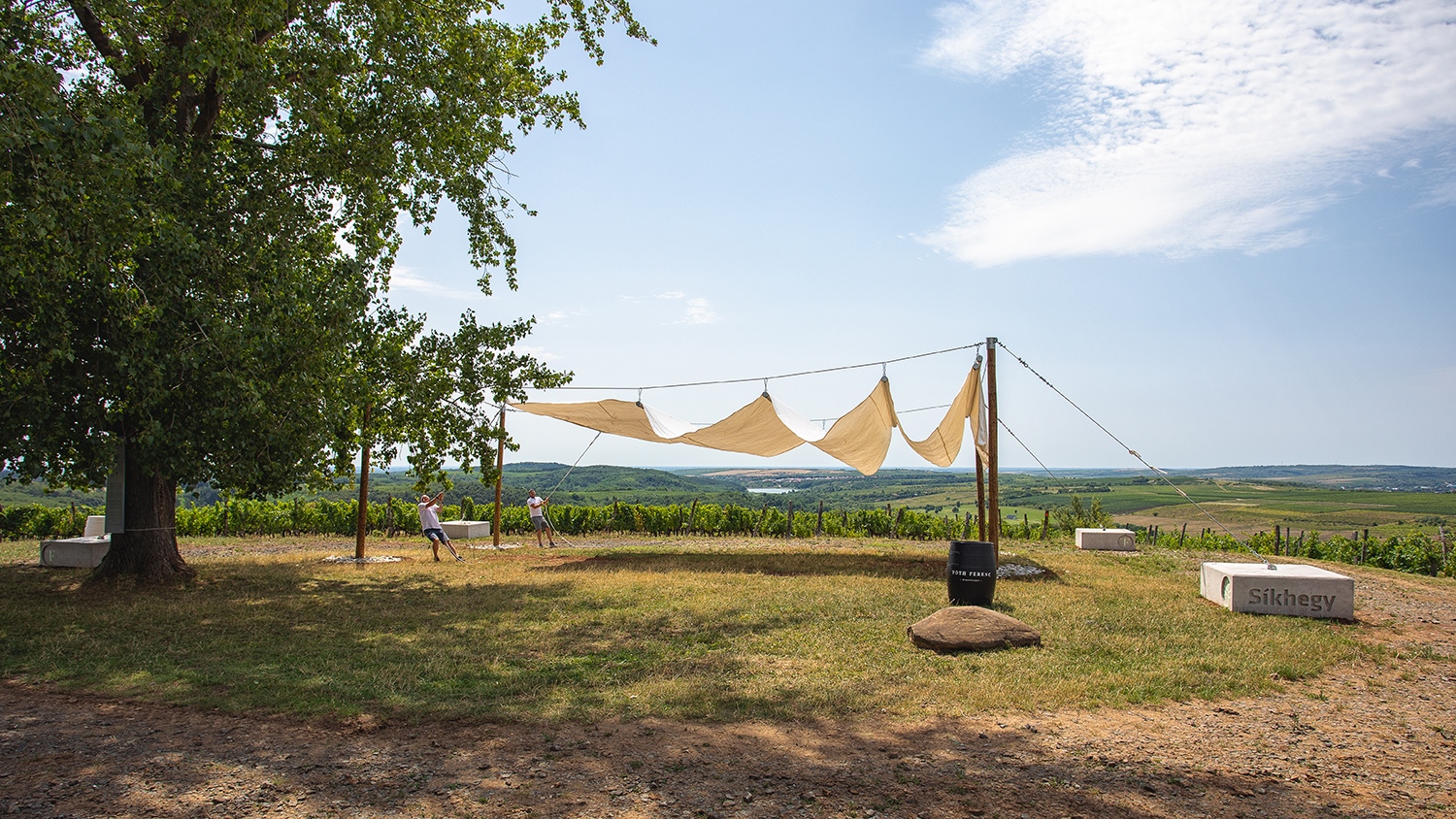 A földúton zötykölődve már messziről kijelöli a helyet egy dombtetőn álló magányos nyárfa. Mintegy ennek a fának az árnyékát terjeszti ki az új szerkezet. Megérkezve, a tető alatt állva nyersfa póznák merednek mellettünk felfelé a nyárfa törzsével párhuzamosan, a feszítőkábelek beton talapzatai sziklákként bukkannak elő a föld alól, a vászon a széltől hullámzik a fejünk felett, a filigrán szerkezet párbeszédbe lép a természettel. A vászon alatt megmaradt a természetes domborzat és az érintetlen növényzet. A tetőnek csak a nap folyamán vándorló árnyéka jelöli ki a pillanatnyi helyet, a természetben való feloldódás élményét nem tompítja a mesterséges burkolatok érzete.