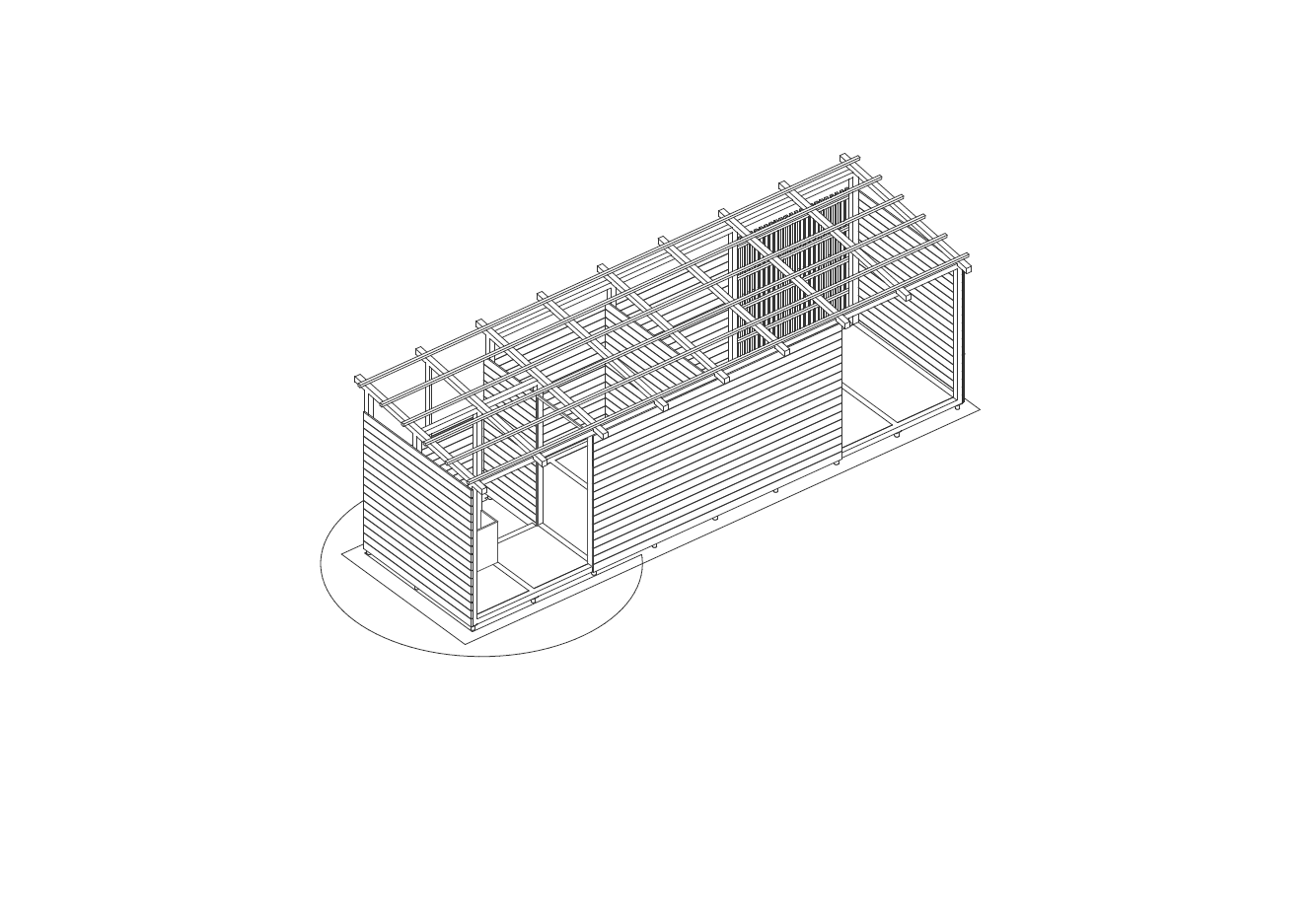 A másik építmény az erdő szélén, visszahúzott helyen áll. A fadoboz magába foglalja a mobil WC-t, a hozzá tartozó előteret, egy piszoárt, illetve egy fedett helyiséget, amely tárolóként és egy hirtelen érkező nyári zivatar elől védett térként is funkcionál. Tervezés során vizsgáltuk a komposzt WC kialakítását, de annak működtetése a rendezvénnyel összeegyeztethetetlennek látszott, ezért csak a kézmosó és a piszoár lett szalmabálába vezetve, a mobil WC-t végül nem tudtuk elkerülni. A berendezések kiválasztását a célszerűség vezette, például a kézmosótál egy boltokban kapható magaságyás. A felmerülő komfortigényeket kiszolgálja az infrastruktúra, viszont a rendezvények indulásakor kialakult tábori hangulat továbbra is megmaradt.