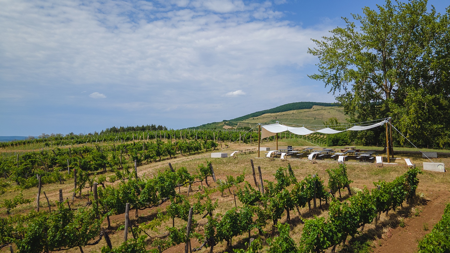 Az egri borvidéken járunk. Sok borászat a palackozott borok eladása mellett borkóstolókat szervez vagy saját vendégteret üzemeltet. Ezzel kiegészül a borászatok portfóliója is. A pincészetek, boraik minőségén túl, nagy hangsúlyt fektetnek a vendéglátó tereikre is. A Tóth Ferenc Pincészet is ezt a tábort erősíti, már jó ideje szervez piknikeket a Síkhegyen lévő dűlőjükre. Havonta egy alkalommal, ideiglenes bútorzattal kitelepülve fogadnak itt vendégeket. A rendezvények sikere teremtette meg számunkra a tervezési feladatot. Azzal kerestek meg minket, hogy a sokféle és ideiglenes megoldások helyett segítsünk megfogalmazni egy átgondolt, állandó építményt. Az így meghatározott igények is minimálisak maradtak: legyen árnyék a nap elől, legyen védelem az esőtől, a mobil WC egészüljön ki előtérrel.