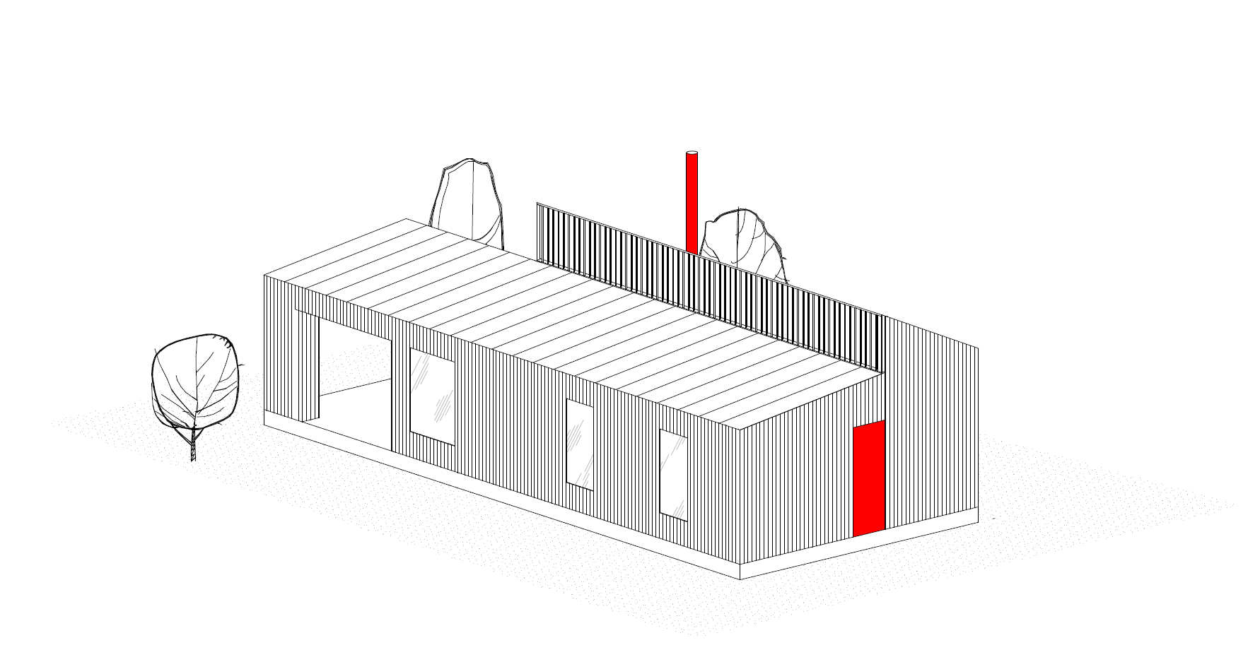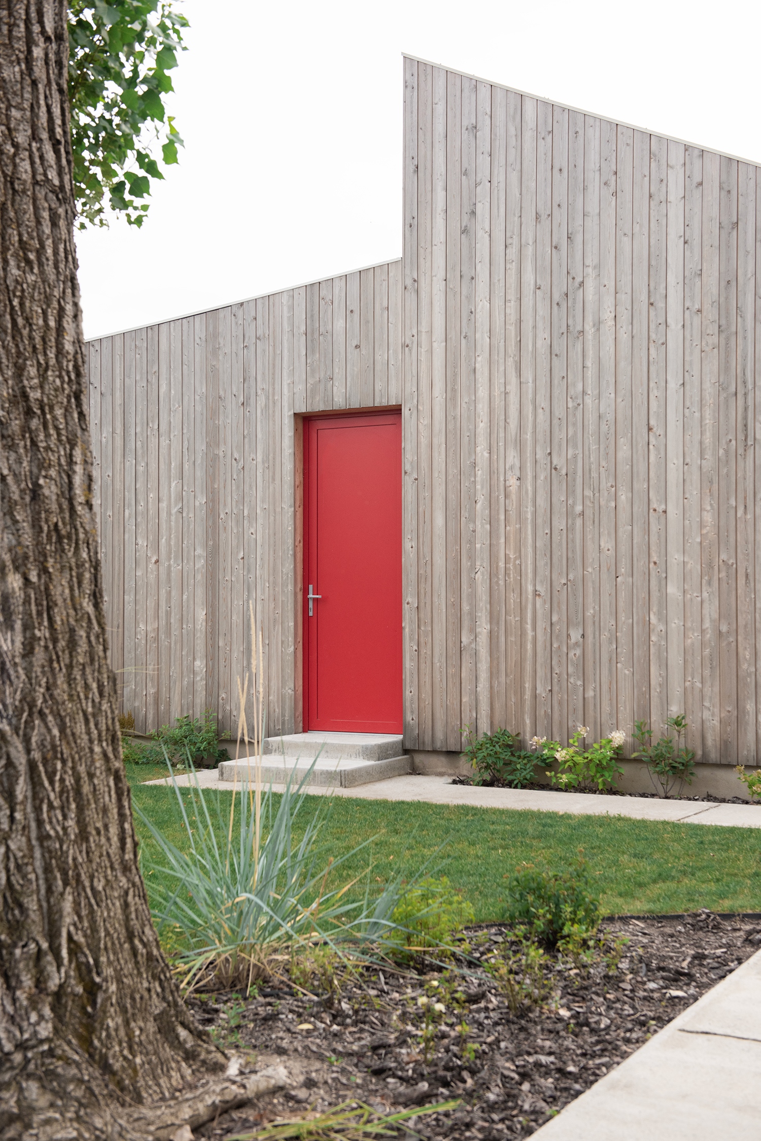 A két modulból álló, eltolt félnyeregtetőkkel fedett épület oldott térkapcsolatokat eredményezett. Az eltolt tetőkialakítással bevilágítók sora jöhetett létre – finom az a ritmusváltás, ahogy a külsőn, a bevilágítók előtt 45 fokban lamellaszerűen fel-/megnyílik a zárt, sűrű vörösfenyő-lécezés. A megrendelő nyitott volt a nem szokványos tömb- és térkialakításokra, engedett a tervezői elképzeléseknek, sőt ahogy Ritától megtudom, maga is karakteres elemmel érkezett: „már az elején azt kérte tőlem, hogy ez legyen AZ a piros ajtós ház!” Ez a legerősebb jel a házon, ami aztán párt követelt magának, így kapott a piros ajtós ház piros kéményt az oldalhomlokzatra.