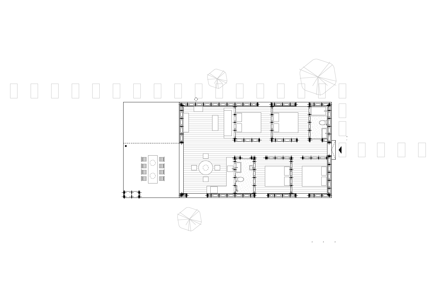 Így találkoztam azzal a megrendelőmmel, akinek végül ezt a házat megterveztük és kiviteleztettük” – meséli a találkozásról Rita. Végül a megbízás nem kubusos, nem típusházat, de könnyűszerkezetes rendszerű épületet eredményezett. Olyat, amiben sikerült racionalizálni a privát és a közösségi terek arányát – lásd az alaprajzot, 90 négyzetméteren négy hálószobát, két fürdőt és egy nyitott konyhát-nappalit sikerült elhelyezni. Vagy ahogy Rita fogalmazta meg: „ez a terv illeszkedett ahhoz a tervezői elképzelésemhez, hogy találjuk meg a minimálisan szükséges megoldást.”