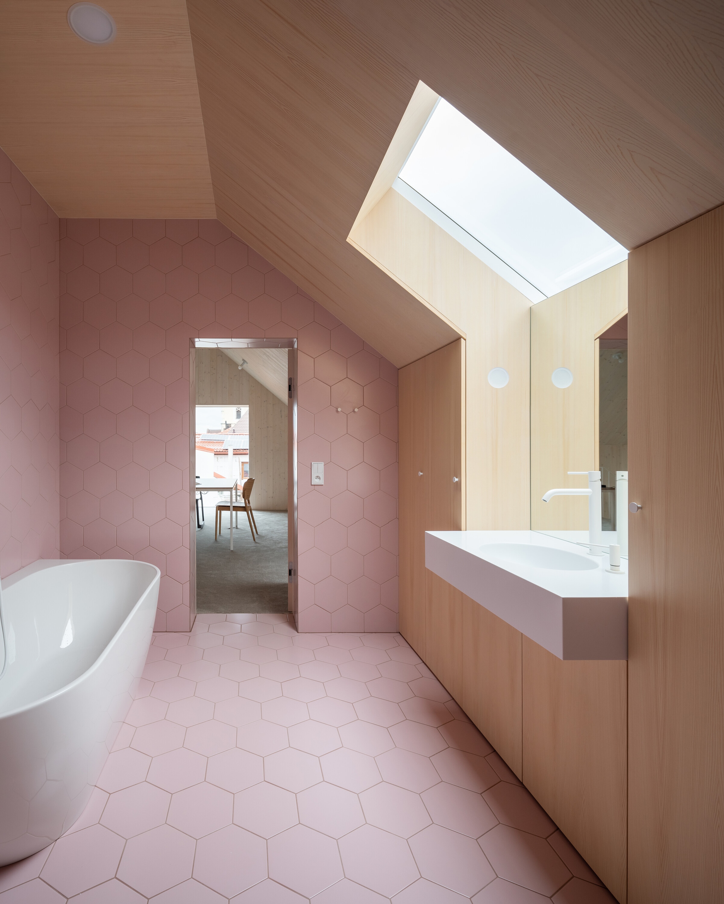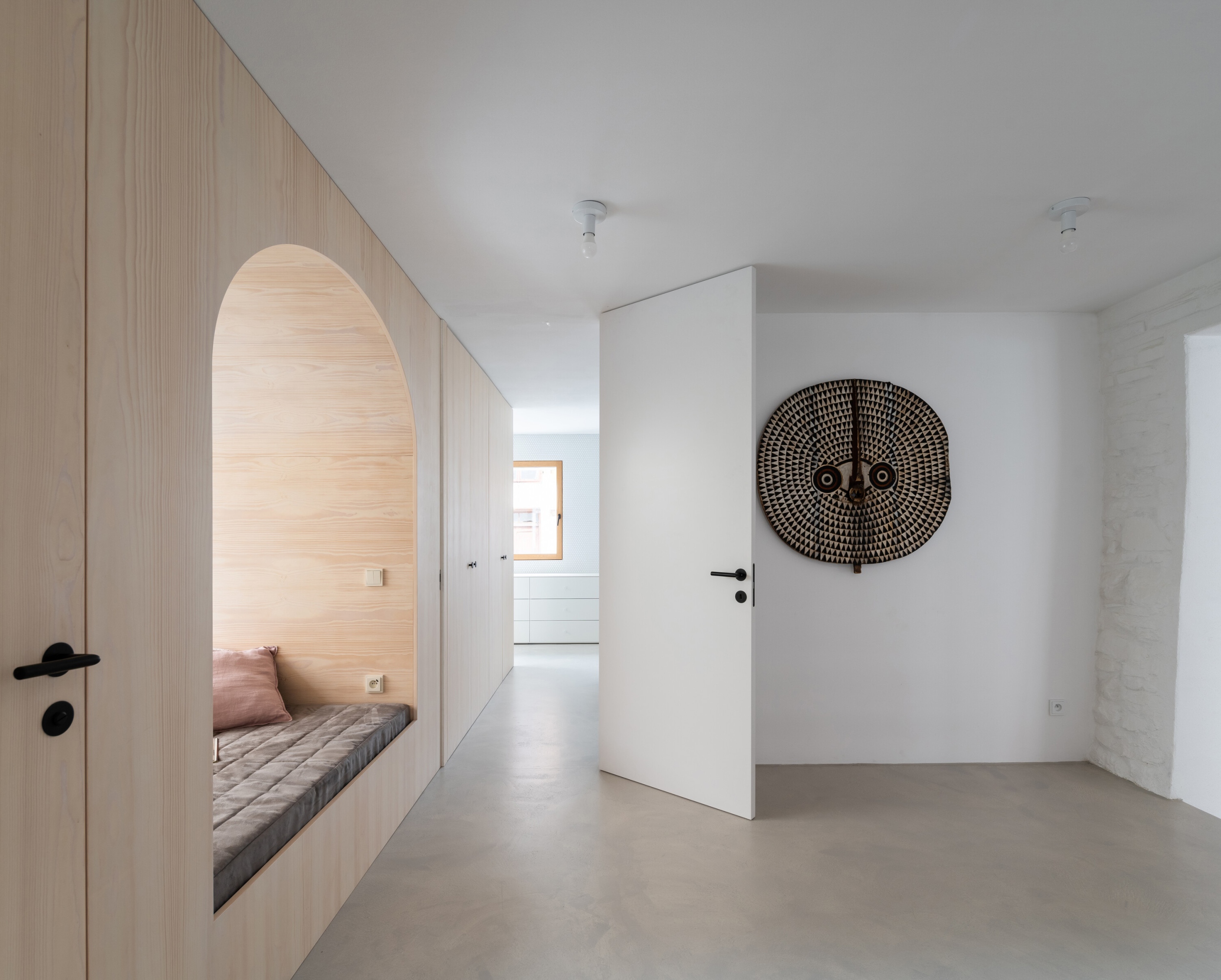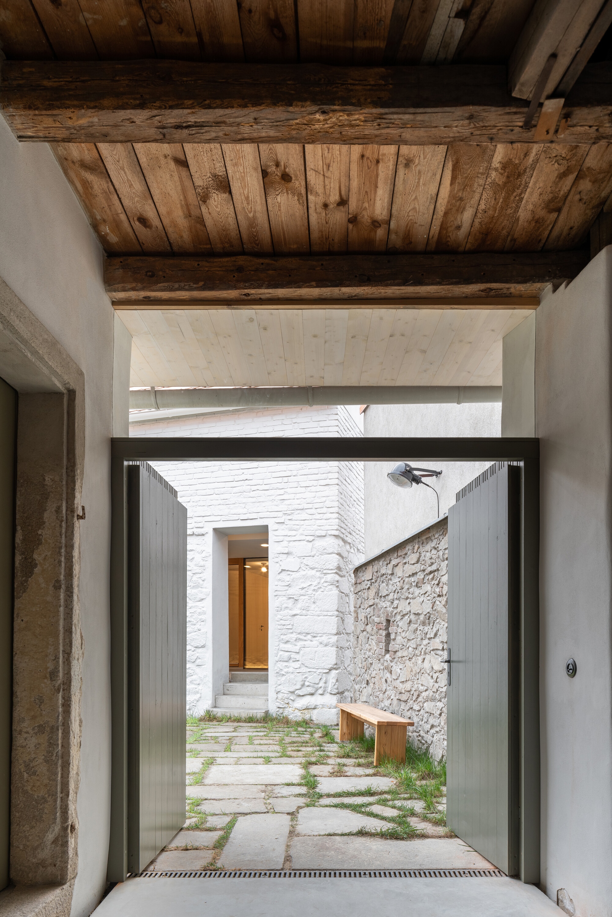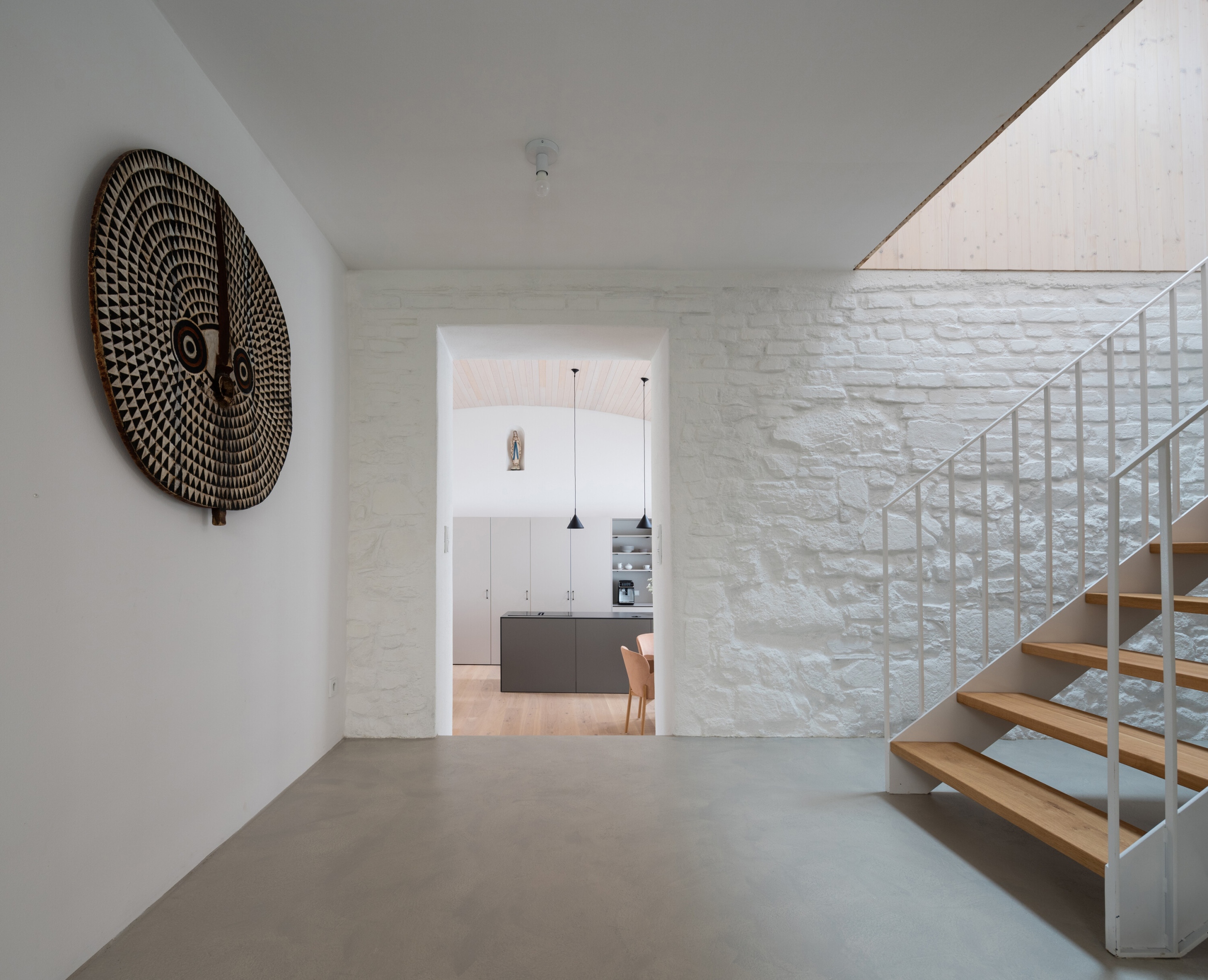 A két épület közül az egyiket a kétezres években a korszak meglehetősen igénytelen stílusában felújították, a másik nagyon rossz állapotban volt. A felújítás során minden utólagos, idegen hozzátételtől – téglaburkolattól, erkélytől, műanyag ablakoktól – megtisztították a házakat. Az eredeti tömeget és léptéket tiszteletben tartva a talált elemeket, például a téglaburkolat alól előbukkanó kőfalat helyreállították. Az új nyílások egyszerűek, és karakteresen különböznek az osztott eredeti ablakoktól.