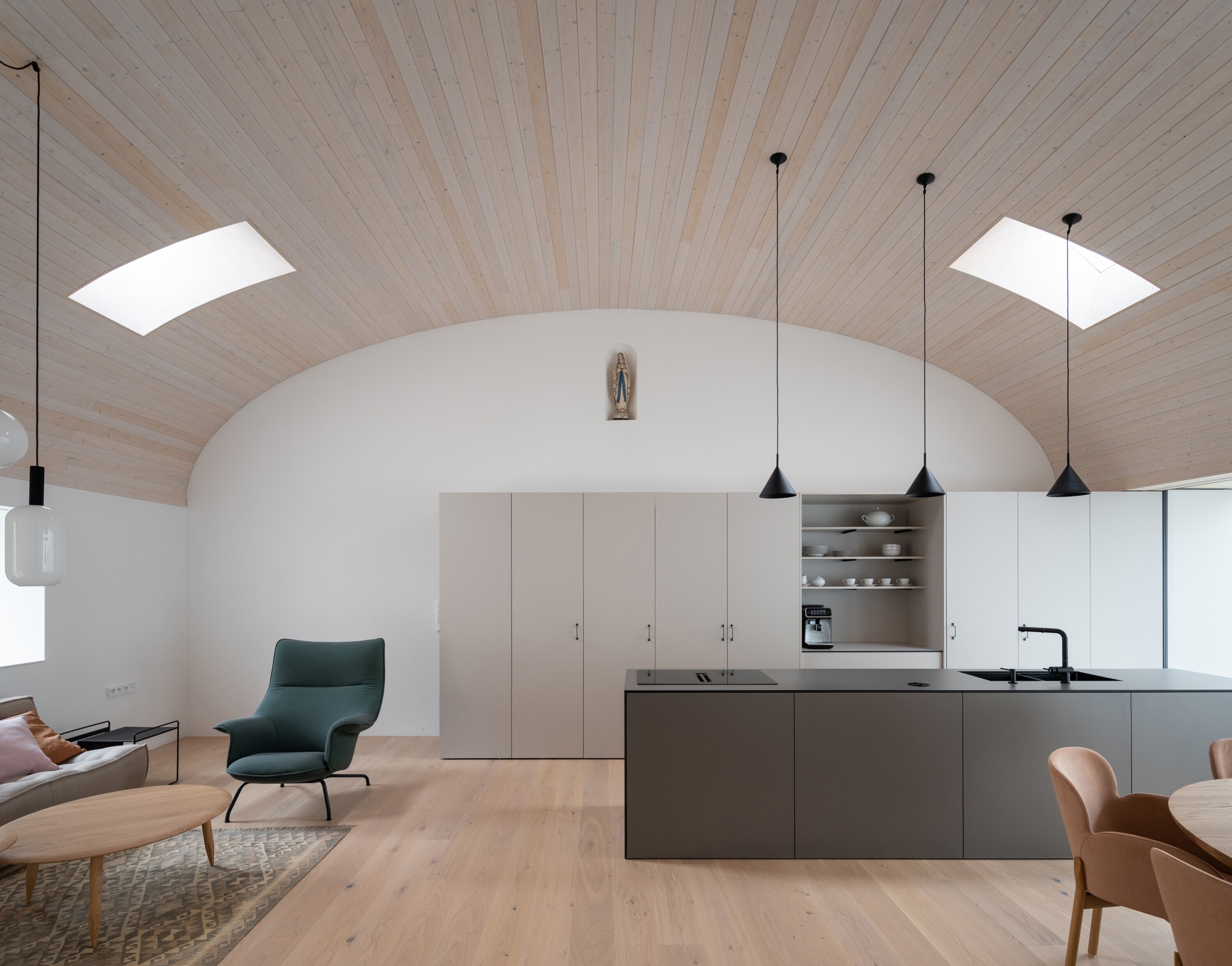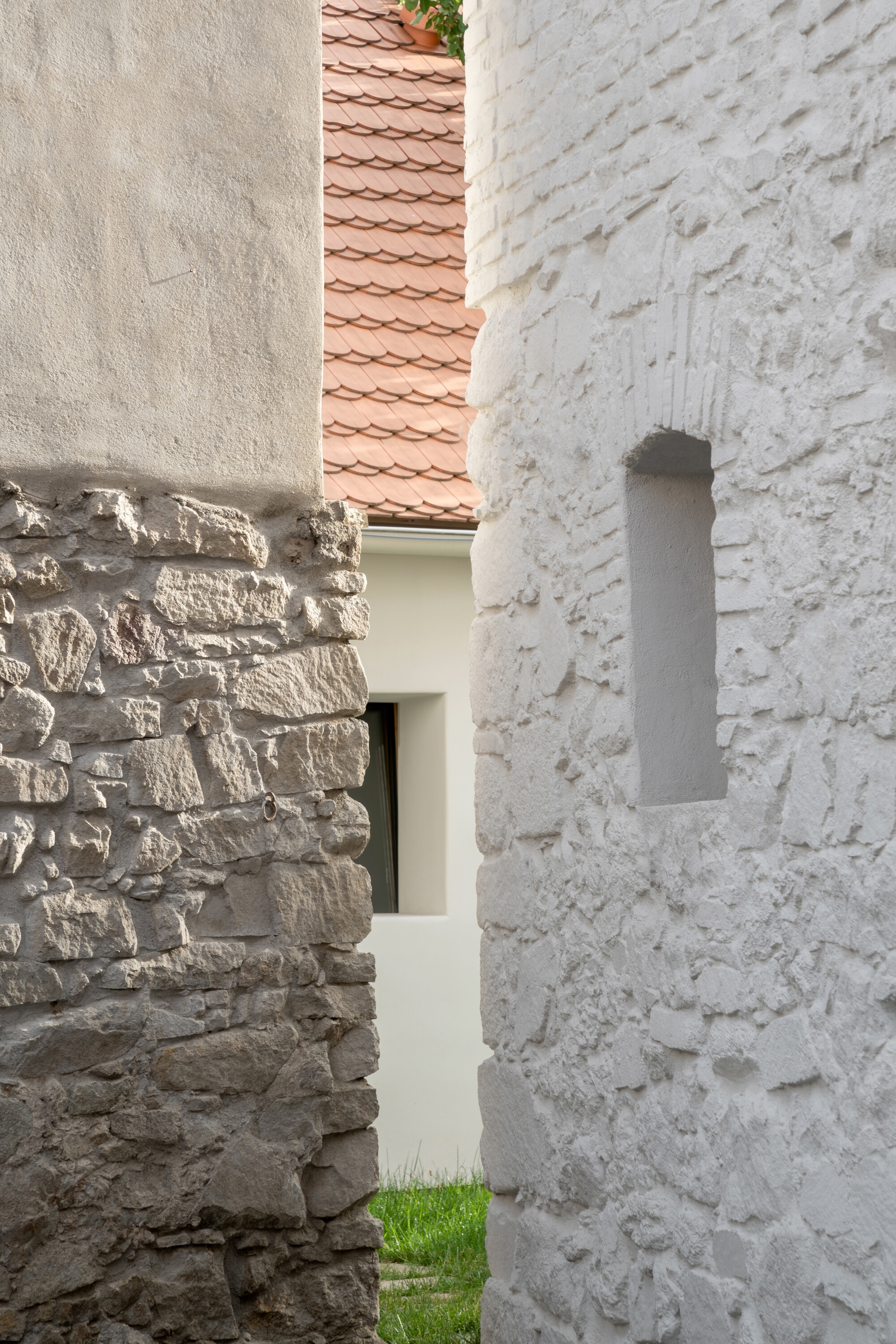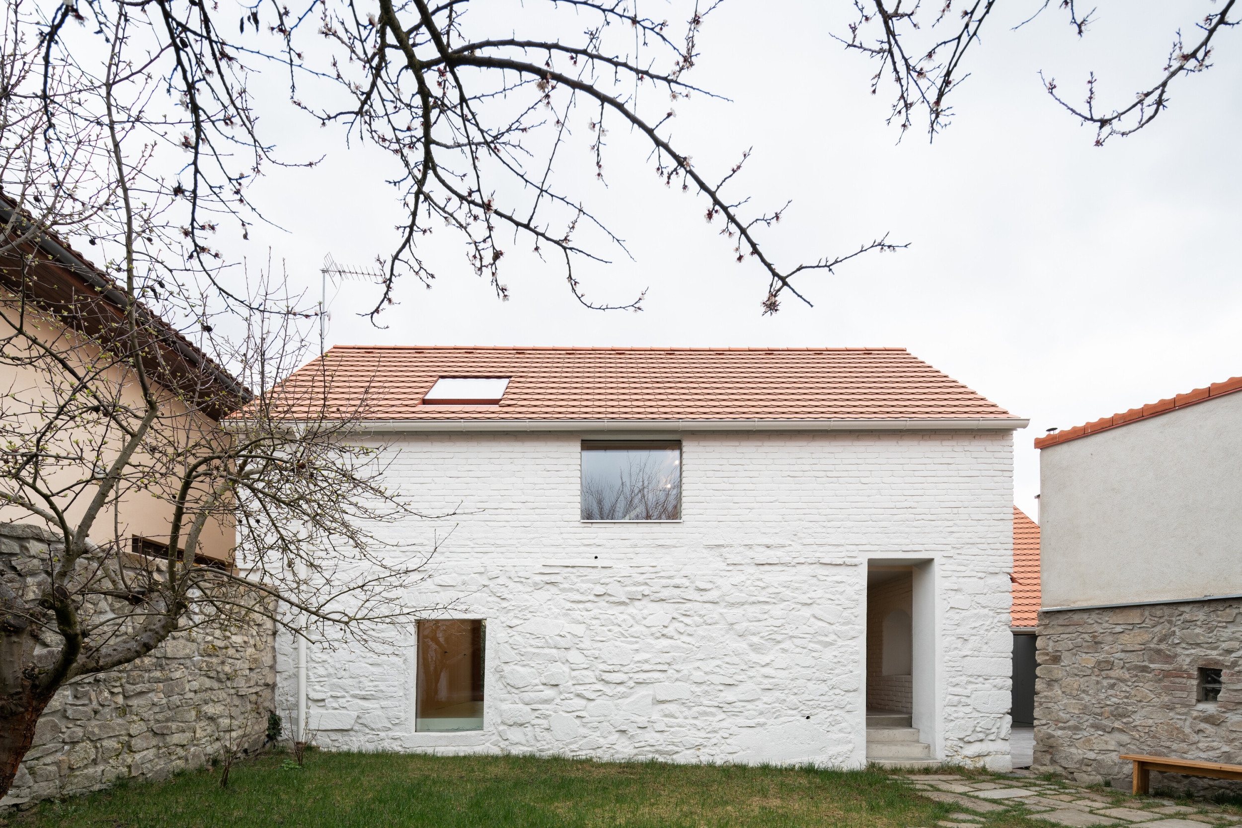 A nagyobb, újabb házban vannak a lakóhelyiségek, földszinten a közös helyiségek és a szülők-, a tetőtérben a gyerekek lakrésze. A nappalihoz kapcsolódó intim teraszról izgalmas átlátás nyílik az udvar további részébe. Az udvar túlsó végében álló, régebbi épületbe került a garázs és a műhely. A tetőtéri oromzaton kialakított új, nagy nyílás a városka templomtornyára néz. A belső tér éke a boltozatos konyha-étkező-nappali, ahol a dongát belülről faburkolat borítja. A boltozat alá került háló-olvasó kuckó erre rímel. Bár korban és stílusban különböző épületek alkotnak a két telken új otthont, a közös tervezői szemlélet egységbe olvasztotta őket.