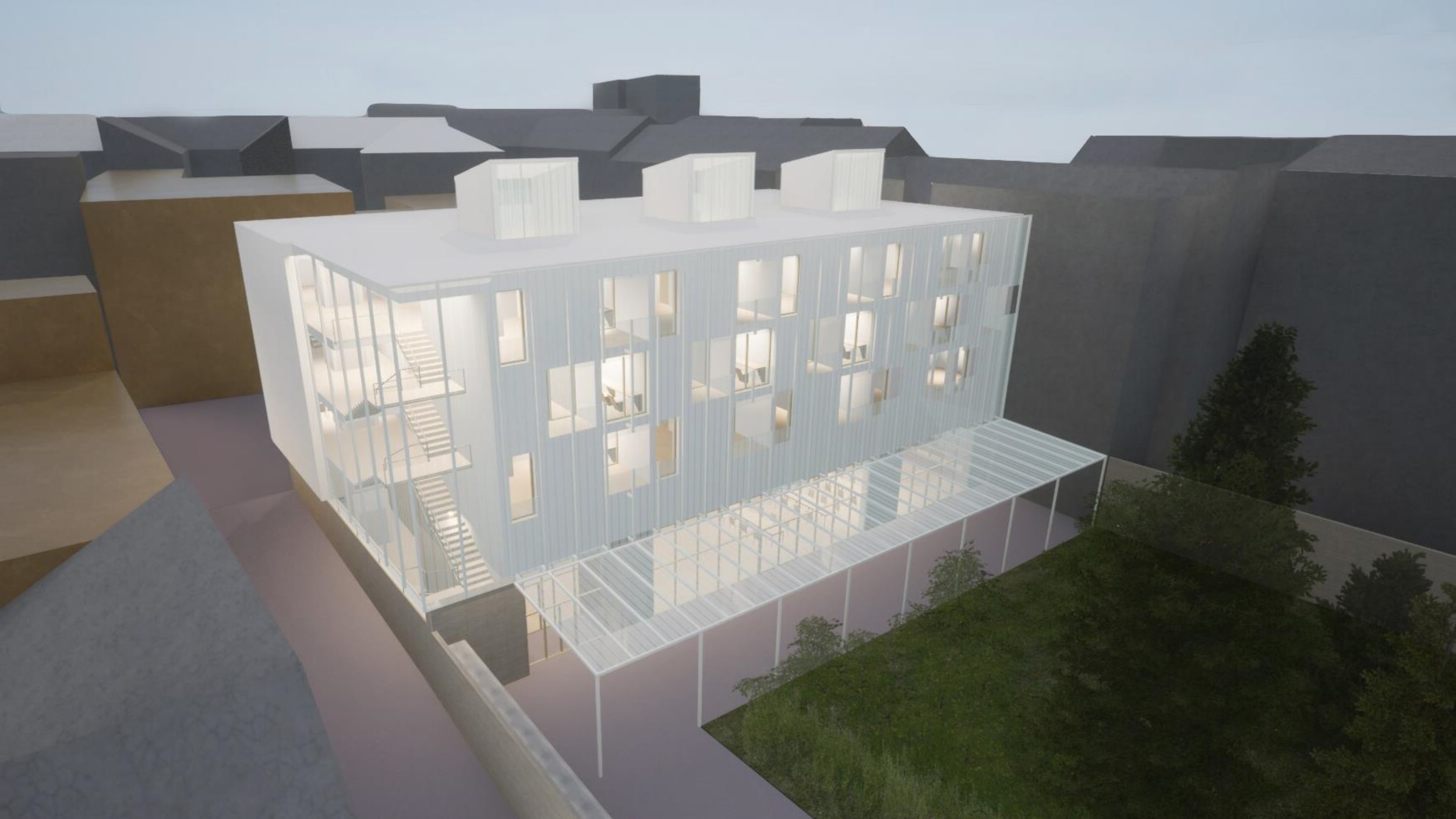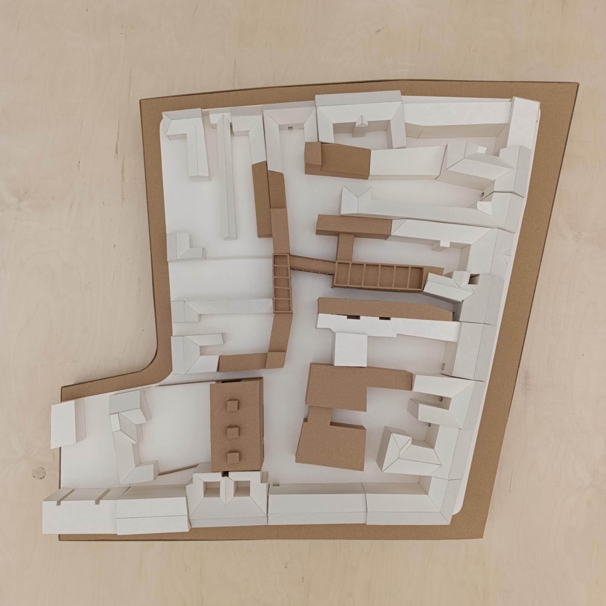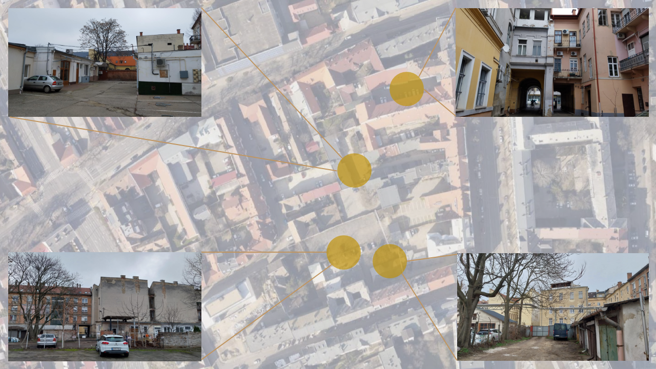 A felvetéshez kerestem helyszínt, melynek elemzése után világossá vált, hogy egy átfogó koncepciónak kell születnie a tömbbelső átalakítására. A tömb délnyugati részén elhelyezkedő belső sarki terület egy határhelyzet: az Iskola utca felől még egy-egy földszintes cívisház őrzi az egykori beépítést, de a Vásáry István utca felől már jellemzően három-négyemeletes bérházak találhatóak. Ezek közül egy nem nyit a tömbbelsőre, ennek tűzfalához csatlakozok és a kanyarban lévő cívisházat is bevonom a tervbe. A célom a hely identitását megőrizni a régi épület és a növényzet megtartásával. A jellemzően kisvárosi környezetből érkező diákok így felismerhetik benne saját otthonukat, magukénak érezve városi lakóhelyüket is.