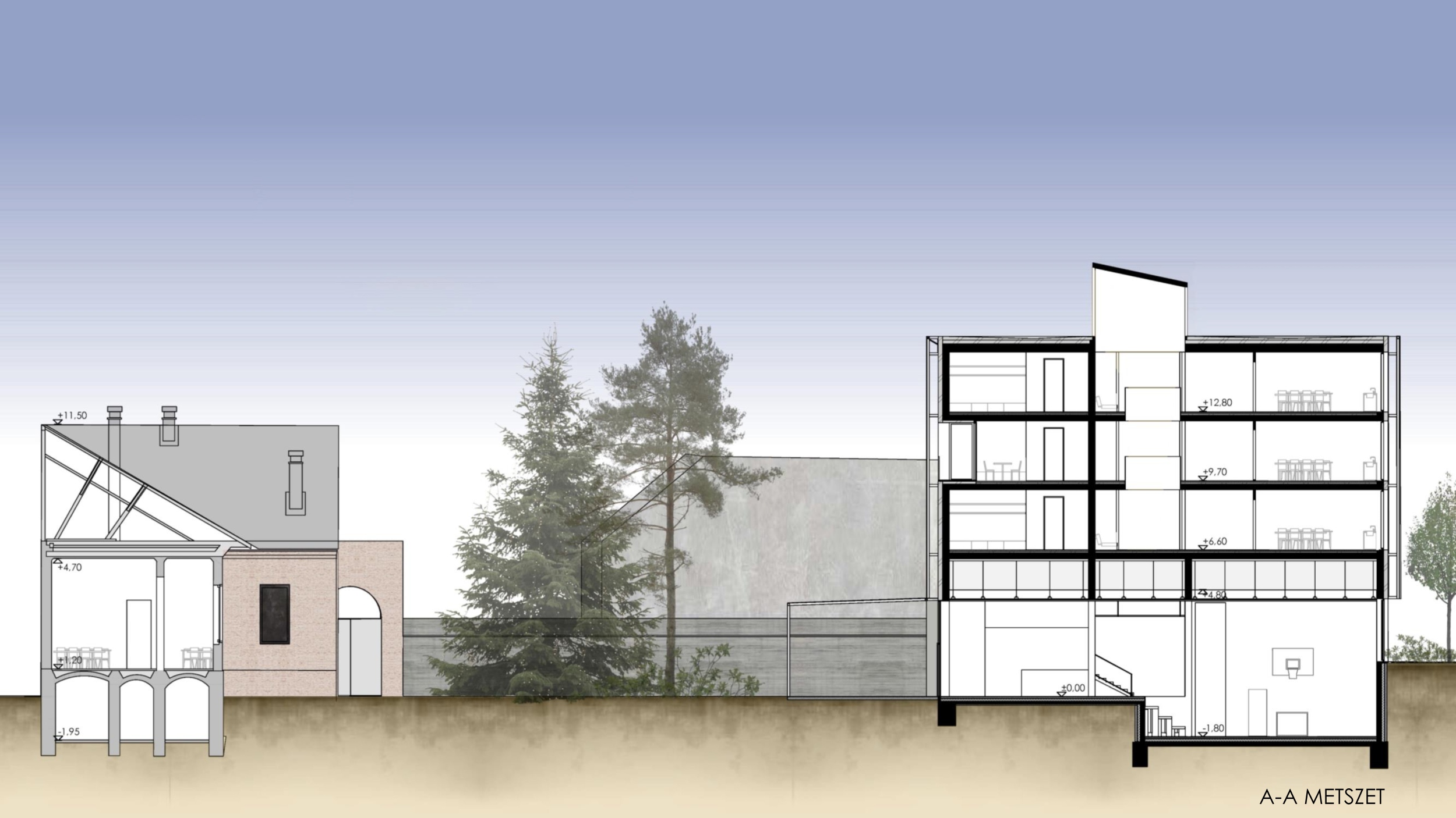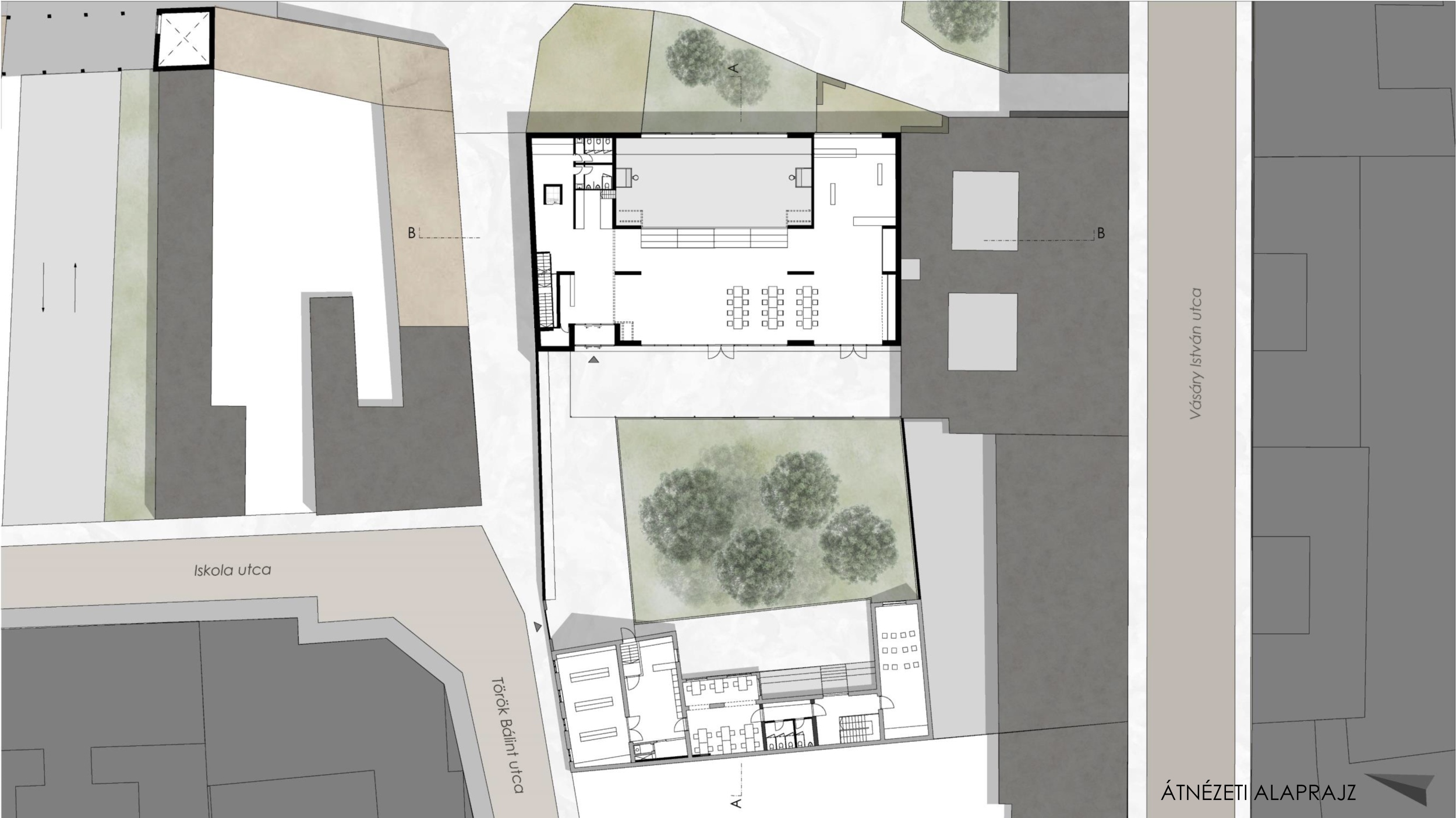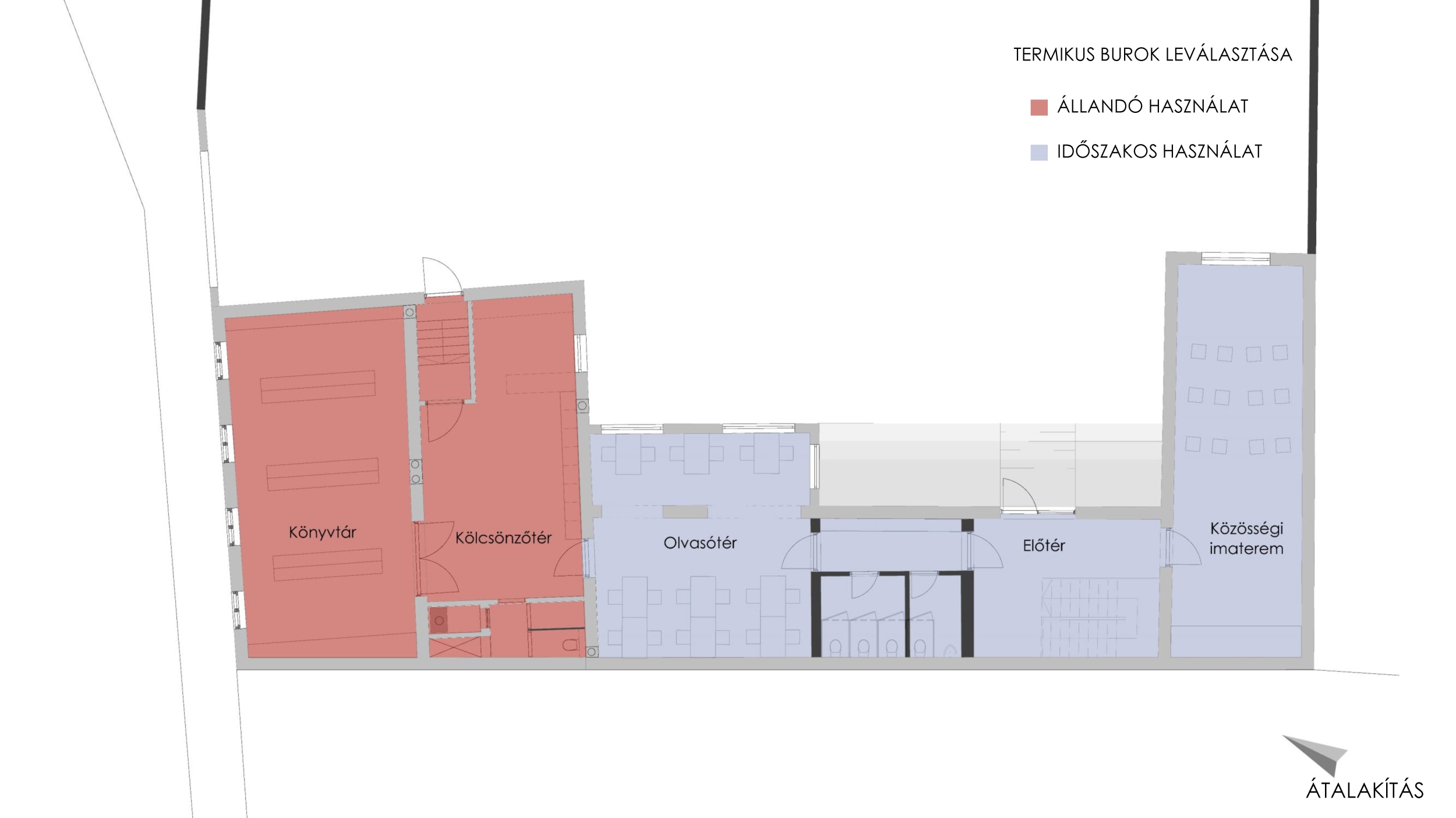 A régi és az új viszonya elkülönülten jelenik meg, egyfajta tiszteletet adva a cívisháznak. A meglévő földszintes épület több lakóegység egymás után sorolását mutatja. A belső válaszfalak elbontásával nagyobb összefüggő tereket jönnek létre, így az utcafront felől könyvtárként, míg a kert hátsó része felől közösségi imateremként alakul át a térsor.