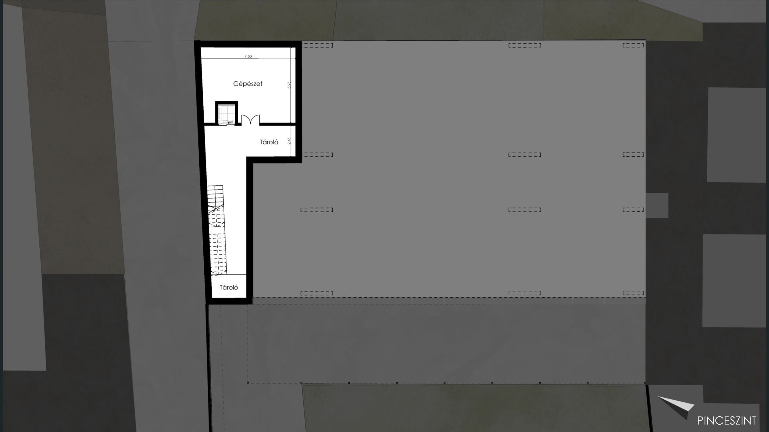 A tömbbelső jelenlegi állapotából hiányzik egy értelmezhető térstruktúra, és a városi hangulat, nyitottság. Szétszórtan valósul meg a parkolás – belvárosi tömbhöz képest aránytalanul nagy az autók által elfoglalt terület. Emellett a Piac utca felőli területeken a gépjármű behajtás a gyalogosok által használt sétányon és átjárókon keresztül történik. A problémát egy mélygarázs koncepcióval oldjuk fel, ahol a parkolás szervezett módon, a térfelszín alatt történik, az Iskola utca felől behajtási lehetőséggel, kihasználva a nyugati irányú tereplejtést. Ezáltal feloldódik a Piac utcai gyalogos-gépjármű közlekedés keveredése, valamint így a térfelszín felett lehetőség nyílik egy városi tér és park kialakítására.