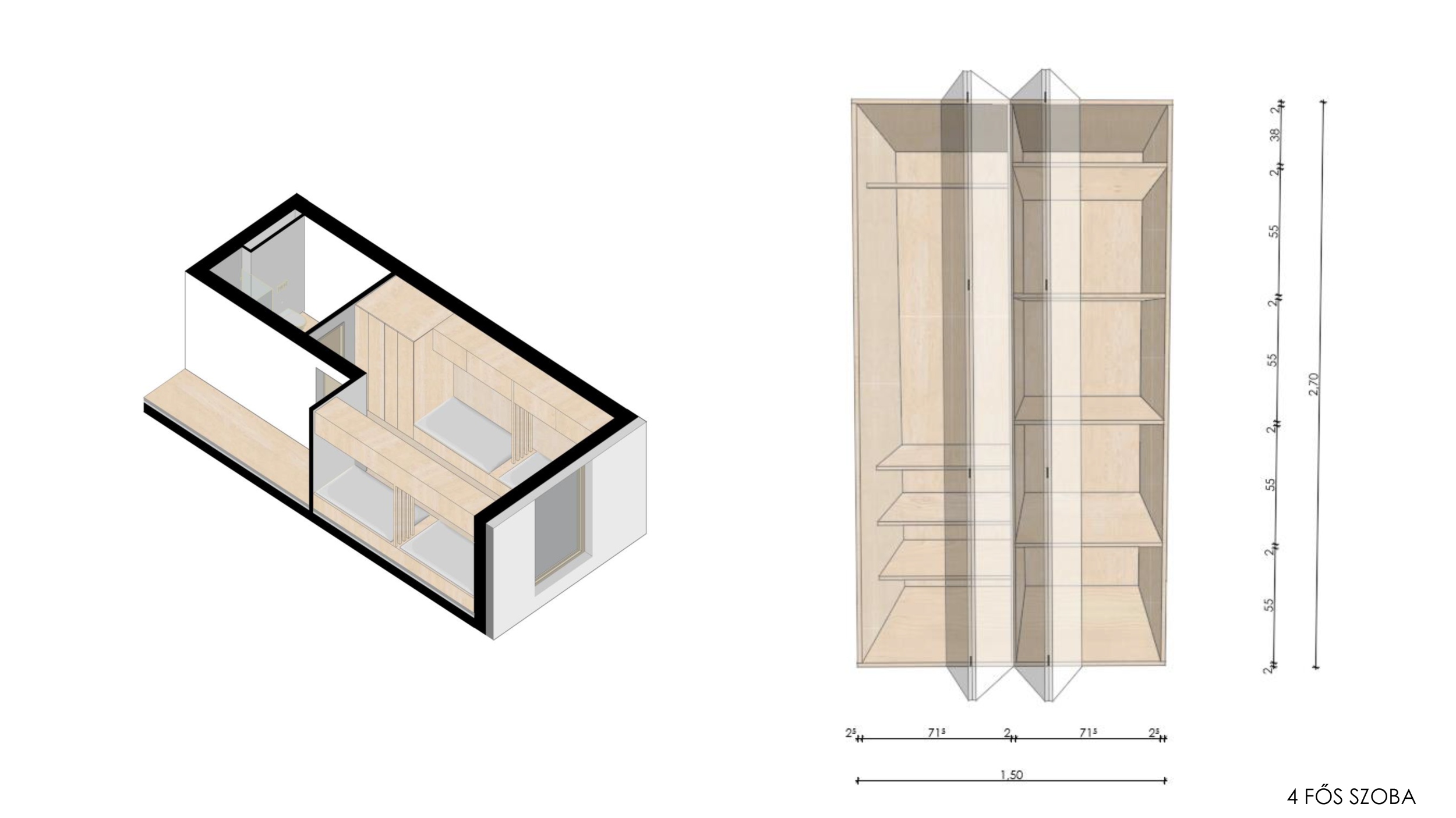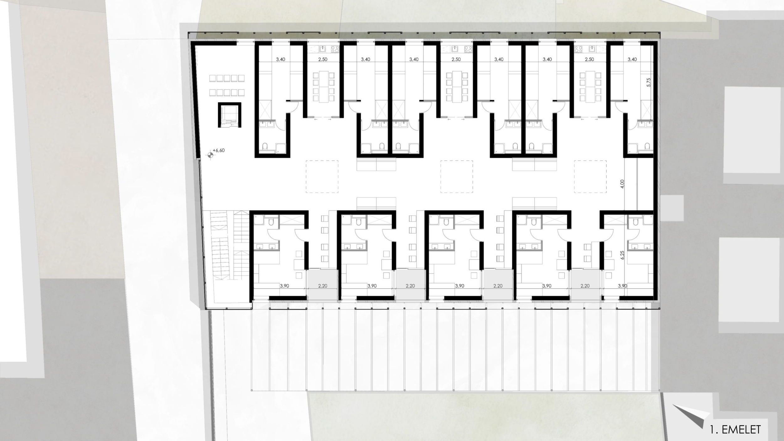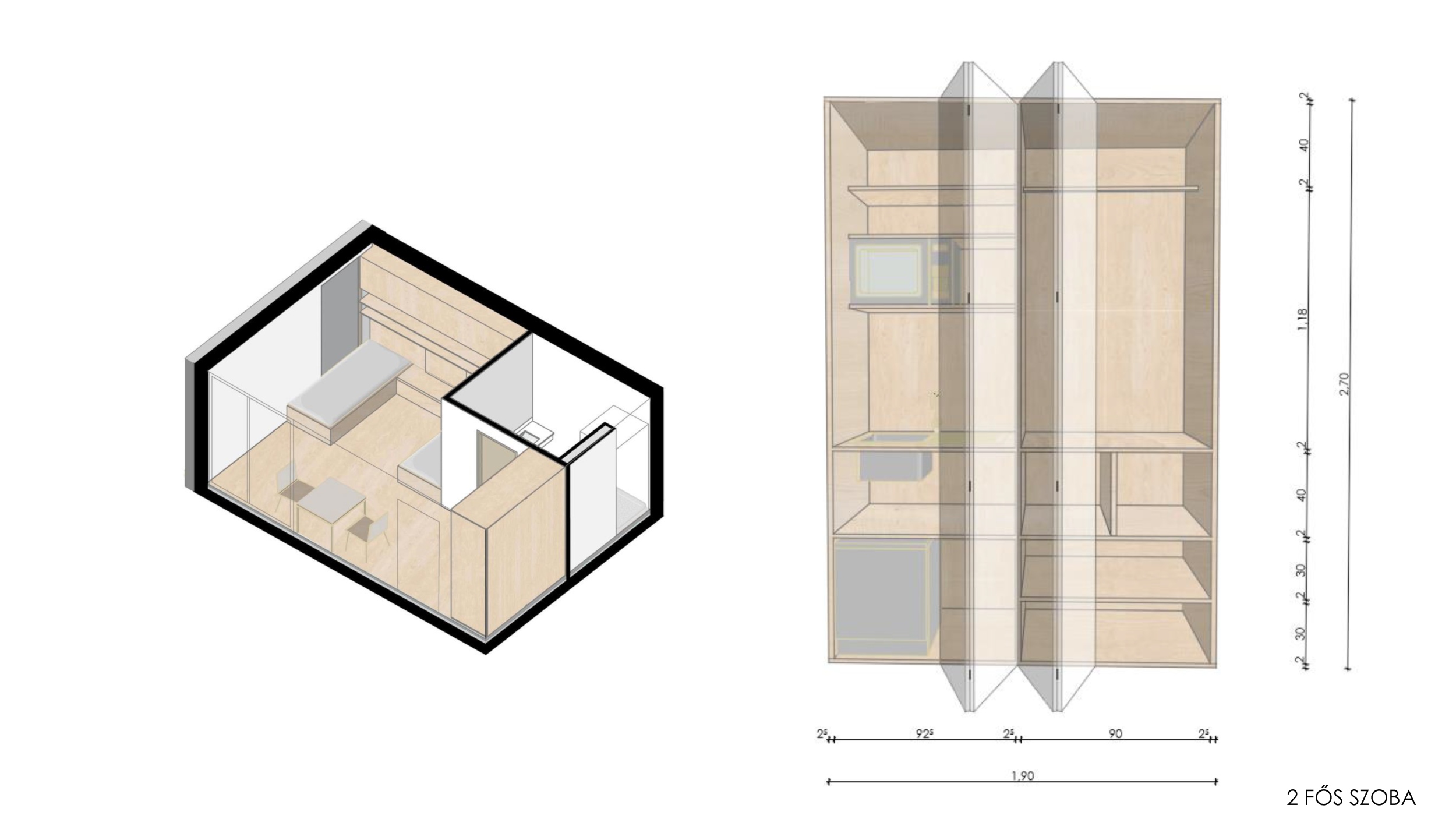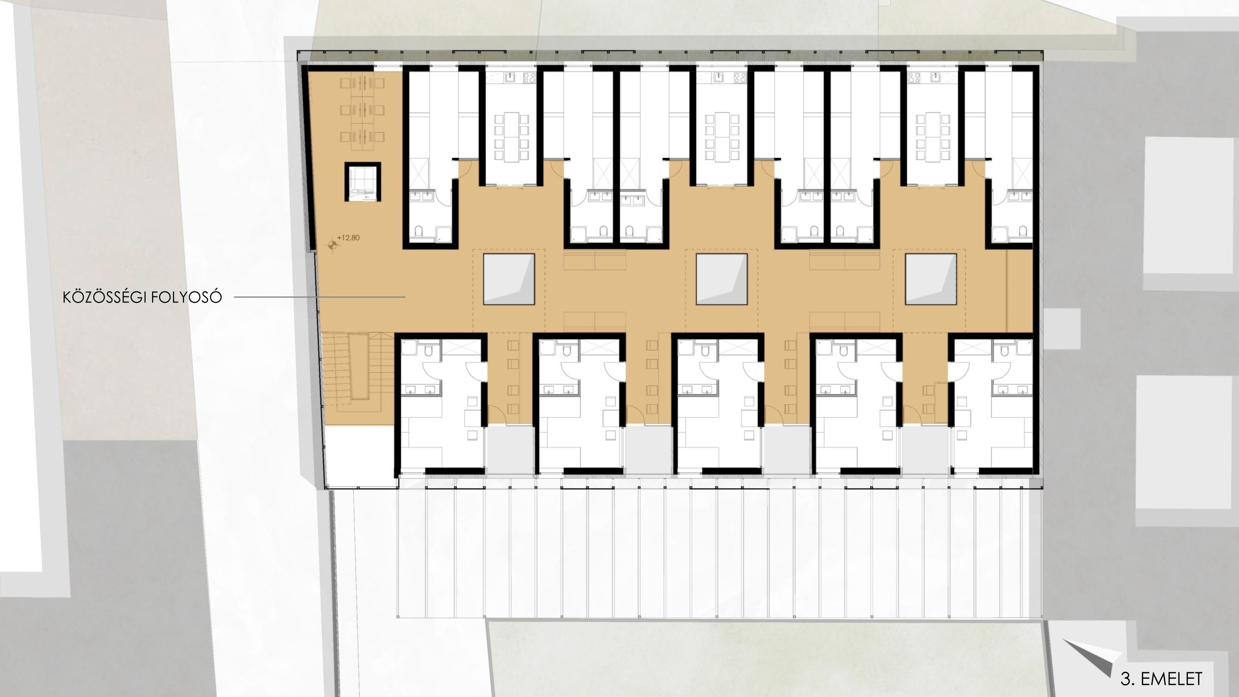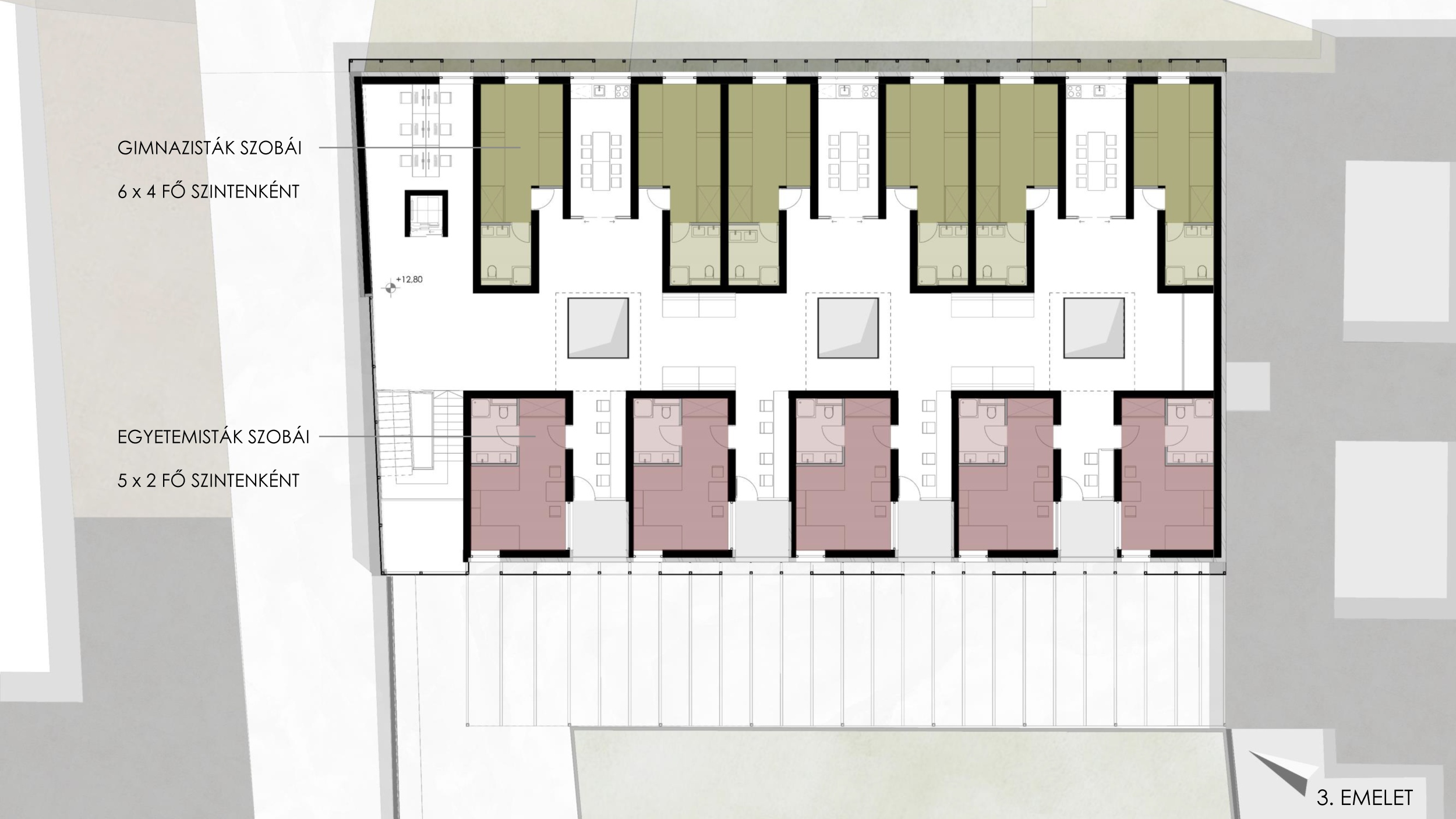 A felsőbb szinteken a fénykutak légtere szervezi teret. A lakószinteken két oldalra soroltan helyezkednek el a kollégiumi szobák, melyek kétféle kialakítással jelennek meg. A keleti oldalon a négyfős gimnazista szobák kapnak helyet, mely kialakítással a közösség erősítése a cél. Az eltérő életritmusból fakadóan az egyetemistáknak reálisabbnak tartok egy lakás jellegű – de még nem lakás – kompakt lakóegységet, amely két fő számára van kialakítva.