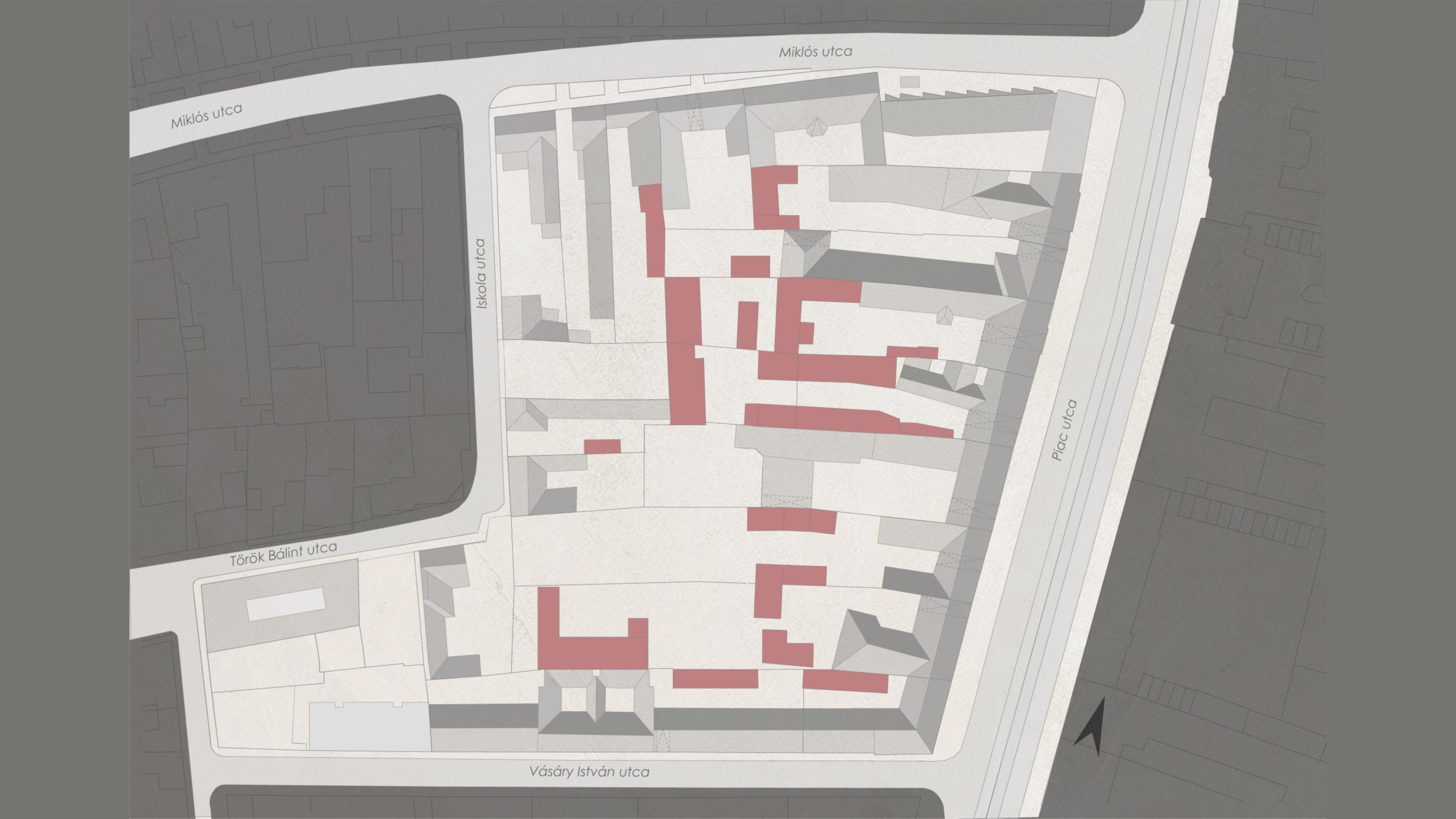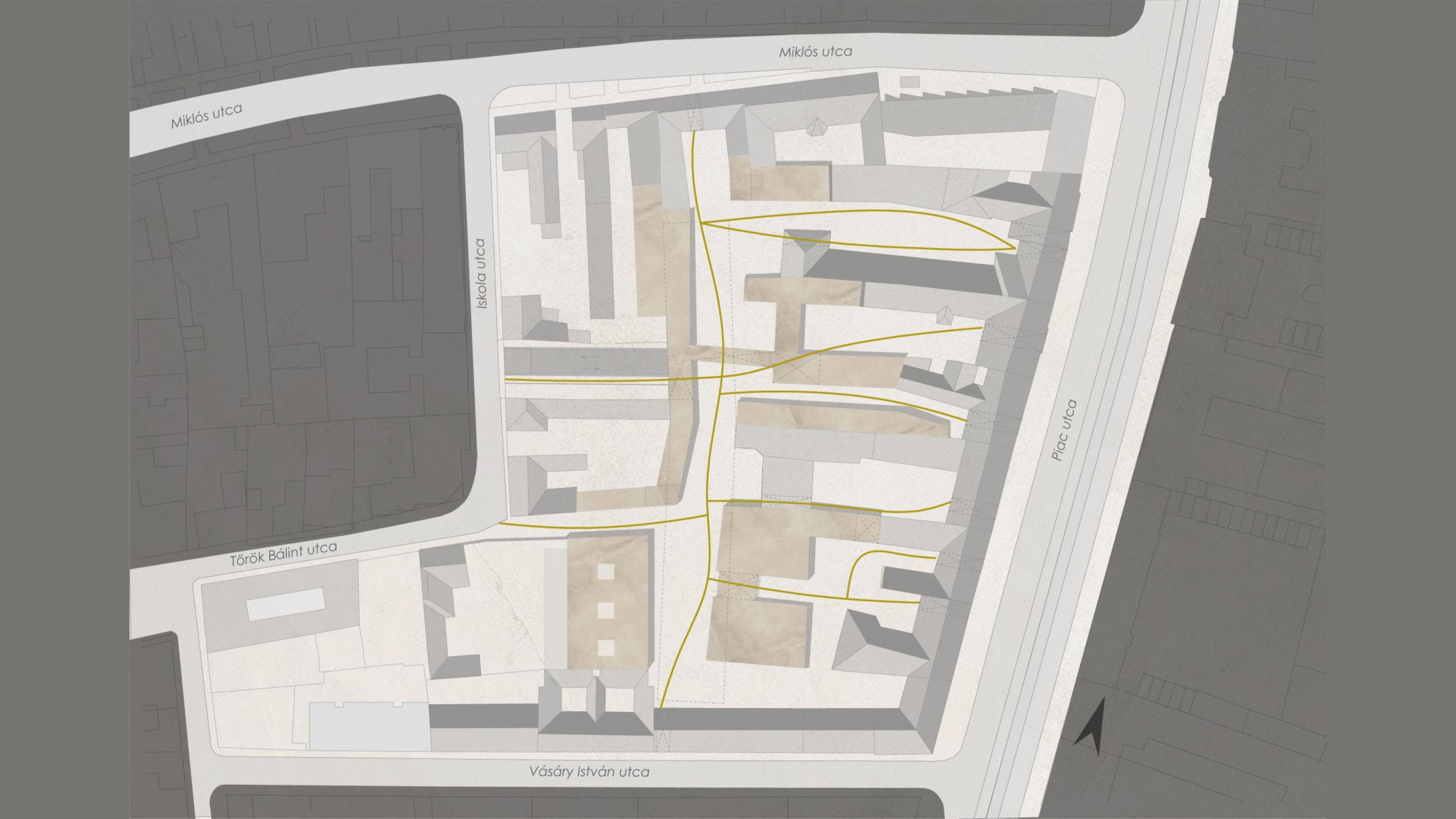 A Piac – Miklós – Iskola – Török Bálint – Vásáry István utcák által közrezárt tömb jelenlegi állapota, alulhasználtsága arra vezetett, hogy összefogjunk, és egy átfogó koncepció szülessen a belvárosi lakókörnyezet javítására és a tömbbelső átértelmezésére. A célunk átjárhatóvá tenni a tömböt, valamint új térértelmezéssel és beépítéssel újra bevonzani a fiatal lakóközösséget. Városszerkezeti kontextusba helyezve egy Piac utcával párhuzamos gyalogos tengelyre fűznénk fel a tömböt, kiterjesztve a gyalogos zónát a Hal közig. A megnyitásra a jogszabályi keretek nem adnak lehetőséget, ezért a telekosztástól felszabadítanánk a tömböt.