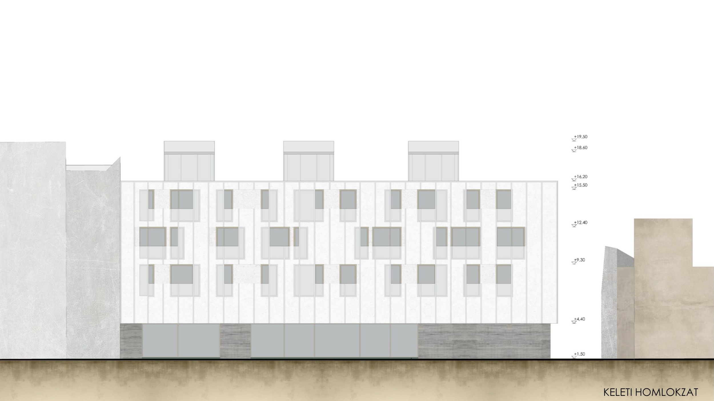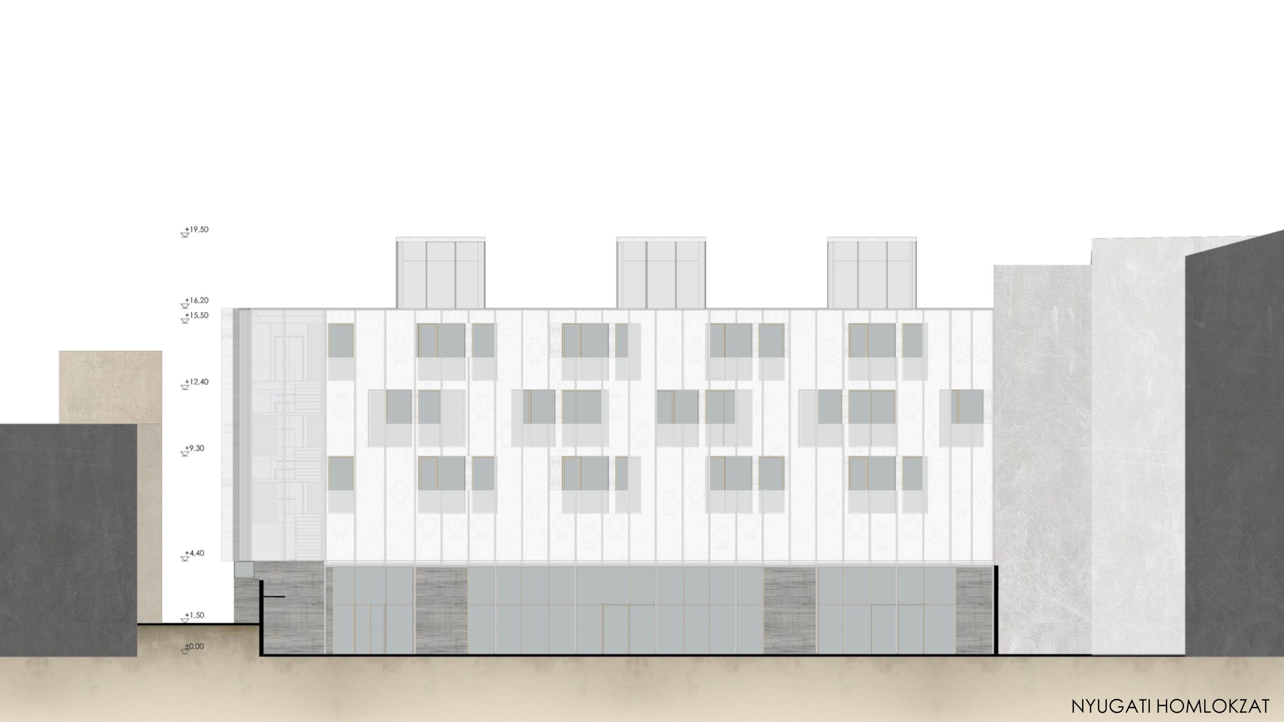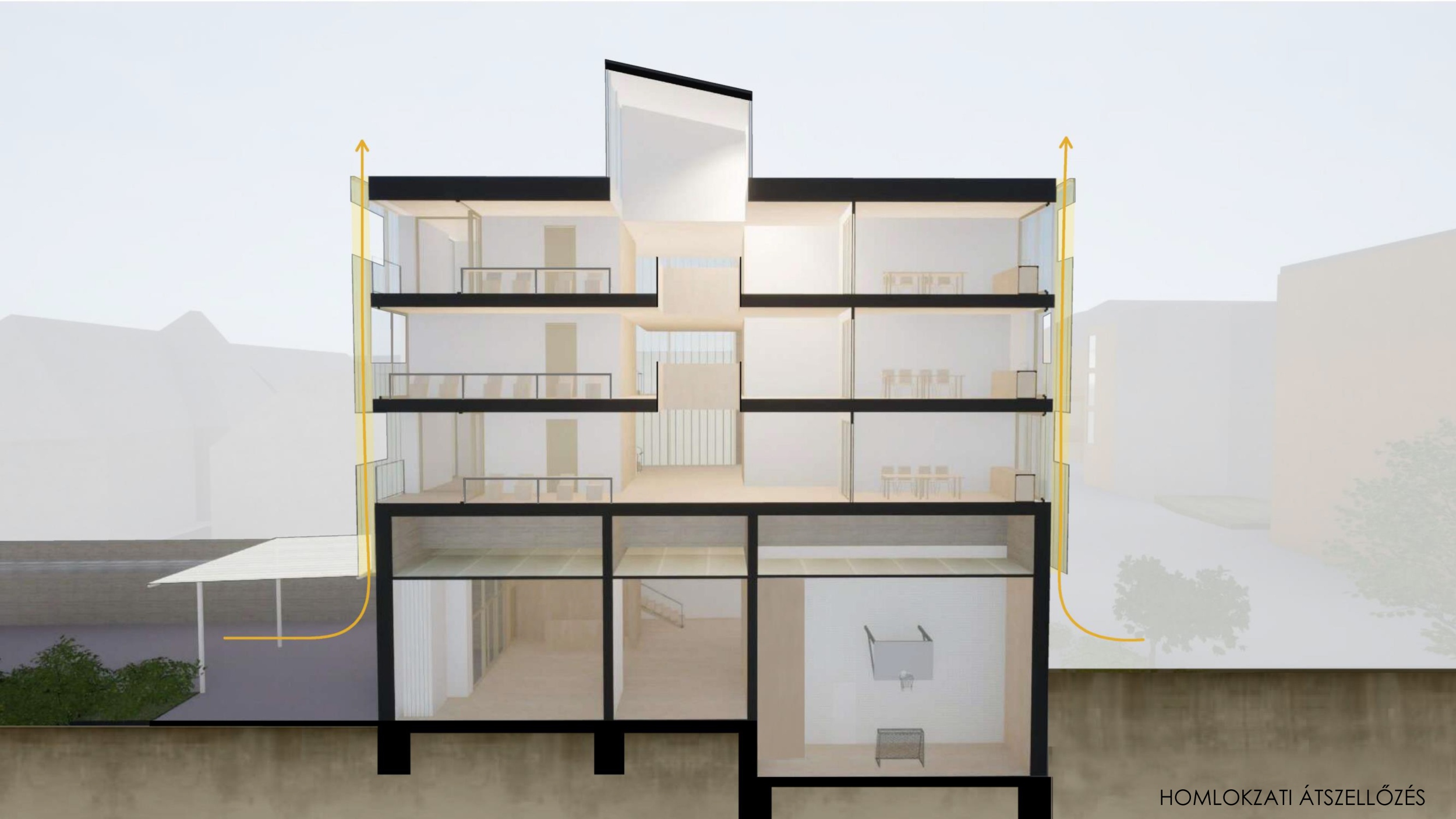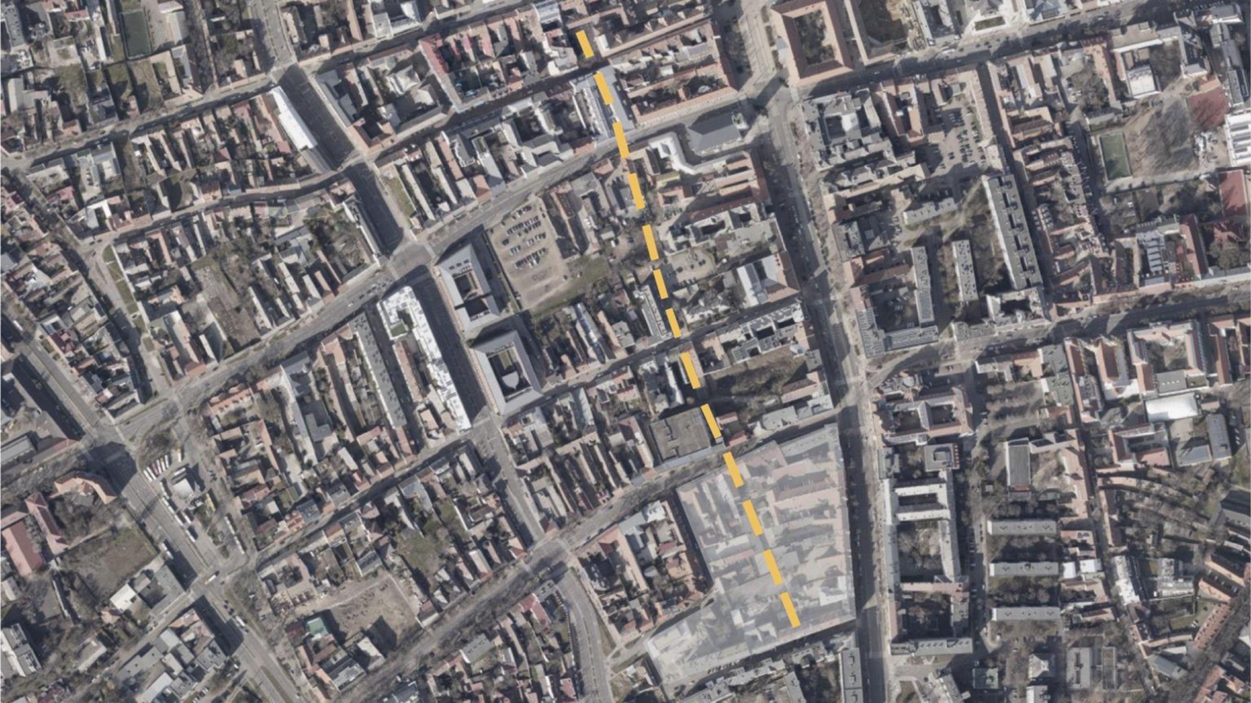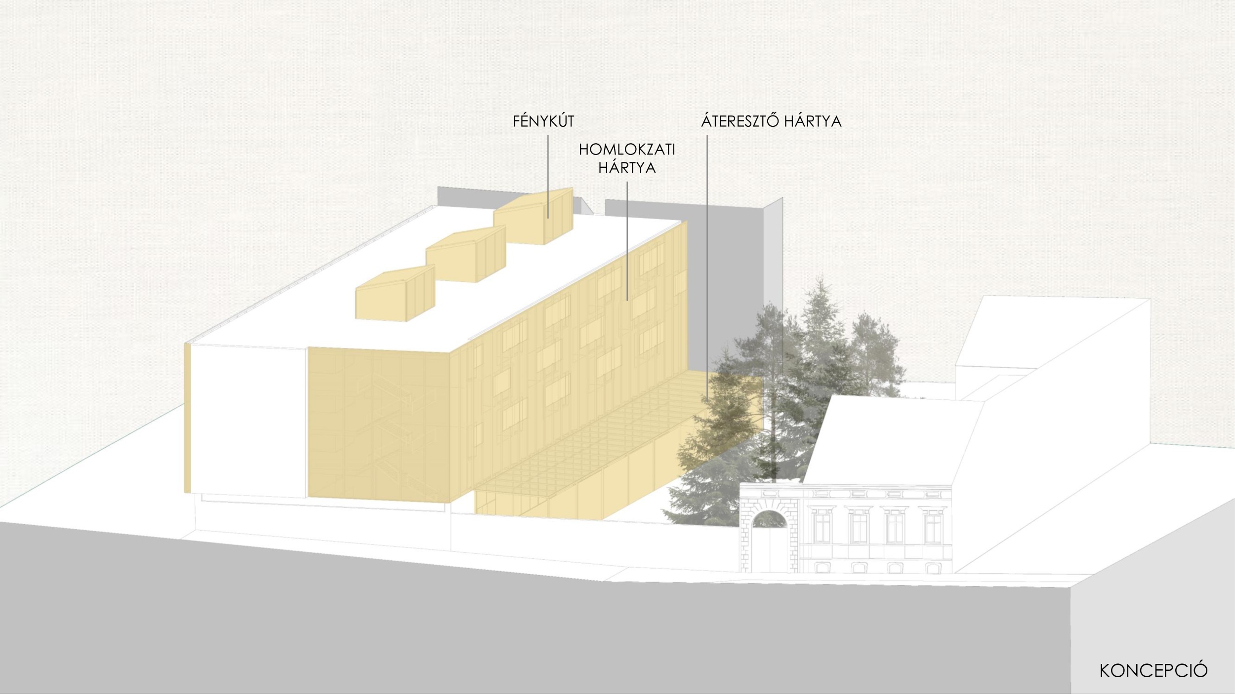 A tömb jelenlegi épületállományából az építészeti értéket nem képviselő, funkcionálisan sem jelentős épületek bontásra kerülnek, és a meglévő épületekhez csatlakozva beépítjük a tömböt, saját identitást adva ennek a területnek. A tengely fő iránya észak-déli, de kelet és nyugat felől is rácsatlakoznak sétányok. Ezen közlekedési útvonalak áramlására szervezzük a zöldfelületi koncepciót, melynek teresedései időtöltésre alkalmas funkcióknak (pl. játszótér, szabadidőtér, közösségi kert) adnak helyet, a növényzet pedig hozzájárul a városi hőszigetek megelőzéséhez. A rehabilitáció két kiemelt épülete egy diákkollektívát és egy alternatív lakóközösséget szolgál ki. A többi, tervezett tömegbe pedig olyan funkciók kerülnek, amik egyrészt hiánypótlóak, másrészt a belvárosi élethez kapcsolódnak és növelik az élhetőségi viszonyokat.