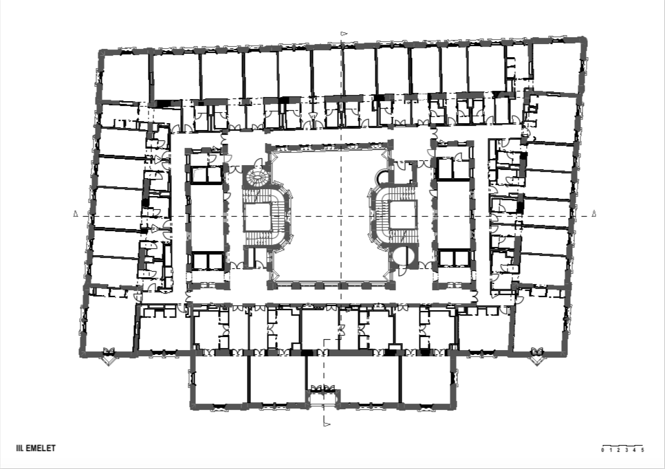 Bár az épület térszerkezete alapvetően nem változik meg, a szállodai szobák kialakításához a belső traktusok struktúráját meg kellett bontani. Az eredeti U alakú közlekedőrendszer – mely a közösségi terek és a fölépcsőház megközelítésére lesz kialakítva – mellett, egy új közlekedőrendszer is megvalósul, erőteljes építészeti kontraszttal a restaurált, rekonstruált elemek és az új, kortárs belsőépítészeti eszközökkel operáló, szobákhoz csatlakozó közlekedő megjelenése között.