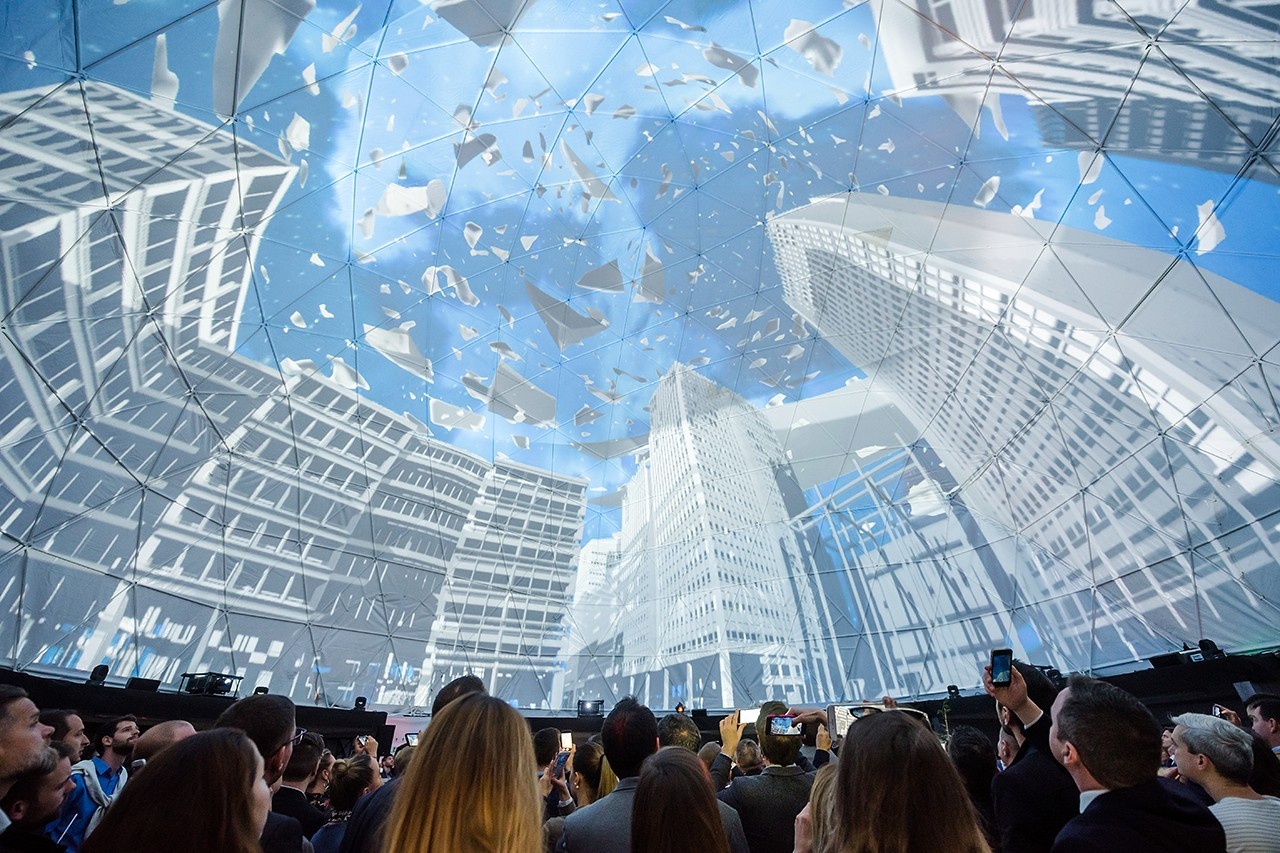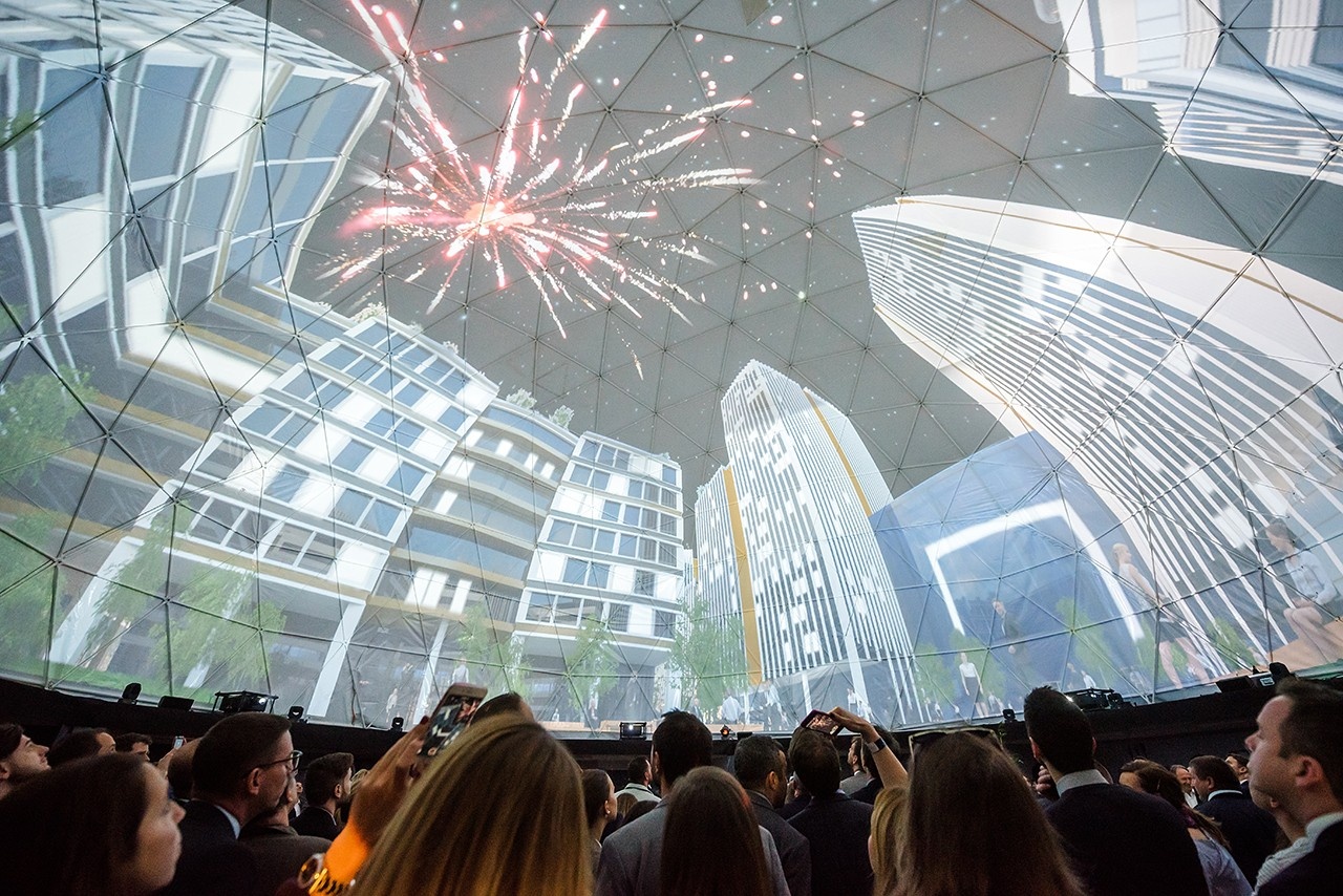 A virtuális alapkőletétel során az Agora központi tere tárult a látogatók szeme elé, melyet egy különleges, 360°-os 3D „projekt mapping show” segítségével hívtak életre. A látványos megoldást hosszas munkálatok előzték meg, amely során a rendezvényre tervezett, 15 méter magas dómban füves parkot és pop-up üzleteket - többek között kávézót, éttermet, virágboltot és a rendezvény ideje alatt is működő borbélyszalont - helyeztek el, hogy a látogatók még könnyebben a már kész Agora központi terére képzelhessék magukat. A szokványos kültéri helyszínekkel ellentétben a beruházás terepe számos kihívást rejtett magában: a rendezvény telepítése egy hétig tartott, közel 50 ember részvételével.