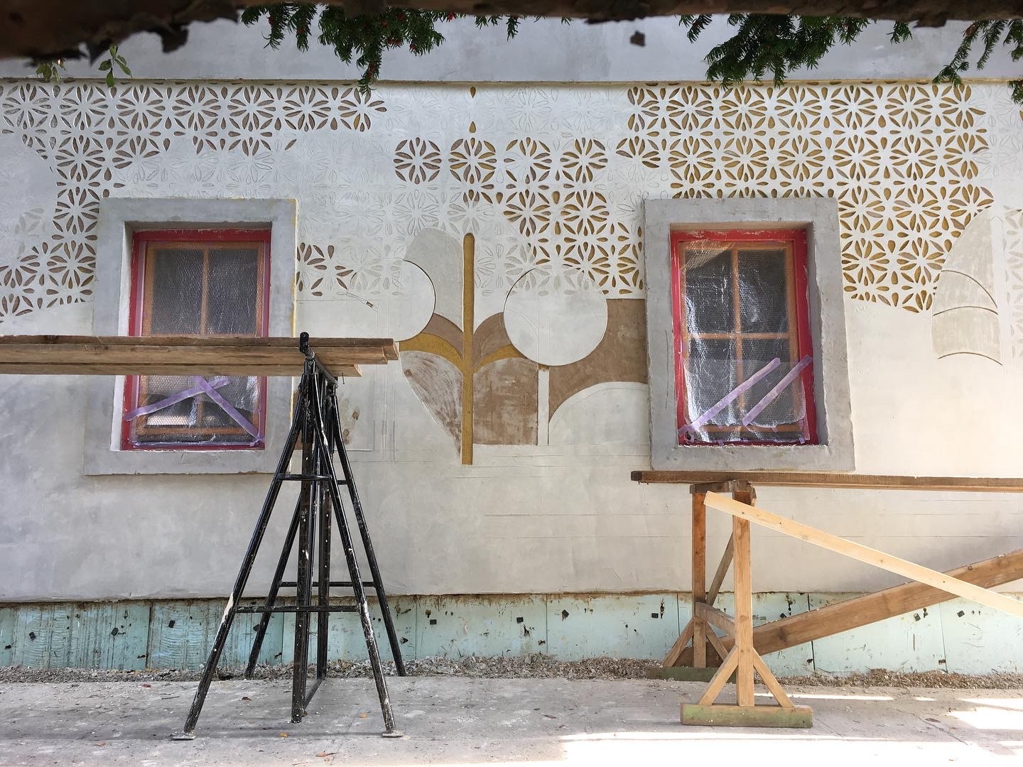 Együttműködésben a chilei Pilmaiken Nomád Ökoiskolával szerveztünk egy díszítő mészvakolat műhelymunkát. A mexikói származású, de évek óta Spanyolországban élő Kimberly Bárbara Bárcenas Hernández képzőművész, freskókészítő vezetésével készítettük el a homlokzat díszítését. Spanyolországban a murálnak nagy hagyománya van, amit itt csinálunk, az tulajdonképpen a sgraffito technika, kortárs motívumokkal. Több rétegben, több színt hordunk fel a falra, aztán a kívánt mintát visszakaparjuk. Így vagy új színek bukkannak elő, vagy új textúrájú felület keletkezik. A vályognak is nagyon sokféle színe lehet, az anyagtól függően, de pigmentekkel is lehet színezni, így a beltéri vályogvakolat is díszíthető. Bent a házunkban is vannak kapart díszek, a vályog díszítése annyival egyszerűbb, hogy javítható. A mészvaklat a megkötése után már nem, vagy csak sok munkával változtatható, javítható.
