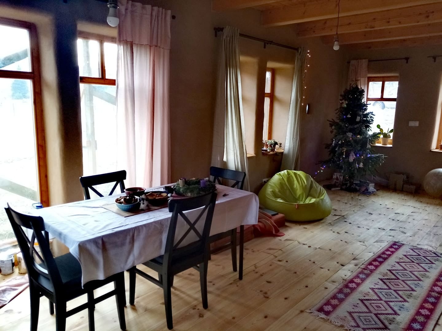 A férjem akadálymentesítéssel foglalkozó építész, fontos szempontunk volt, hogy szintben ki tudjunk jönni minden helyiségből a kertbe. Ő eredetileg a beton világból jött, nagy beruházóknál, dolgozott. Németországban egy műhelymunkán látta, hogy egyenes falat is lehet szalmából építeni, akkor meg tudtunk állapodni, hogy ebből lesz a házunk. Harmincöt centiméteres szalmabálákból van a fal, kétoldalt 5-5 centi vályogtapasztással, a külső oldalon mészvakolattal. Klímát nem használunk, a fűtést falfűtéssel oldottuk meg, ami sugárzó fűtésként kellemesebb hőérzetet biztosít, a fűtőcső az agyagtapasztásban halad.