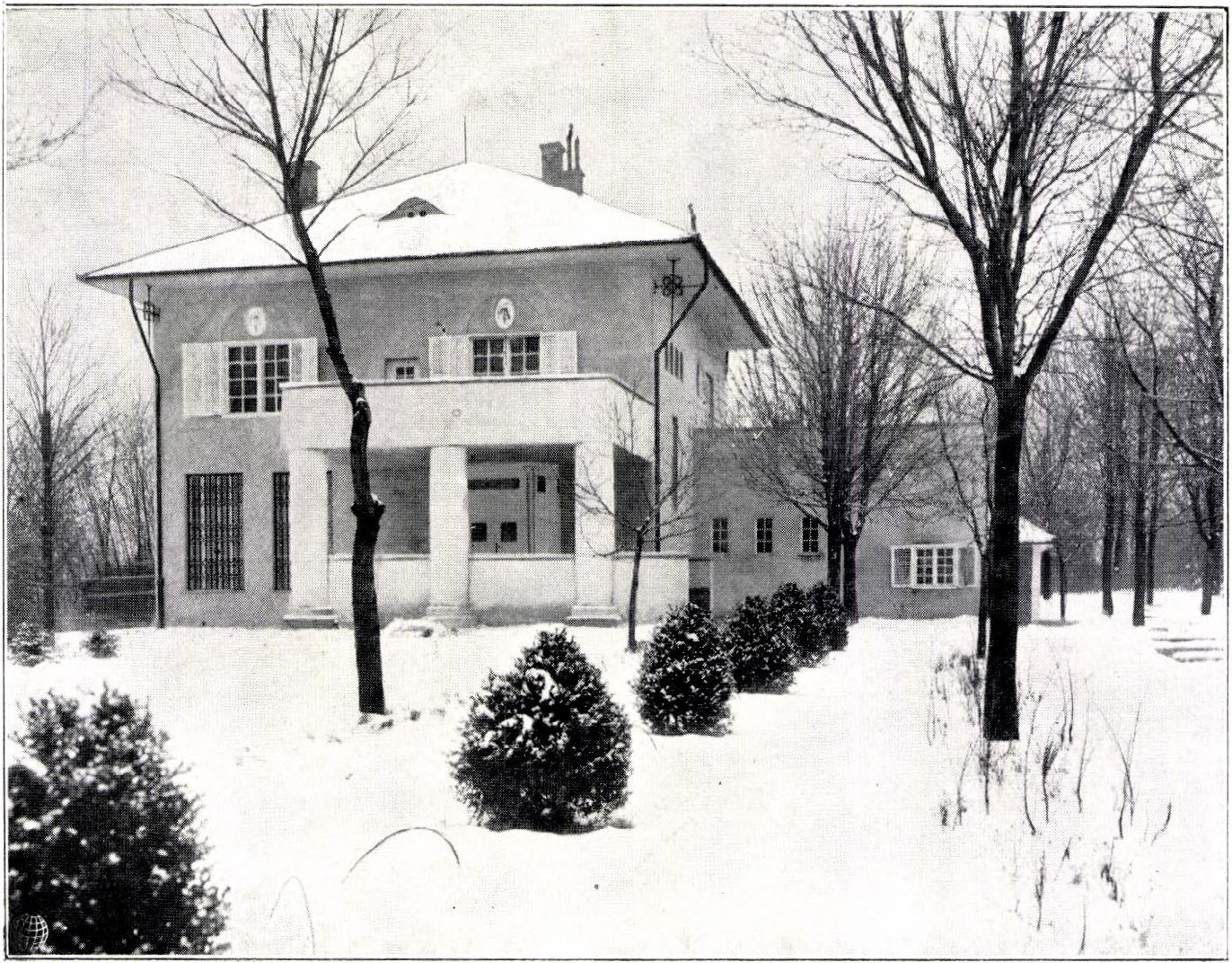 Homlokzatain visszatérő motívumokkal találkozunk: félköríves árkádok, gigantikus kővázák, nagyméretű emeleti teraszok oldják az amúgy gazdaságosan zárt tömegeket.