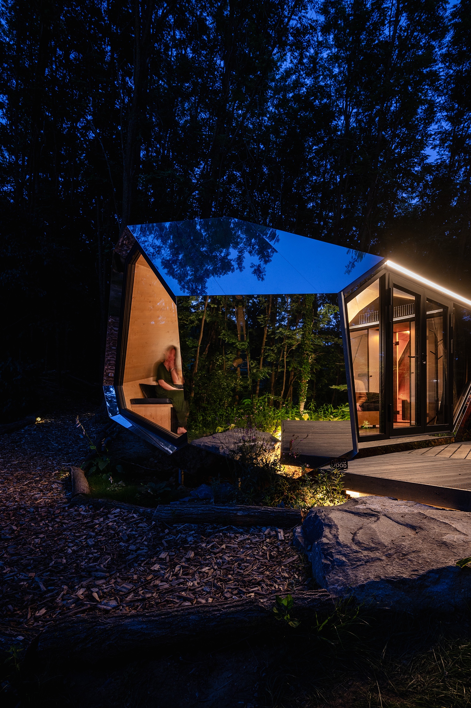 A Hello Wood műhelyében előregyártott – Magyarországon és Európában egy darabban, míg tengerentúlra való szállítás esetén lapraszerelt – kabinok helyszíni telepítése körülbelül egy napot vesz igénybe. Természeti környezetben betonalapra sincs szükség, köszönhetően a talajcsavaros alapozási rendszernek, így kabinházaik környezetterhelése is minimális. Ezek az egyedi alakú és választható, változatos borítású kabinok a környezet megzavarása nélkül helyezhetőek el a természetben, vagy akár urbánus helyzetekben is, mint például az eddig nem hasznosított háztetőkön. A dizájn rendkívül jól alkalmazkodik a körülményekhez és a megrendelői igényekhez: a gondozásmentes külső burkolata anyagától és textúrájától függően – amely lehet fa, kő, alumínium vagy tükör is – erdei vagy akár ipari területeken is beleolvad a környezetébe, vagy éppen szándékosan konkurál vele.