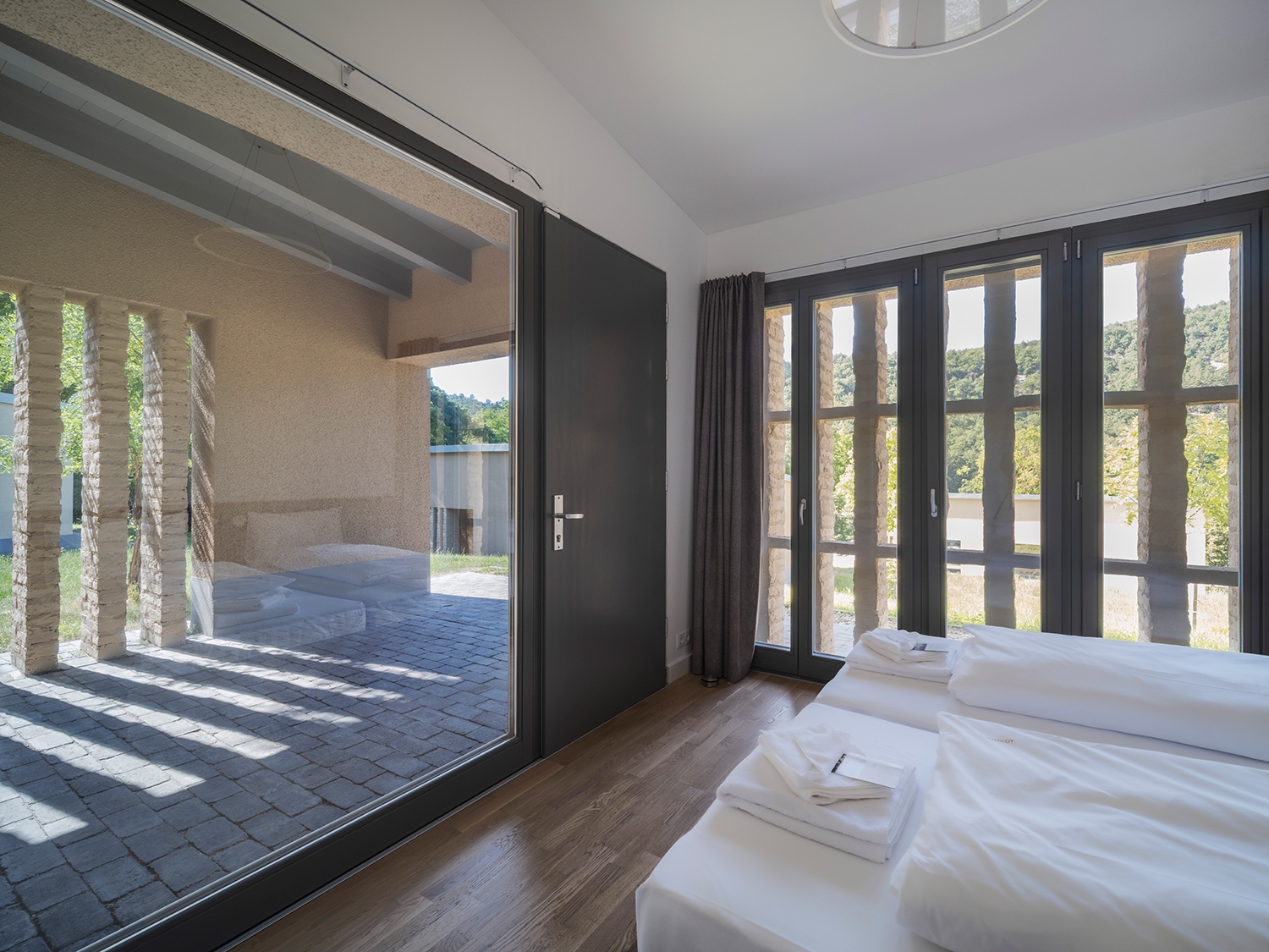 Az út mentén húzódó látogatóközpont íves, ölelő karakterére és a völgy infrastrukturális elemeire egyként válaszol az apartmanházak sakktáblaszerű telepítése: szigorú mérnöki geometriája felhagy a Nagy Tamás által követett lágy illeszkedéssel, a tájban lenyomatszerűen megjelenő szerkesztettsége művi hatású. A domboldalon öt, egymást kísérő sorban elhelyezett házak ritmikáját erősíti a természetes lejtővel azonosnak érezhető félnyeregtetős lefedés formai didaktikussága. Az egyes házelemek kompaktságát fokozza, hogy a közel négyzetes alaprajzú, bútorozással gondosan megtervezett szobaelrendezések oldalról kiegészülnek egy fedett-nyitott terasszal, és e téglány formájúra kiegészülő kompozíciót ritkásan rakott, vékony téglapillérekkel keretezi le, melyek a hálószobák nagy ablakfelületei előtt (is) belátást korlátozó lamellasorként állnak.