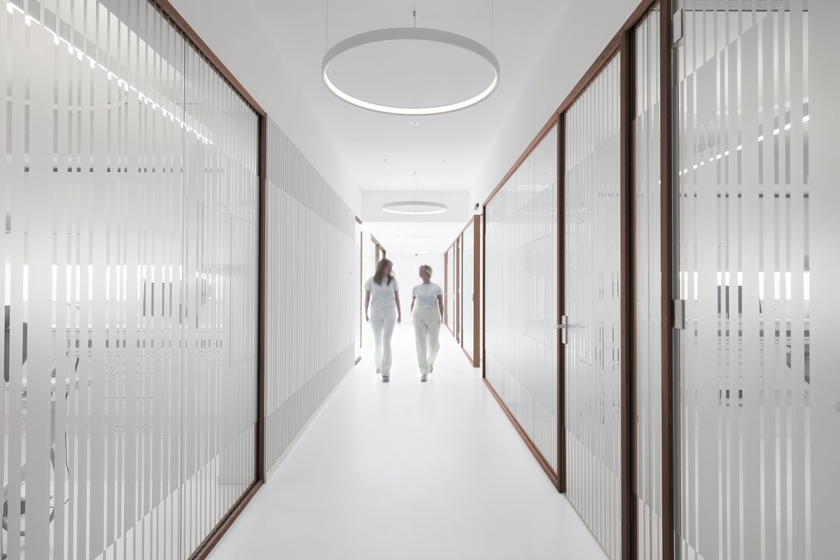 A szekrények és berendezések steril fehérségét a pácienssel szemközti fal mély zöld színe ellensúlyozza. A páciens ezt a nyugtató hatású felületet látja a fogorvosi székből. Minden kezelő mennyezetén tetőablakok nyílnak, így a betegek a kezelés alatt közvetlenül kiláthatnak a szabadba.