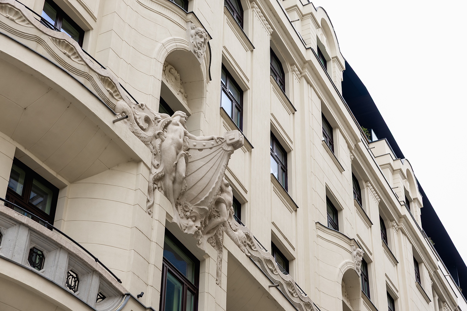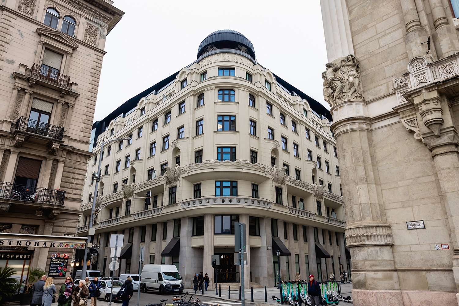 A Vigadó tér és az Apáczai Csere János utca találkozásánál álló épületet 1910 és 1913 között emelték a Magyar Királyi Folyam- és Tengerhajózási Részvénytársaság (MFTR) székházaként, tervezői Kármán Aladár és Ullmann Gyula voltak. Az 1895-ben alapított társaság a hazai vízi szállítás meghatározó szereplője volt, központja ennek megfelelően reprezentatív architektúrát kapott. A saroképület homlokzatán és belső tereiben következetesen jelennek meg a hajózási motívumok: hullámzó ornamentika, hajótestet idéző erkélyek, kötelekre és tengeri szimbólumokra utaló részletek.