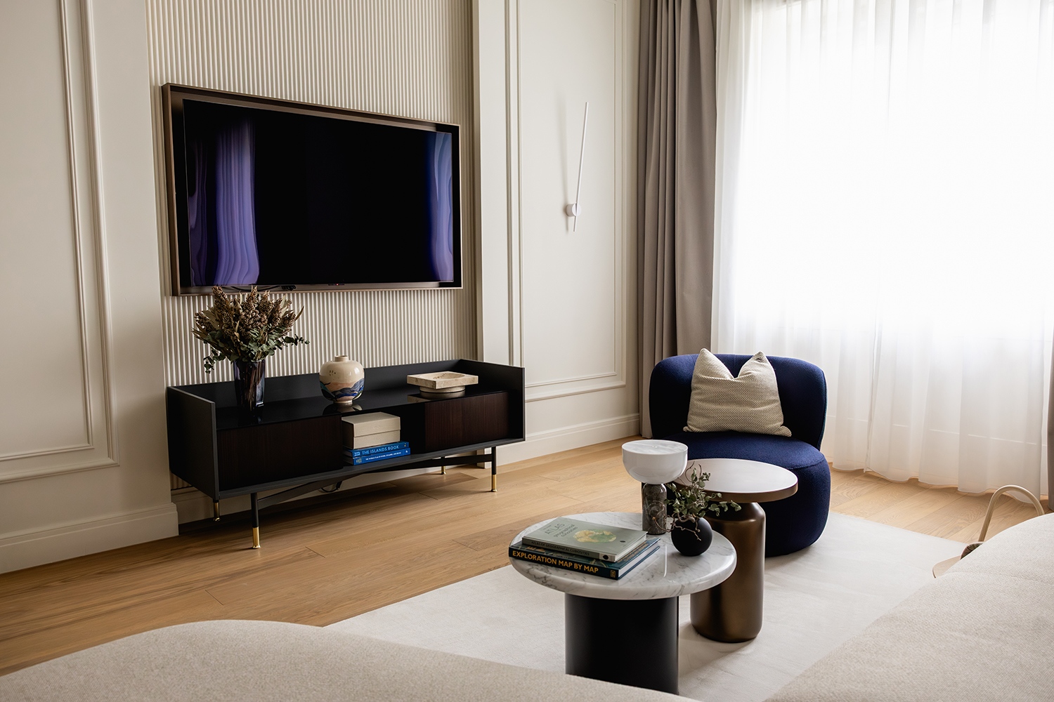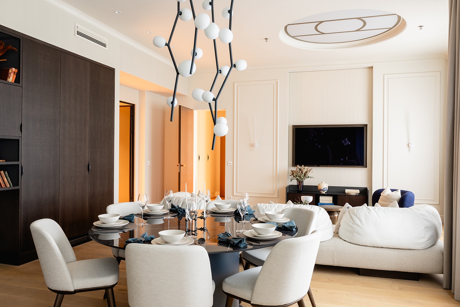 Az épület új funkciójához kellett azonban igazítani a belsőt. Összesen huszonhárom apartman kapott helyet a felsőbb szinteken. Egy vagy két- és három hálószobás, 60–240 négyzetméteres lakásokról van szó, privát erkélyeikről a Vigadó térre, a Dunára és a Budai-hegyekre látni. A Dorottya Residences lakásai egyedi beépített bútorzattal kerülnek átadásra, a nappalihoz kapcsolódó, üvegajtóval leválasztható amerikai konyhában falra szerelt polcrendszer és teljes körűen felszerelt, beépített konyhabútor kap helyet. A hálószobákhoz tartozó walk-in gardróbok elegáns tárolórendszerekkel készülnek. A fürdőszobákban a mosógép és szárítógép is beépített, dedikált szekrényrendszerben lesznek átadva, valamint elegáns, fiókos mosdószekrény gondoskodik a finom részletekről és a rendezett megjelenésről.