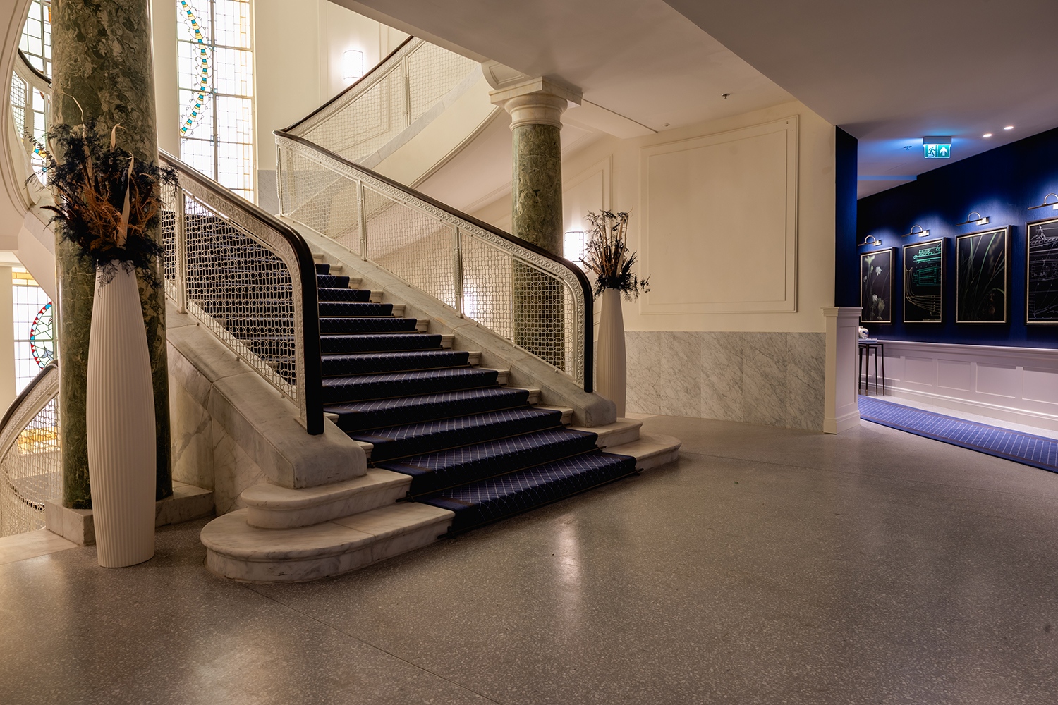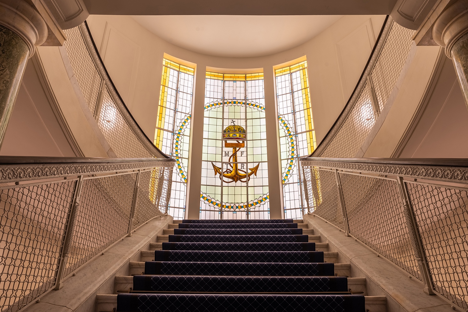A homlokzat restaurálása kiterjedt a sérült kőelemek tisztítására és pótlására, valamint a plasztikus díszítések rekonstrukciójára. A főlépcsőház a földszinttől a második emeletig vezet, erezett okker márvány kőburkolata és hajókorlátra emlékeztető, dróthálós mellvédje egyedülálló építészeti értékkel bír. A színes ólomüveg ablak a MAHART emblémáját jeleníti meg horgonnyal, koronával és nemzeti színű zászlókkal; restaurálása a belső tér egyik meghatározó elemét emelte ki újra.
