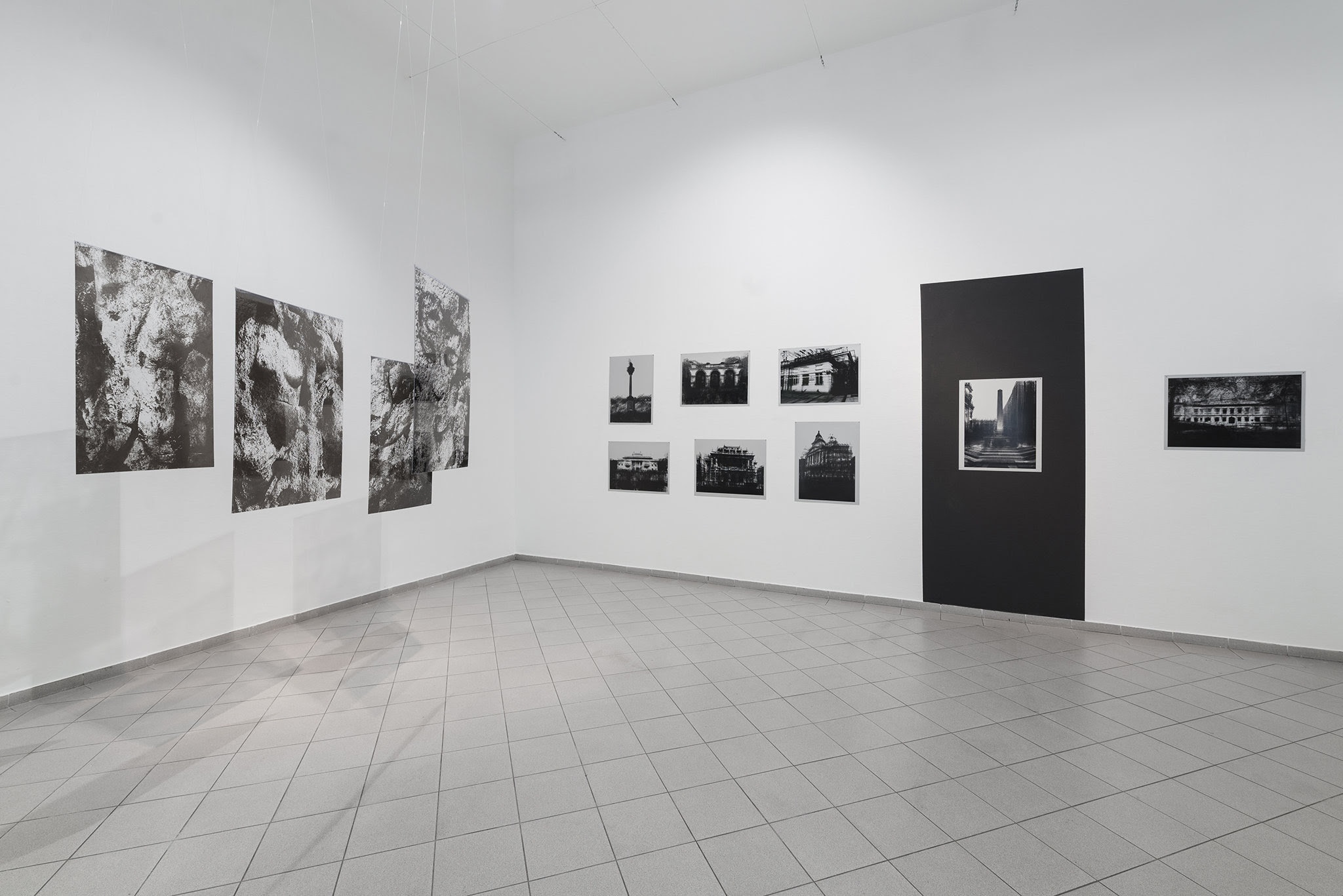 Az általam most megemlített három épület az Alekszander által hétköznap megtett útvonal részeit jelölik. A falakon feltűnnek ismerős budapesti helyszínek, melyek kiválasztásakor inkább a benyomások és a formák domináltak. A térbe belógatott fotókon olyan szobor részleteket látunk, amelyeknek jelenléte a tereken sétálva fel sem tűnik, elvesznek a környezetben. Láthatóvá teszi ezeket a munkákat, és azzal, hogy fóliára kerültek megfosztja őket az anyaguktól. A kiállítás a Város metafizikája címet viseli, ami fizikai valóján túlmutató megközelítése a városnak. Beszélgetésünk alapján én az alkotó személyes tapasztalatira helyezném a hangsúlyt. Amelyekben a tér kulcsfontosságú. „Edward William Soja amerikai geográfus Thirdspace című könyvében és tanulmányaiban a térbeliség három szemléleti módját különbözteti meg. E sajátos nézőpontok a következők: a tér ahogyan azt érzékeljük (első tér: Firstspace), a tér ahogyan arról gondolkodunk (második tér: Secondspace), illetve a tér, ahogyan azt megéljük, használjuk (Thirdspace). Soja megélt tere folyamatos változásban van. Egyesíti az első és második tér nézőpontjait, a harmadik tér egyszerre valóságos és elképzelt. A személyes élményeink emlékeink, a történelem rétegei mellett magában foglalja ott érezhető illatokat, fényviszonyokat, hangokat és hangulatokat is. A tér megélése többet jelent a lépésről lépésre változó perspektívák sorozatánál.