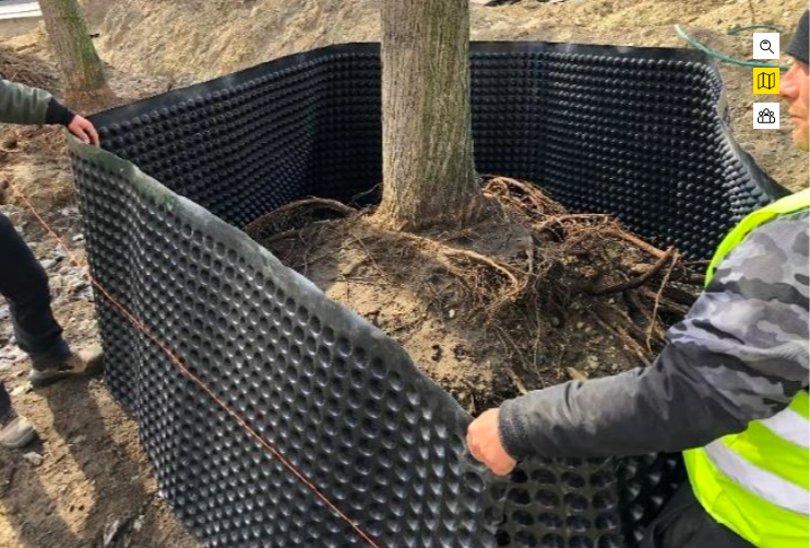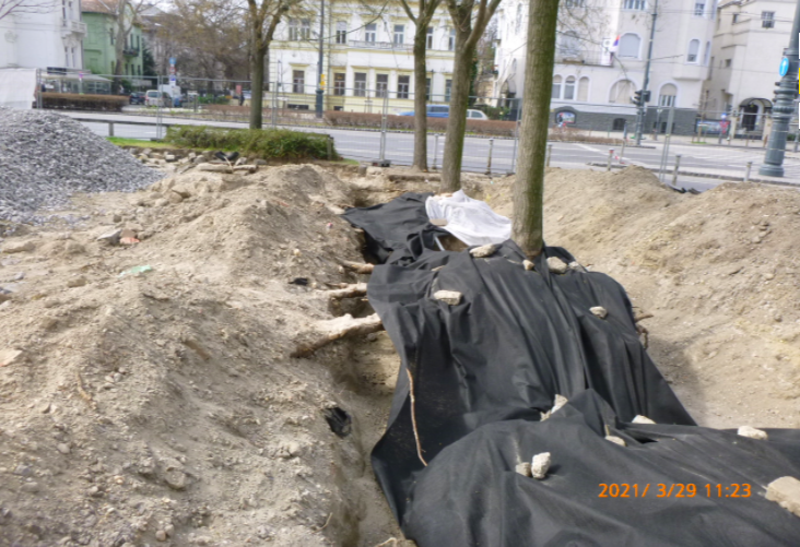 Ezután betondarálékkal kevert termőtalajjal töltötték fel 50 cm mélységig a fa környezetét, majd a fa köré gyökérterelő lemezt helyeztek el, végül pedig javított termőtalajjal töltötték fel a felületszivárgó és a fa közötti területet.