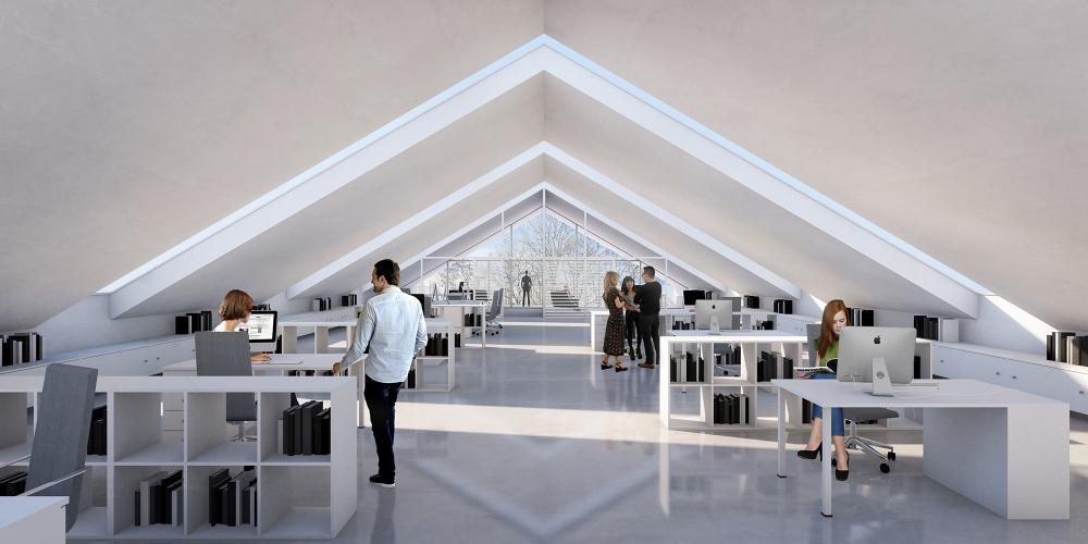 Tudásközpont. A város felőli megérkezés első arculati eleme. A transzparencia viszonylagos dolog, amelynek különböző fokozataival kísérletezünk a homlokzaton. Egy sávban megmutatjuk, mi történik belül: az első emeleti coworking tér teljesen átlátszó, a körülötte található terek részlegesen átlátszóak, helyenként csupán áttetszőek. A központ titkot rejt, ez különösen éjszaka érzékelhető: a benti fény kifelé sejtelmesen izzik, a két belső fegyverzet befelé vizuálisan teljesen nyitott.