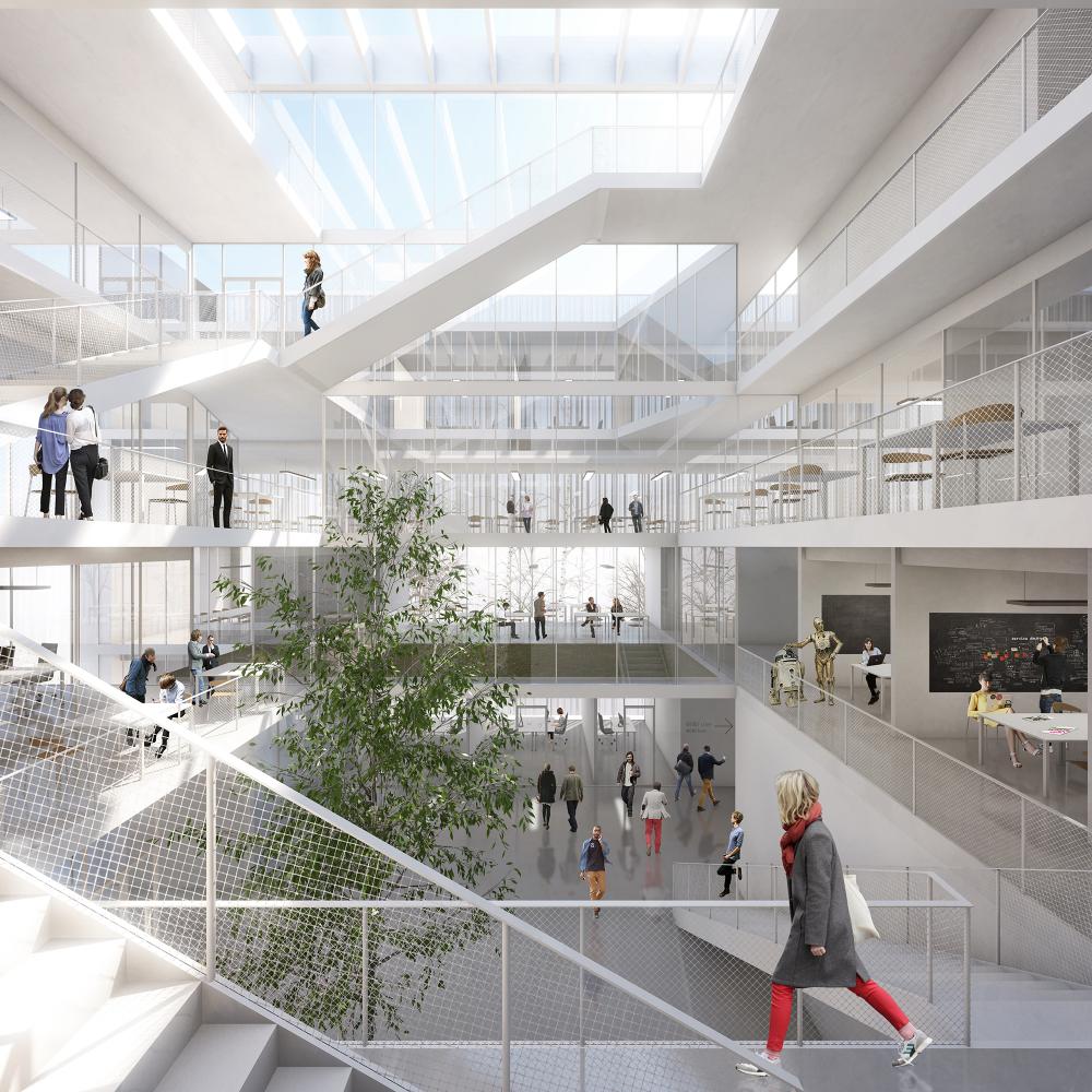 Az egyes épületek kialakítása különböző stratégiák mentén történt, hiszen az épületek helyzete és jellege (régi és újonnan tervezendő), valamint az akadémiai hierarchiában elfoglalt pozíciója más-más megközelítési módot tett szükségessé. Az átláthatóság és a nagyvonalú közösségi terek létrehozásának igénye hívta létre az épületegyüttes végein elhelyezett átriumokat: a tereken belüli függőleges kapcsolatok, az egyes használati egységek átlapolása növeli az egyes szakok közötti együttműködést.