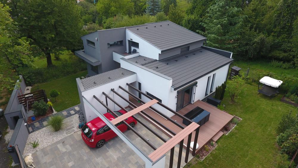 Ma már ott tartunk, hogy a beton akár kizárólagosan használt építőanyaga is lehet egy háznak, hiszen az alapozás, tartószerkezet, födém, külső és belső falak, burkolatok, de még a tető is készülhet belőle. Kedvelt tetőfedőanyag ugyanis a betoncserép, ami átlagosan 50 százalékkal nagyobb törőszilárdsággal rendelkezik, mint mondjuk az égetett agyag tetőcserepek. Ráadásul 7 decibellel jobban csillapítja a zajt más tetőfedőanyagokhoz képest, gyártása pedig energiahatékonyabb és 50%-kal kevesebb CO2 kibocsátással jár, mint más fedőanyagoké. Súlyuk ezzel szemben a kerámiacseréppel közel azonos.