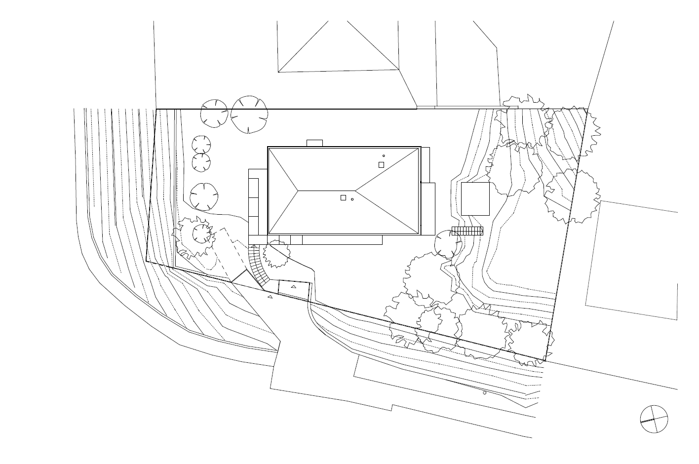 Mindenesetre gyalog egy tüneményesen elrejtett lépcsőn is felsétálhatunk a házhoz, míg autóval tenni kell egy közepes mértékű hurkot. És mint később kiderül, a feltevésünk nem járhat messze az igazságtól: a háromszintes épület középső szintje ugyanis iroda, a tulajdonos tehát dolgozhat otthonról, és jó eséllyel egy-egy frissítő sétát is tehet napközben. Az erősen meredek terep szinte készen kínálja a megoldást: alulra került az autóbeálló, felülre a lakás, persze a részleteket rejtő ördöghöz az építésznek is volt egy-két szava.