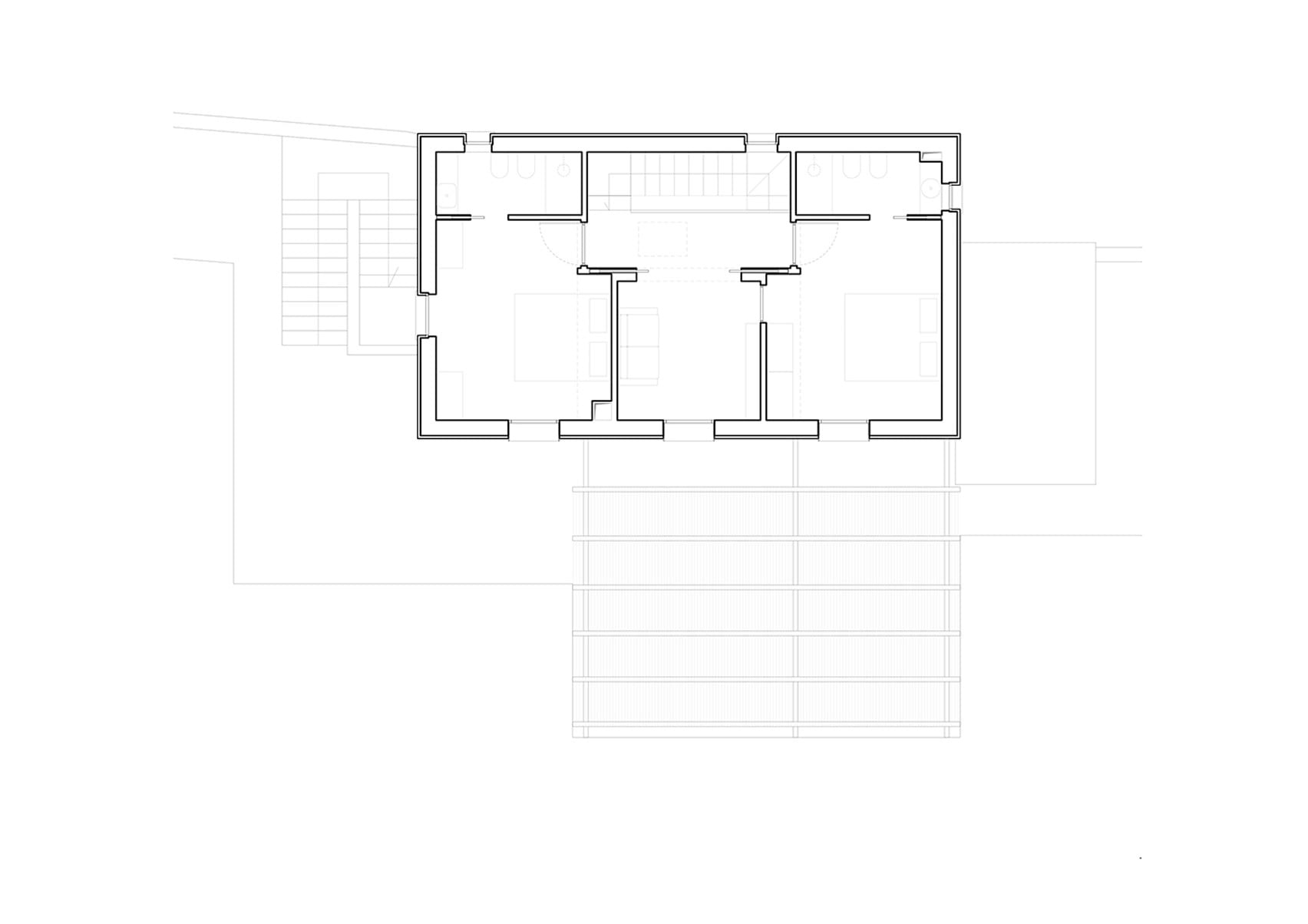 A ház burkolatát a mellette álló homokkőfal ihlette. Az északi homlokzat keskeny, magasra nyúló ablaka természetes fénnyel tölti meg a lépcsőházat. A nyugati oldalon két részre osztott, külső lépcsősort találunk: az alsó részt nyitott betonfokokkal, fém korláttal tervezték meg, míg a felső szakasz terrakotta burkolatú falazatot kapott. Ez utóbbi lépcső az egyik fürdőszobás, emeleti hálóhoz vezet, a másikat az épület közepén kialakított dolgozószoba túloldalára pozícionálták a tervezők. „Az emeleti helyiségek jól kihasználják a magas, gerendás tető előnyeit, ráadásul innen páratlan kilátás tárul elénk a közeli lagúna vizére is” – teszik hozzá az építészek.