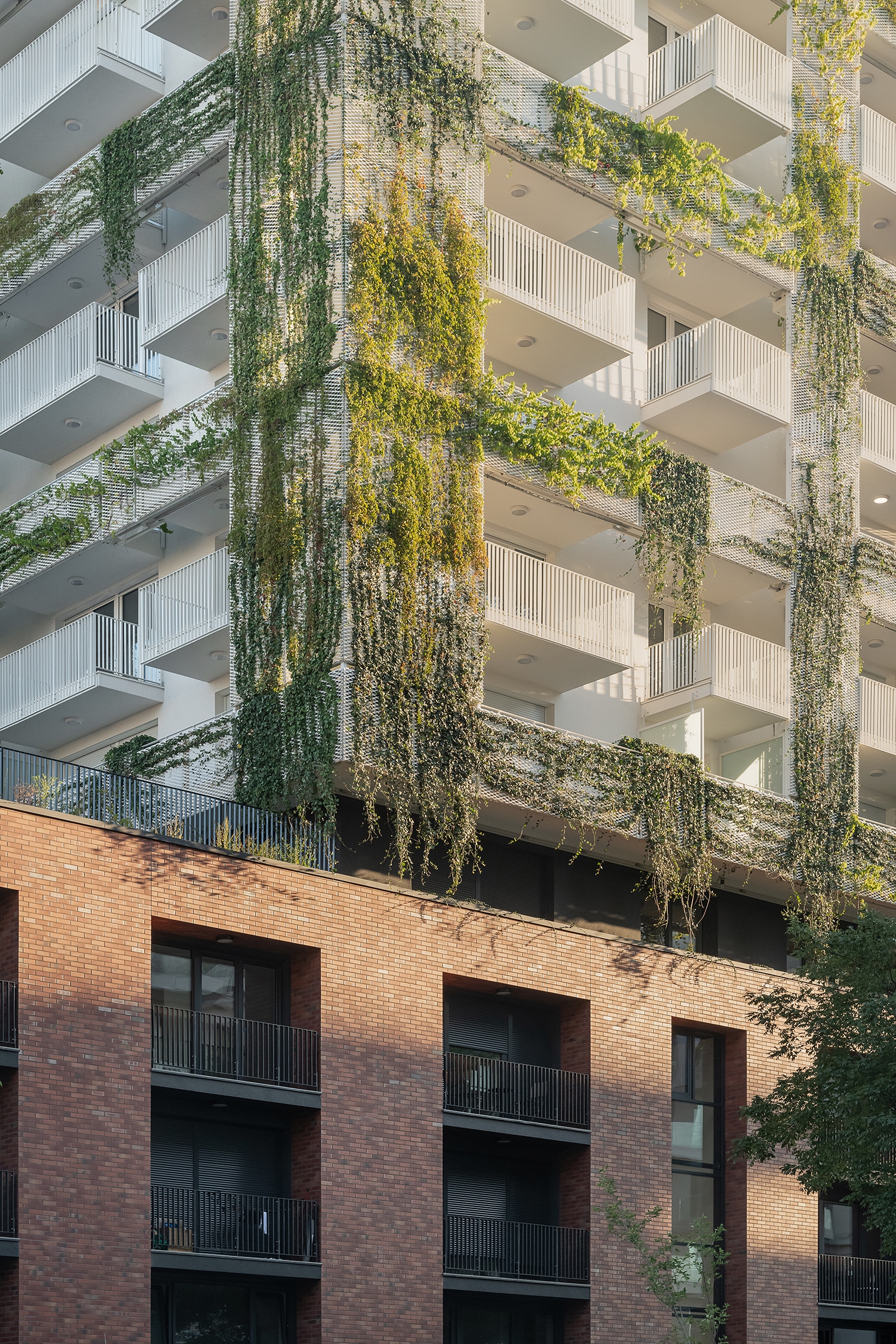 A borostyán, vadszőlő és lonc alkotta borítás lényegében nem a homlokzaton, hanem az abból kilépő teraszok elé telepített acél tartószerkezeten nyugszik – abba rejtve a vályúkat és az öntözőcsatornákat –, így ezzel egyfajta mikroklíma alakul ki a lakások előterében, s így természetes módon segíti a lakók kellemes hőérzetét. Noha az épület nevében zöld, a homlokzat az évszakok váltásával különböző színekben pompázik, és élővé, sokarcúvá, izgalmassá válik.