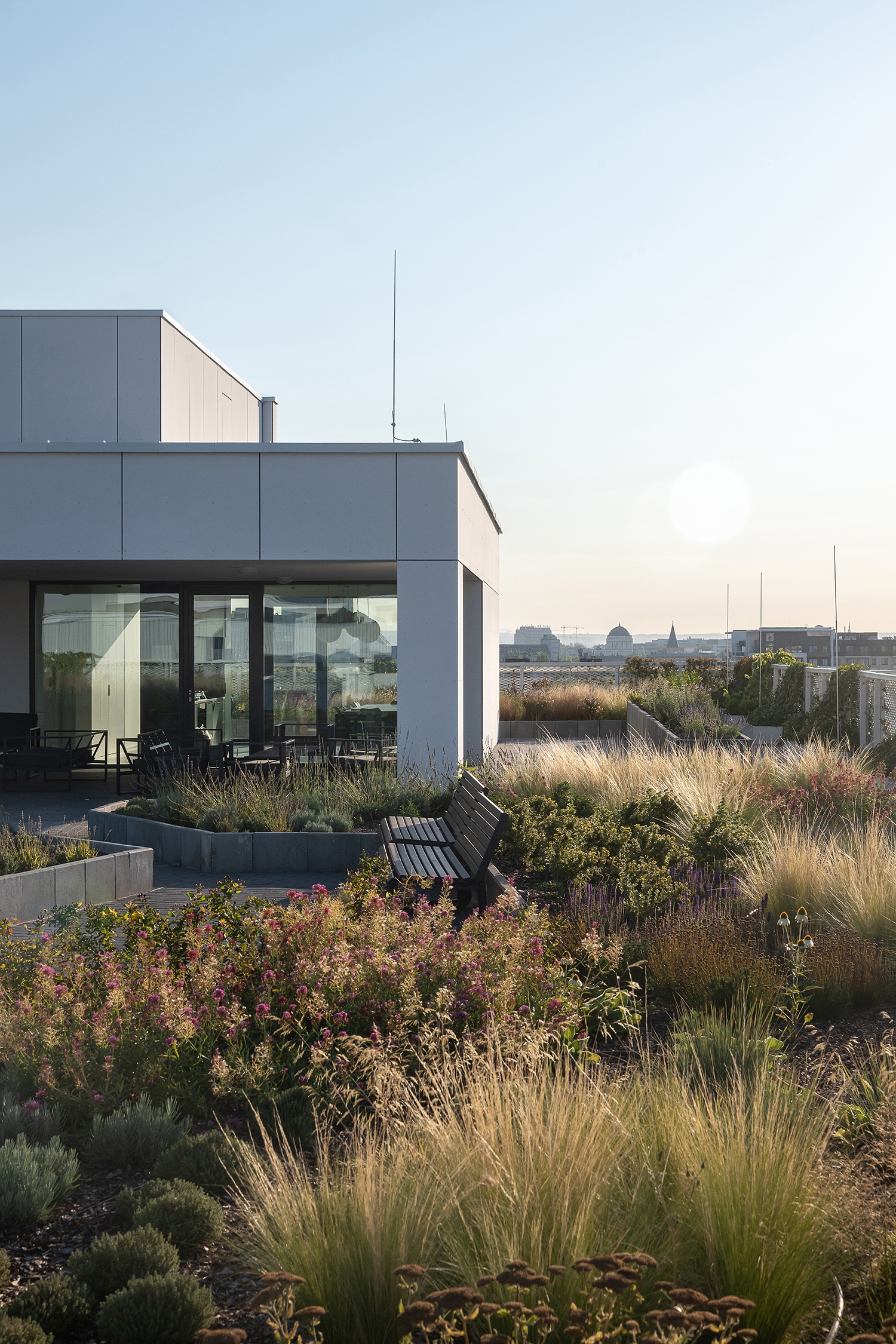 A közösségi szolgáltatások az egyik tömb tetején folytatódnak egy zárt közösségi konyhával és étkezővel, fedett terasszal, grillterasszal és a zöldtetőn lazán elhelyezett társalgó-szigetekkel. A közösségi terek ilyen kiemelt szerepe lehet egy nagyvonalú befektetői gesztus, jól működő marketingfogás, de kétségtelen, hogy ez, az itthon még kevésbé gyakorolt megközelítés Nyugat-Európában már jobban bejáratott, és érezhetően eredményesen működik. A lakóház nem csak privát teret biztosít a tulajdonosoknak, hanem lehetőséget kínál olyan esetekre, ha nem a lakásunkban kívánjuk fogadni vendégünket vagy tartani gyerekzsúrt. A 11. emeleti zöld tetőterasz pedig külön hangulatával vonzó társasági helyszínt kínál.