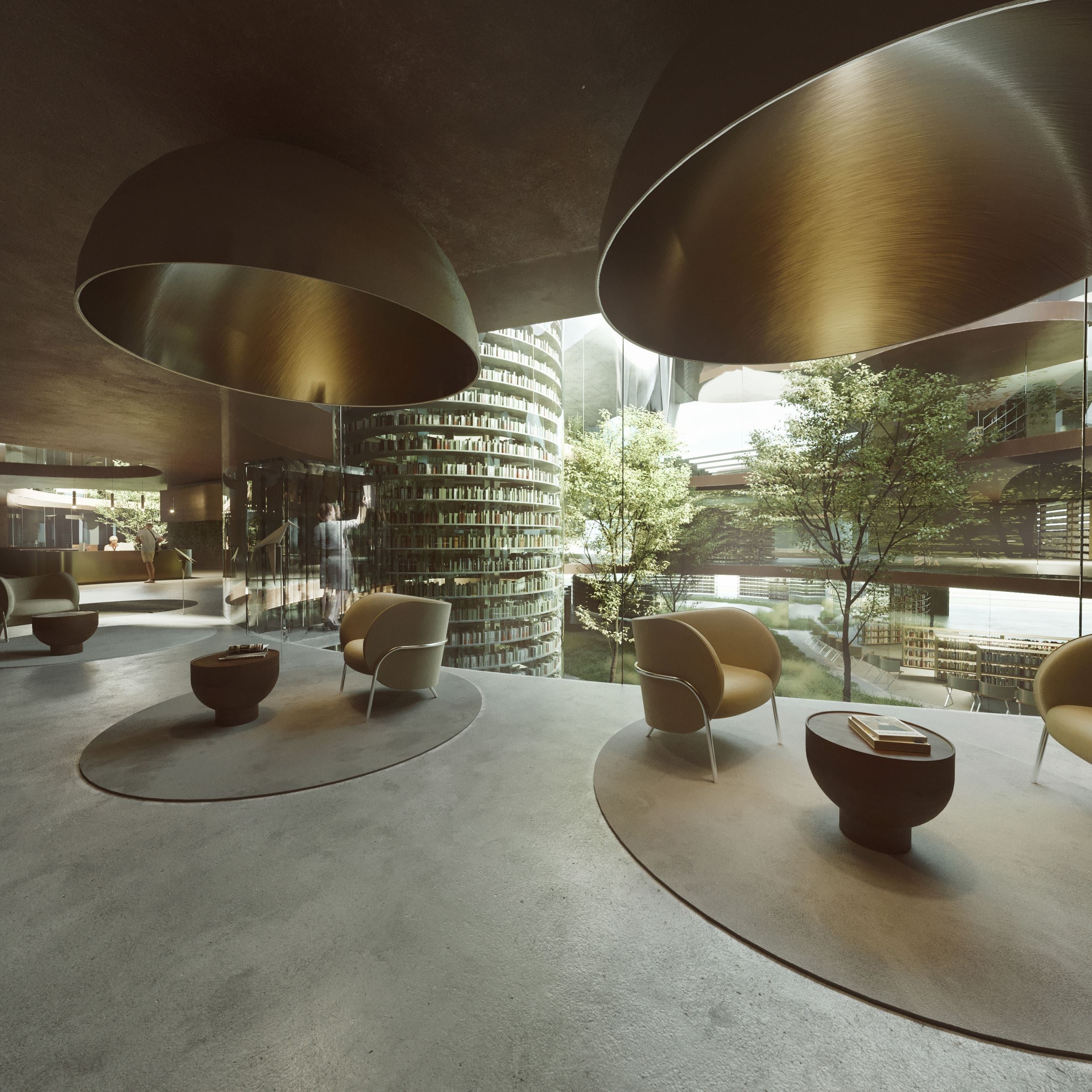 A projekt kapcsán kialakított természetes táj és az épület felső gyűrűjébe telepített virágzó kert a könyvtár építészeti jellegzetességei. „Ahogy a könyvek borítói is egy-egy történetet rejtenek, úgy A tudás fája könyvtár zöld környezete mögött is bárki számára elérhető ismeretanyag bújik meg” – fejtegeti a noa* network. A könyvtár, beleértve az erdőkkel és repülő könyvekkel tagolt tető szürreális atmoszféráját is, ideális feltételeket teremt az új tudás megszerzésére.