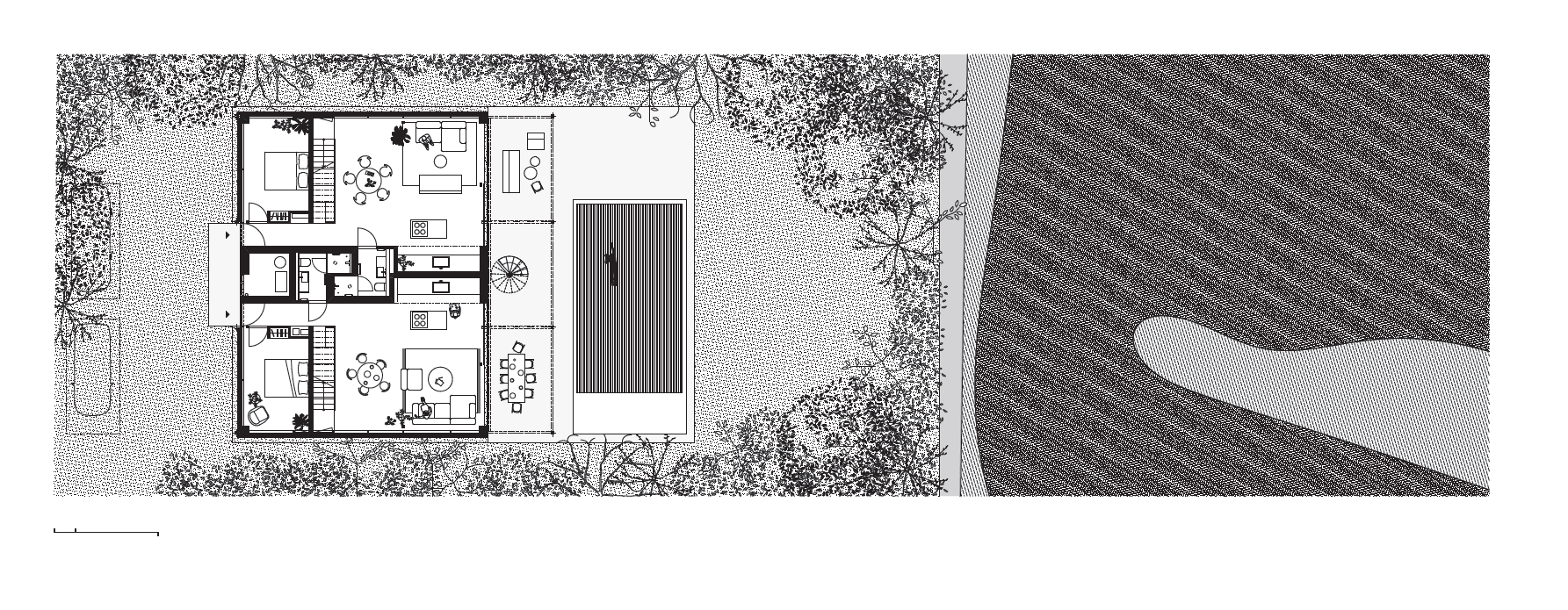 A nyaralóépítészet alapvető motívuma a római otium-villák óta a természet szépségeinek megtapasztalása, és a fizikai és szellemi kikapcsolódás helyeinek a városi terek alternatívájaként való megteremtése. Az építész stúdió Balatonszárszóra tervezett vízparti ikernyaralója a külső és belső terek összemosásával, racionális és nagyvonalú szerkesztésével a fenti célok példaszerű megoldását adja.