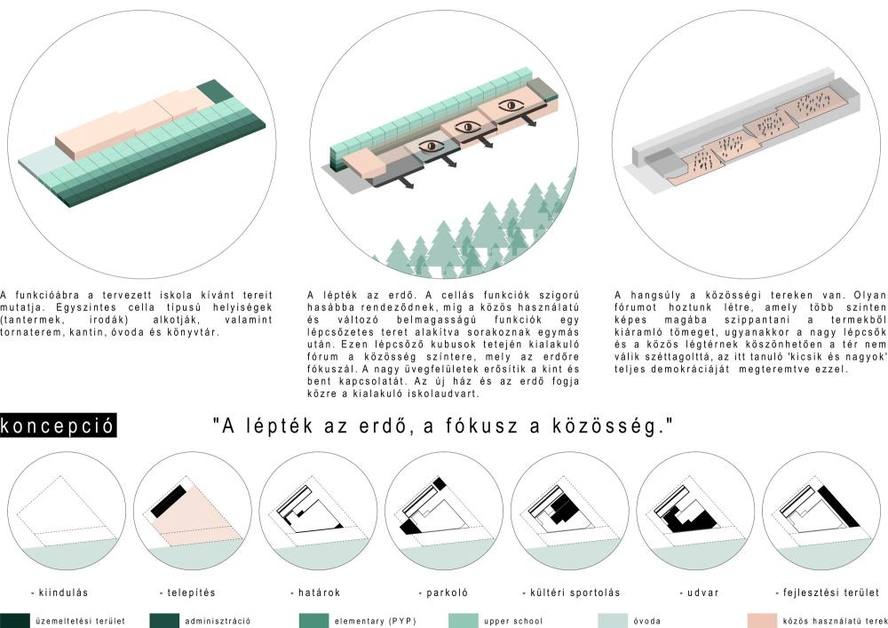 Ezen felismerés miatt célunk egy végletekig egységes, egyszerű, átlátható térstruktúra létrehozása úgy, hogy az hűen tükrözze és hordozza a benne foglalt intézmény milyenségét is. A tervezett ház fókusza az itt tanuló diákok közössége, amit az átlátható és jelentős méretű közösségi terek szerveznek majd a jövőben.