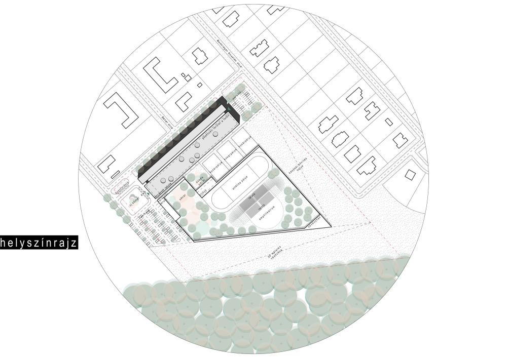 Az új iskola a telek északnyugati határával párhuzamosan telepített. Az épület és az erdő által közrezárt terület az iskolaudvar. Mivel egy intézményről van szó, a kissé elkülönülő funkciókat is egy tető alá hozzuk, így egy főbejárata, illetve egy mellékbejárata van az épületnek. A fő megközelítés a Bánat utca felől történik, elkerülve a családi házas övezet autókkal történő túlzsúfolását. A tornatermet úgy pozícionáltuk, hogy az az oktatási funkcióktól függetlenül, zavartalanul is működhessen. Ezt szolgálja az épület északkeleti végében található másik bejárat. A pedagógusok parkolói is ide pozícionáltak.