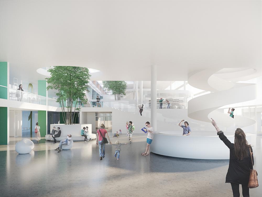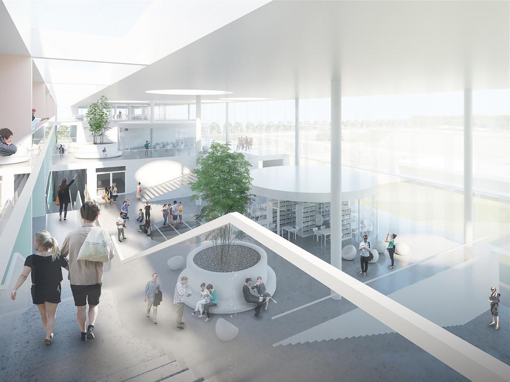Az új iskolaépületbe megálmodott funkciókat két részre bontottuk. A cellás, irodajellegű helyiségek, valamint a tantermek egy ötszintes hasáb alakú épületrészben sorakoznak egymás után, természetesen szem előtt tartva a különböző funkciócsoportokba való tartozást. A közös használatú terek, valamint a változó belmagasságokat igénylő funkciók egy lépcsőző teret kialakítva kerültek egymás mellé. Egy szint egy lépcső. Az egyszintes óvodarész teteje az 2. szint bővülete, a kétszintes kantin zárófödéme a 3. szint teresedését eredményezi, valamint ide kapcsolódik a bejárat feletti auditórium és előtere is. A háromszintes tornaterem teteje a 4. szint kiteresedése. A különböző szinteket lépcsősorok kapcsolják egymáshoz úgy, hogy az egy összefüggő térsort eredményezzen és mind a „kicsik”, mind a „nagyok” közösségi teréül szolgáljon. A hatalmas fórum közösséget formáló hatása került előtérbe. A hangsúlyos bejáraton való belépés után tárul fel ez a hatalmas és jól átlátható térsor, ahol véleményünk szerint könnyű az eligazodás.