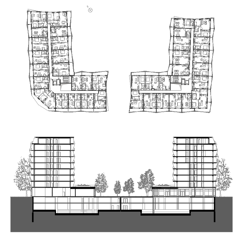 A Hartvig Lajos vezette team szerencsés módon egy egész tömb beépítésével foglalkozhatott, amelynek közvetlen szomszédsága ugyancsak vegyes. Átlósan szemközt az Angyalföldi Evangélikus templom Sándy Gyula által tervezett tornyos sziluettje, a belváros felőli oldalon egy újonnan kialakított közpark határolja, a szemközti oldalon viszont a Dózsa György út robogó forgalma a vívóteremmé avanzsált zsinagógával és egy épülő új irodaház színesen játékos homlokzatával. Harmadik szomszédja egy századfordulós, többszintes lakóépület nagy kerttel, íves-árkádos loggiákkal, némi népi beütéssel – vélhetően munkáslakásokat fogadott be valaha. A beépítést gyalogos sétányokkal tagolták különböző zónákra.
