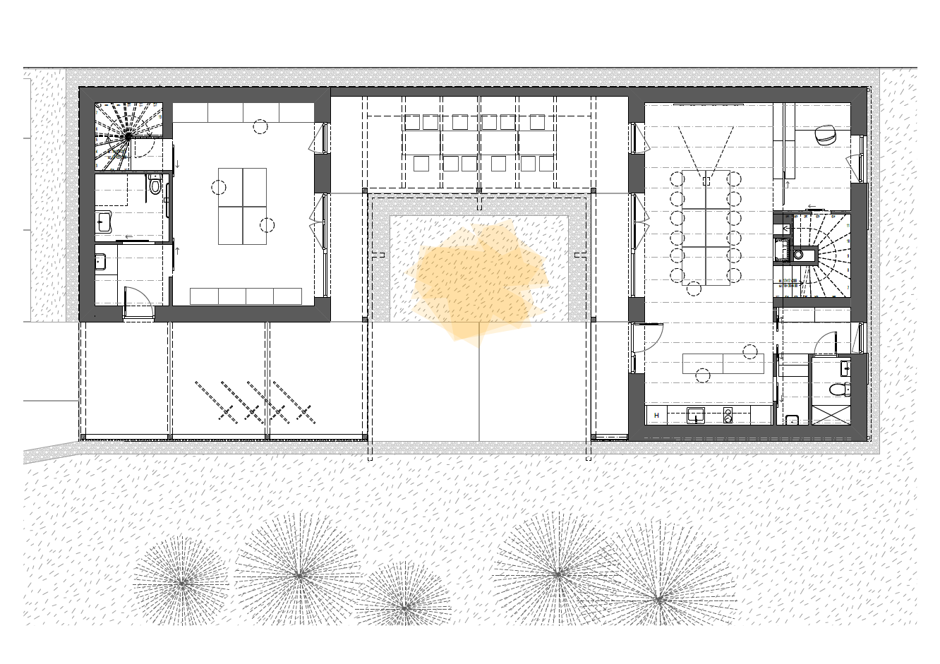 A telek hosszú, észak-déli irányú, régi osztásrend, logikája még mindig működik, a művelésre tervezett struktúra új rendet ad, nem kényszerből, hanem adottságból, a fény formál, a szőlő termett, a telepítés könnyen eldőlt, akik élnek, azok délnek mennek, akik dolgoznak, északnak, (parkoló)udvar, (műterem)ház, (átrium)udvar, (lakó)ház, (haszon)udvar, (mellék)ház, rétegek sora, egyszerű, mégis összetett, a házakban rend, az udvarokon lehetőség, amit a használat naponta rajzolhat újra, egyszerre határ és közép, helyük állandó, szerepük változó, a használat összetett, térbeli, időbeli megoszlása komplikált, tiszta koncepcióra vágyó elménknek; kerámiaműhely földszinten, építésziroda emeleten, workshop és gyermek alkotótábor beltéren, fedett térben, udvaron, vendéglátás konyhában, tornácon, nappaliban, veteményes a hátsó kertben, szerszámok és gépek a tárolóban, játék és játékok mindenhol, mindeközben, néha nyugodt élet két gyerekkel, de a megoldások nem bonyolultak, a műhely, a lakóház és a hátsó tárolóépület tetőformája, az udvarok és az épületek egymáshoz viszonyított arányai, a tornác mérete, az épületen belül a helyiségek elosztása mind-mind a fotonokhoz alkalmazkodik; bevilágítás, intimitás, áramszámla.