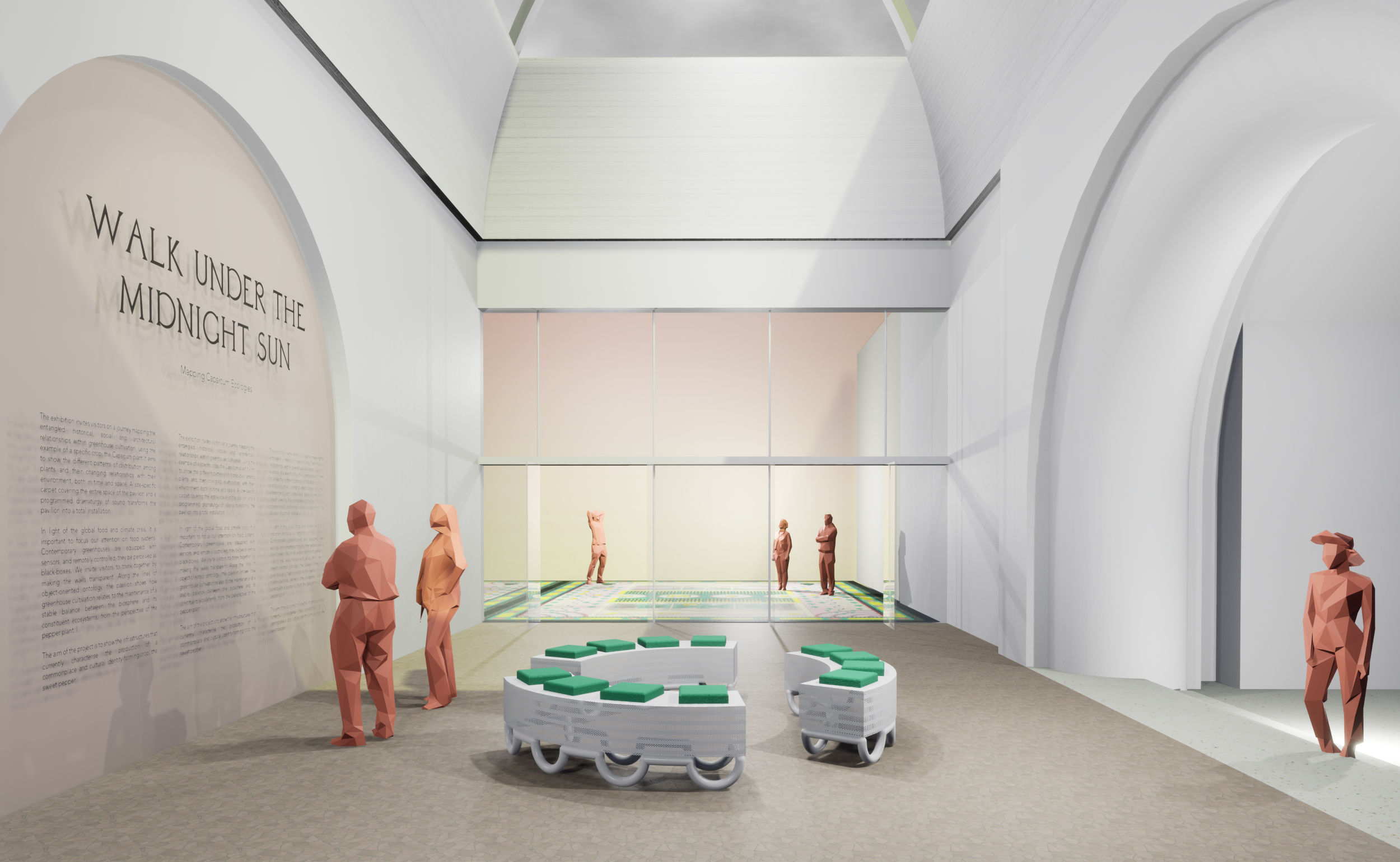A kiállítás két fő szálon fut: az absztrahált narratíva egyrészt a kiállítóteret egy nagyvonalú gesztussal totális installációvá alakító szőnyegen, valamint a térben hallható hangjátékon keresztül bontakozik ki. A falakon a címmel összhangban a fény útját színátmenetes falfestéssel jelezzük. A befogadó a pavilon belső udvarába belépve találkozhat a kiállítás alapvető információival – a pavilon koncepciójának rövid leírásával, a közreműködők listájával és más hasznos információkkal. Itt található a Fuzzy Earth által tervezett ülőbútor, amelyet az üvegházak belső berendezése ihletett, a párnák formáját és tapintását az a kőzetgyapot kocka inspirálta, amelyben a paprikapalánták nőnek.