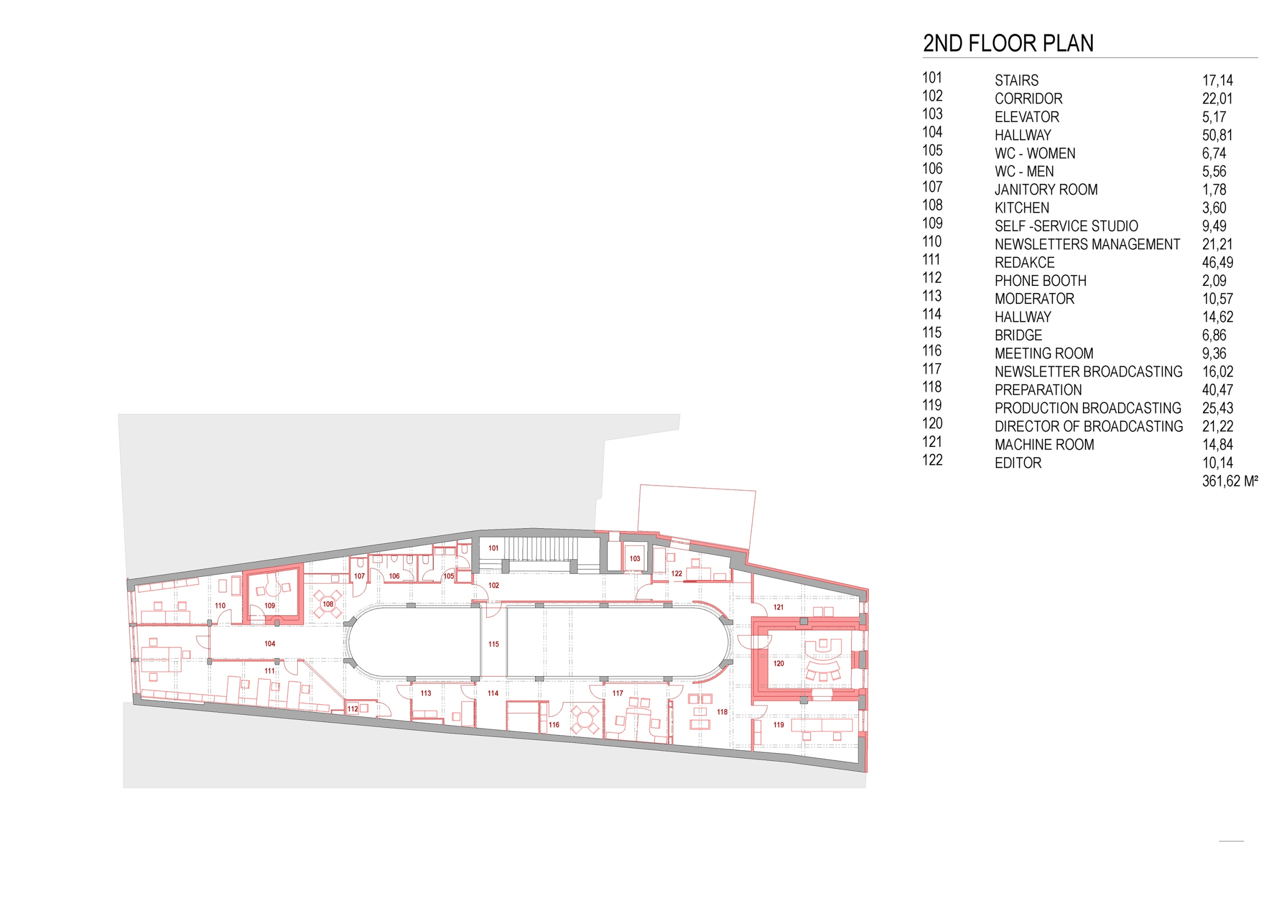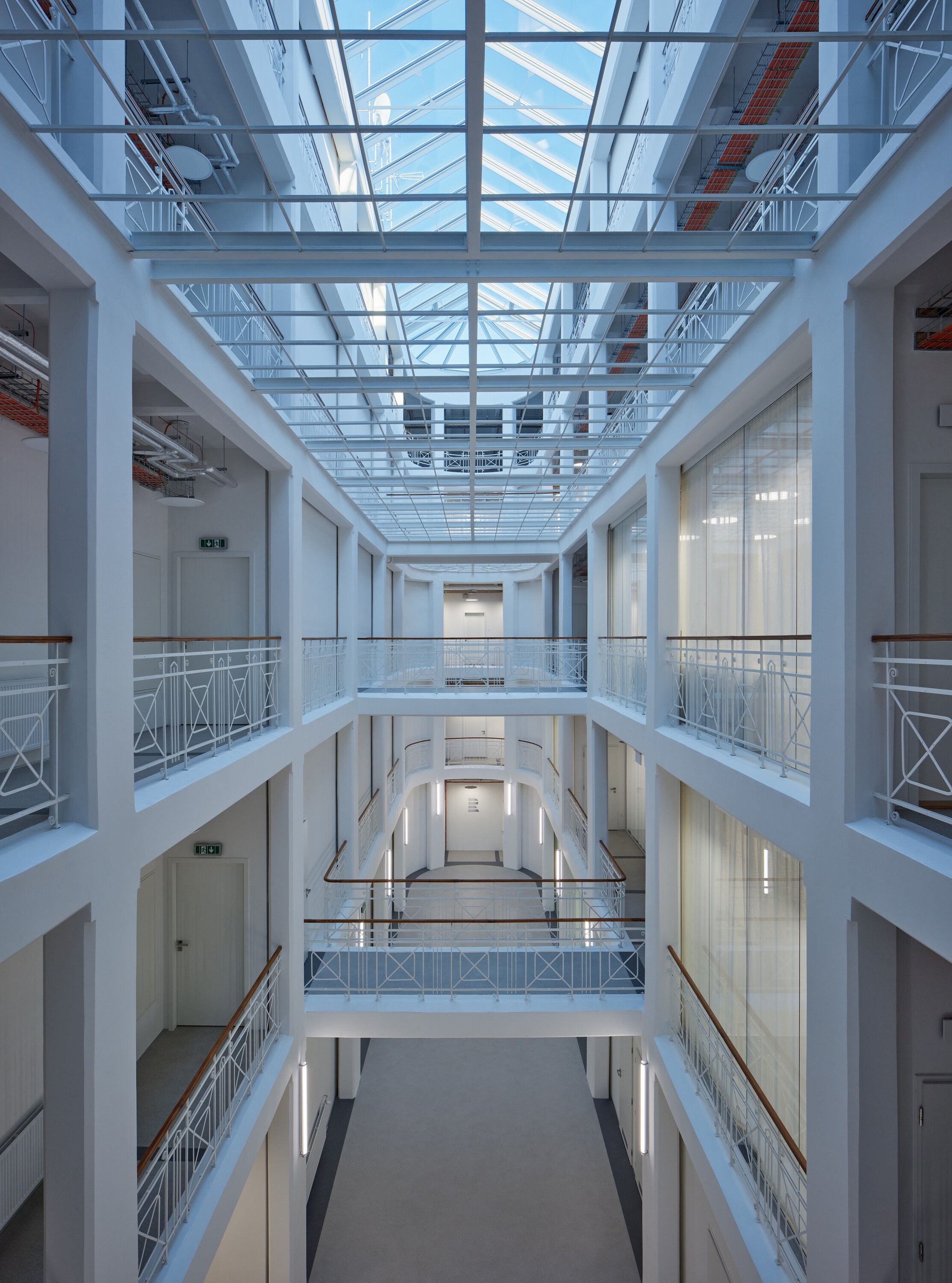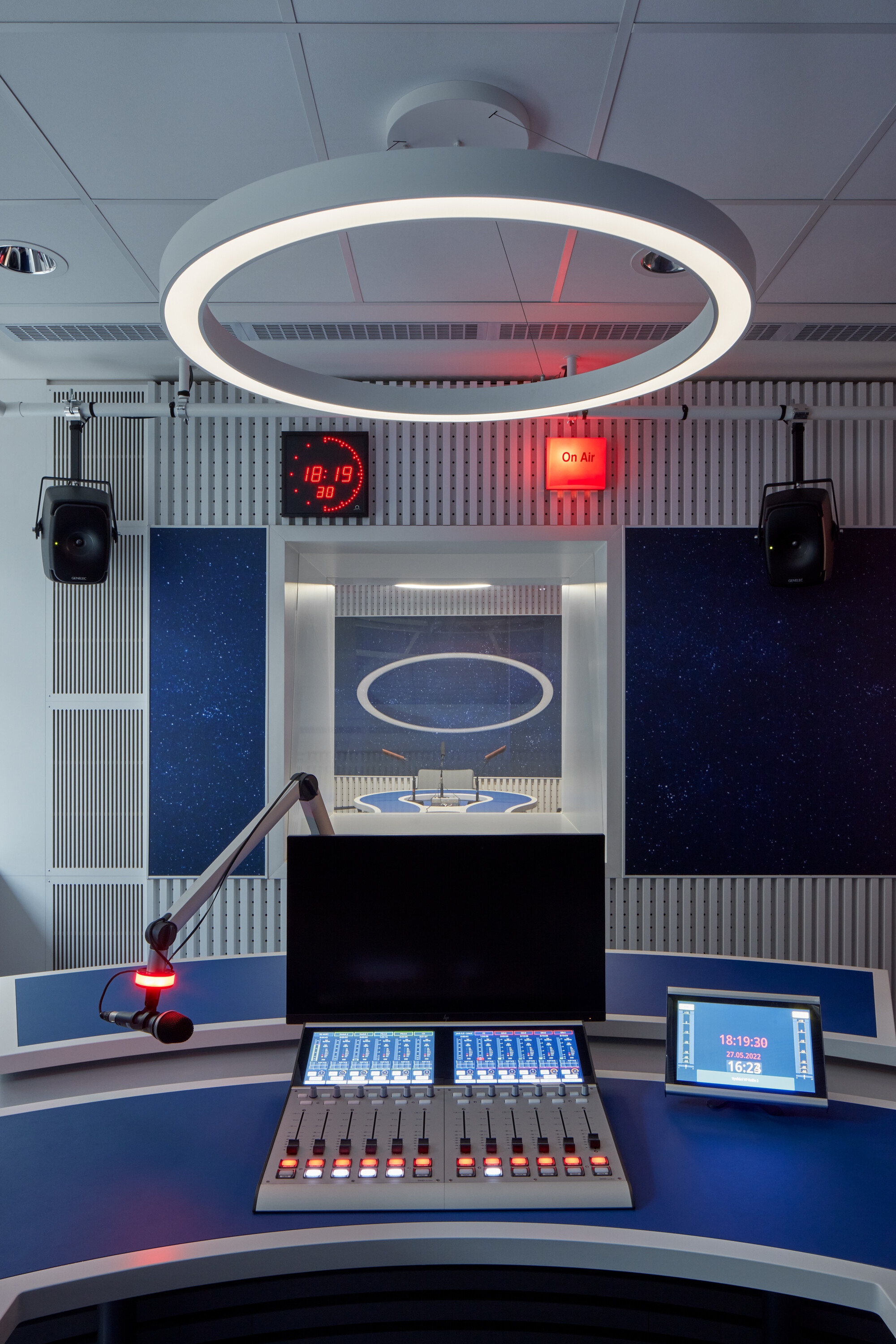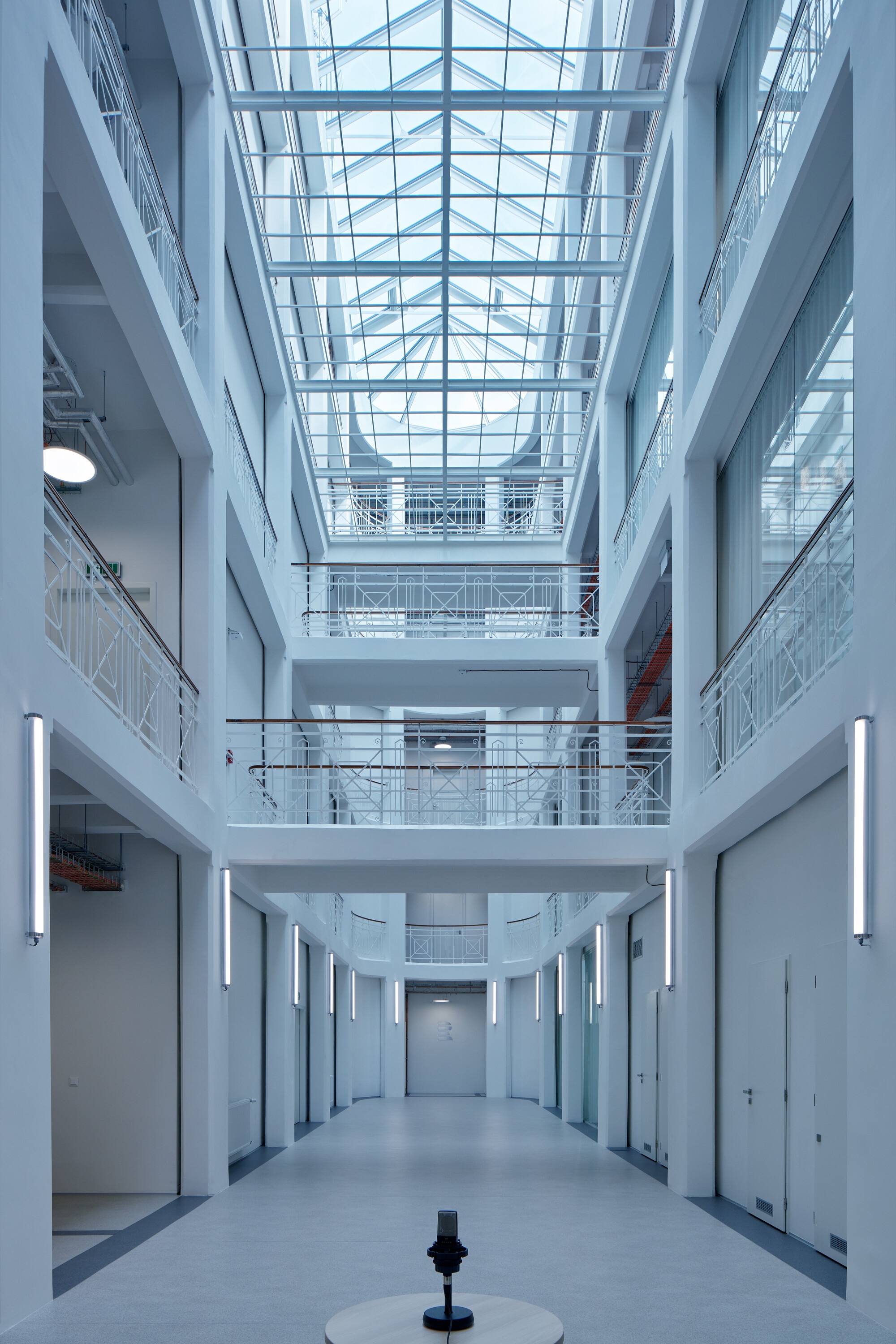 Az egész házban a fehér szín dominál, amely az üveg felülvilágítón keresztül az ég kékjével és sötétjével alkot erős kontrasztot. A végtelenbe nyíló tér utal a rádióhullámok szabad terjedésére. A funkció megkövetelte új helyiségek kialakítása az eredeti vázszerkezethez igazodik. Az eredeti tervet – az épület hátsó, az átrium mögötti szárnyának elbontását, és új, akusztikailag ideális alakú és méretű helyiségek építését – anyagi okokból elvetették.